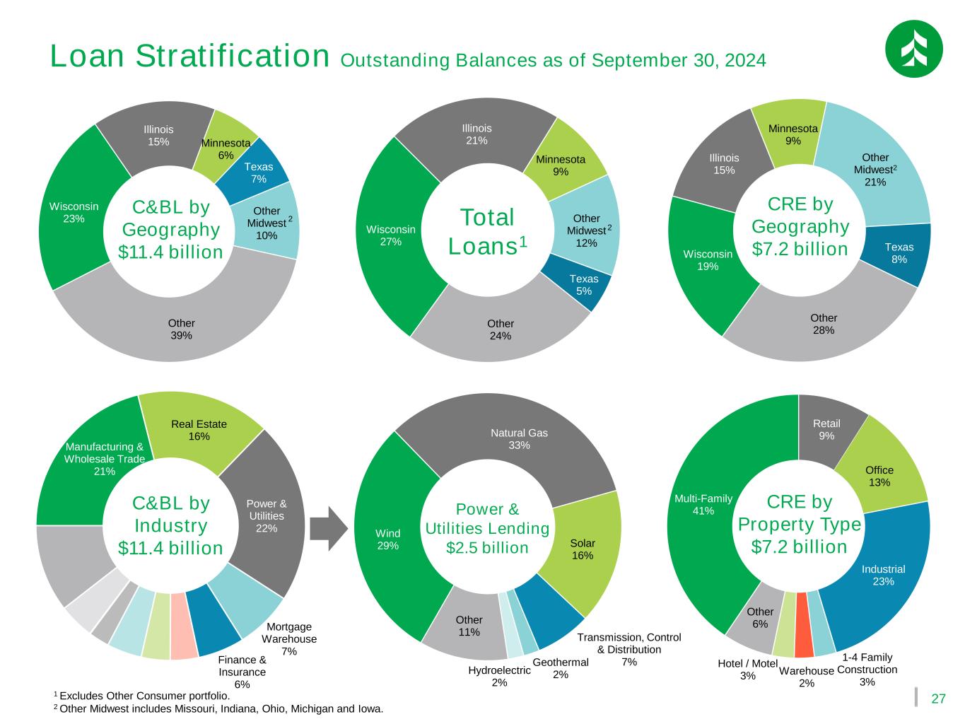 27 Multi-Family 41% Retail 9% Office 13% Industrial 23% 1-4 Family Construction 3% Warehouse 2% Hotel / Motel 3% Other 6% Wisconsin 27% Illinois 21% Minnesota 9% Other Midwest 12% Texas 5% Other 24% Manufacturing & Wholesale Trade 21% Real Estate 16% Power & Utilities 22% Mortgage Warehouse 7% Finance & Insurance 6% 1 Excludes Other Consumer portfolio. 2 Other Midwest includes Missouri, Indiana, Ohio, Michigan and Iowa. Wind 29% Natural Gas 33% Solar 16% Transmission, Control & Distribution 7%Geothermal 2%Hydroelectric 2% Other 11% Wisconsin 23% Illinois 15% Minnesota 6% Texas 7% Other Midwest 10% Other 39% Wisconsin 19% Illinois 15% Minnesota 9% Other Midwest2 21% Texas 8% Other 28% 2 2 Loan Stratification Outstanding Balances as of September 30, 2024 C&BL by Geography $11.4 billion Power & Utilities Lending $2.5 billion C&BL by Industry $11.4 billion Total Loans1 CRE by Geography $7.2 billion CRE by Property Type $7.2 billion