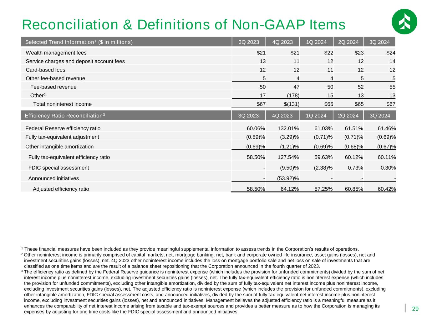 28 Reconciliation & Definitions of Non-GAAP Items 1 The ratio tangible common equity to tangible assets excludes goodwill and other intangible assets, net. This financial measure has been included as it is considered to be a critical metric with which to analyze and evaluate financial condition and capital strength. Period End Core Customer Deposits Reconciliation ($ in millions) 3Q 2023 4Q 2023 1Q 2024 2Q 2024 3Q 2024 Total deposits $32,123 $33,446 $33,713 $32,691 $33,554 Brokered CDs (3,351) (4,447) (3,931) (4,062) (4,243) Network transaction deposits (1,649) (1,566) (1,793) (1,503) (1,567) Core customer deposits $27,123 $27,432 $27,989 $27,127 $27,745 Tangible Common Equity and Tangible Assets Reconciliation1 ($ in millions) 3Q 2023 4Q 2023 1Q 2024 2Q 2024 3Q 2024 Common equity $3,934 $3,980 $3,975 $4,048 $4,219 Goodwill and other intangible assets, net (1,148) (1,145) (1,143) (1,141) (1,139) Tangible common equity $2,786 $2,834 $2,831 $2,907 $3,080 Total assets $41,637 $41,016 $41,137 $41,624 $42,211 Goodwill and other intangible assets, net (1,148) (1,145) (1,143) (1,141) (1,139) Tangible assets $40,490 $39,870 $39,994 $40,483 $41,072 Quarterly Average Core Customer Deposits Reconciliation ($ in millions) 3Q 2023 4Q 2023 1Q 2024 2Q 2024 3Q 2024 Total deposits $32,002 $32,192 $33,267 $32,629 $33,321 Brokered CDs (3,429) (3,471) (4,269) (3,928) (4,248) Network transaction deposits (1,640) (1,617) (1,652) (1,595) (1,644) Core customer deposits $26,933 $27,105 $27,346 $27,106 $27,429 Common Equity Tier 1 Capital Ratio Reconciliation 3Q 2023 4Q 2023 1Q 2024 2Q 2024 3Q 2024 Common equity Tier 1 capital ratio 9.55% 9.39% 9.43% 9.68% 9.72% Accumulated other comprehensive loss adjustment (1.01)% (0.52)% (0.64)% (0.67)% (0.34)% Common equity Tier 1 capital ratio including accumulated other comprehensive loss 8.53% 8.87% 8.79% 9.01% 9.38%
