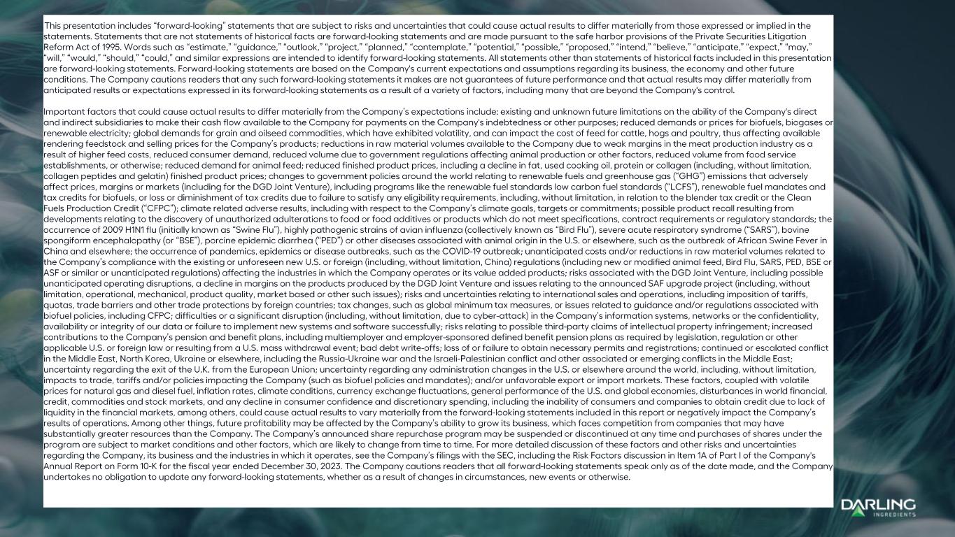 occurrence of pandemics, epidemics or disease outbreaks, such as the COVID-19 outbreak; unanticipated costs and/or reductions in raw material volumes related to the Company’s compliance with the existing or unforeseen new U.S. or foreign (including, without limitation, China) regulations (including new or modified animal feed, Bird Flu, SARS, PED, BSE or ASF or similar or unanticipated regulations) affecting the industries in which the Company operates or its value added products; risks associated with the DGD Joint Venture, including possible unanticipated operating disruptions, a decline in margins on the products produced by the DGD Joint Venture and issues relating to the announced SAF upgrade project (including, without limitation, operational, mechanical, product quality, market based or other such issues); risks and uncertainties relating to international sales and operations, including imposition of tariffs, quotas, trade barriers and other trade protections by foreign countries; tax changes, such as global minimum tax measures, or issues related to guidance and/or regulations associated with biofuel policies, including CFPC; difficulties or a significant disruption (including, without limitation, due to cyber-attack) in the Company’s information systems, networks or the confidentiality, availability or integrity of our data or failure to implement new systems and software successfully; risks relating to possible third-party claims of intellectual property infringement; increased contributions to the Company’s pension and benefit plans, including multiemployer and employer-sponsored defined benefit pension plans as required by legislation, regulation or other applicable U.S. or foreign law or resulting from a U.S. mass withdrawal event; bad debt write-offs; loss of or failure to obtain necessary permits and registrations; continued or escalated conflict in the Middle East, North Korea, Ukraine or elsewhere, including the Russia-Ukraine war and the Israeli-Palestinian conflict and other associated or emerging conflicts in the Middle East; uncertainty regarding the exit of the U.K. from the European Union; uncertainty regarding any administration changes in the U.S. or elsewhere around the world, including, without limitation, impacts to trade, tariffs and/or policies impacting the Company (such as biofuel policies and mandates); and/or unfavorable export or import markets. These factors, coupled with volatile prices for natural gas and diesel fuel, inflation rates, climate conditions, currency exchange fluctuations, general performance of the U.S. and global economies, disturbances in world financial, credit, commodities and stock markets, and any decline in consumer confidence and discretionary spending, including the inability of consumers and companies to obtain credit due to lack of liquidity in the financial markets, among others, could cause actual results to vary materially from the forward-looking statements included in this report or negatively impact the Company’s results of operations. Among other things, future profitability may be affected by the Company’s ability to grow its business, which faces competition from companies that may have substantially greater resources than the Company. The Company’s announced share repurchase program may be suspended or discontinued at any time and purchases of shares under the program are subject to market conditions and other factors, which are likely to change from time to time. For more detailed discussion of these factors and other risks and uncertainties regarding the Company, its business and the industries in which it operates, see the Company’s filings with the SEC, including the Risk Factors discussion in Item 1A of Part I of the Company's Annual Report on Form 10-K for the fiscal year ended December 30, 2023. The Company cautions readers that all forward-looking statements speak only as of the date made, and the Company undertakes no obligation to update any forward-looking statements, whether as a result of changes in circumstances, new events or otherwise.