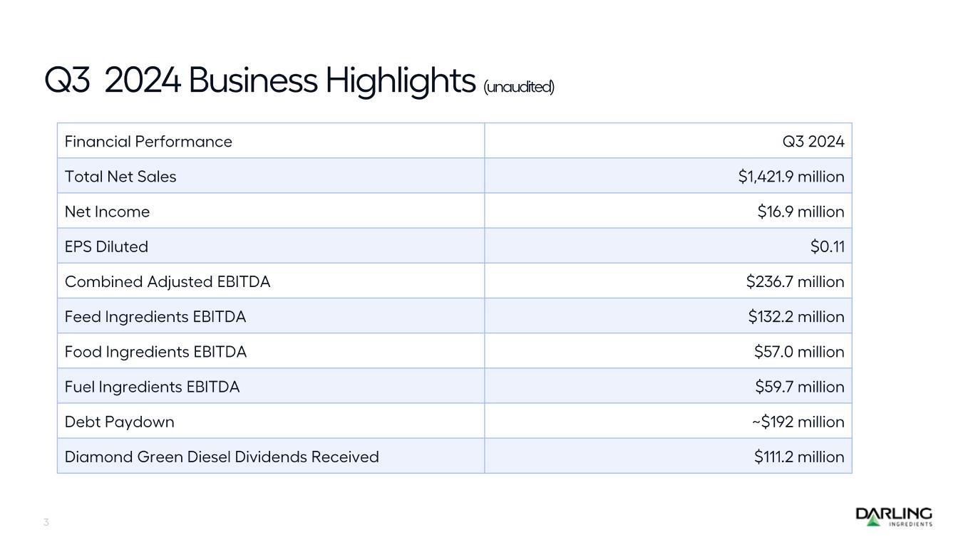 “During the third quarter, Darling Ingredients continued to navigate challenging markets. Even with these headwinds, our core ingredients cash flows and dividends from DGD allowed us to reduce debt by about $192 million,” said Randall C. Stuewe, Chairman and Chief Executive Officer. “The environment for 2025 is shaping up nicely. Our sustainable aviation fuel plant is in the process of commissioning, the evolving regulatory landscape is increasingly supportive of the use of waste fats and oils as feedstocks in renewable fuels, paving the way for greater growth and improved margins.”