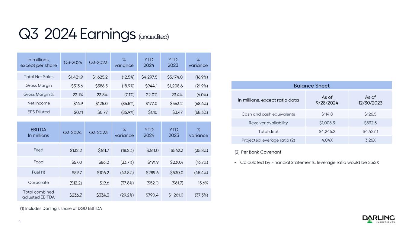 As of September 28, 2024, Darling Ingredients had $114.8 million in cash and cash equivalents, and $1.0 billion available under its committed revolving credit agreement. Total debt outstanding as of September 28, 2024, was $4.25 billion. The projected leverage ratio as measured by the company’s bank covenant was 4.04x as of September 28, 2024. Capital expenditures were $67.4 million for the third quarter 2024, and $259.1 million for the first nine months ended September 28, 2024.