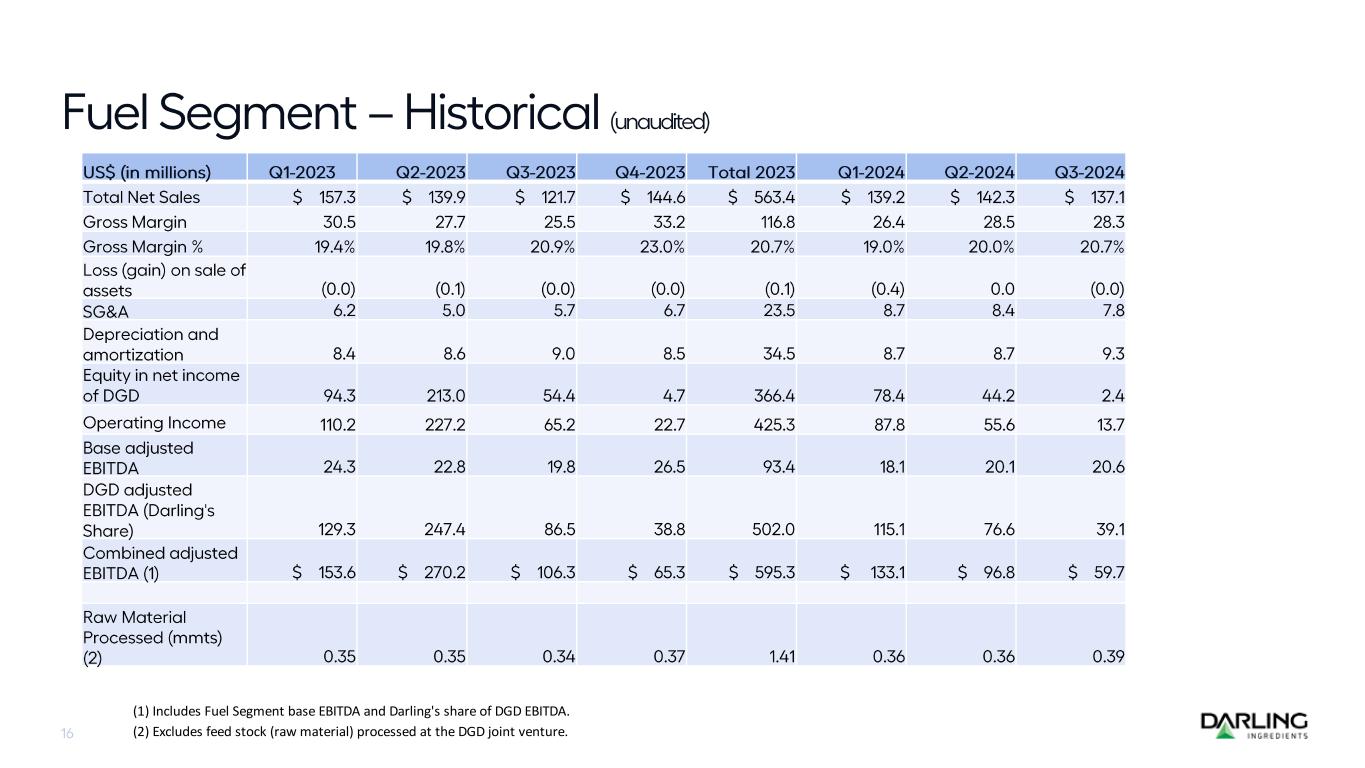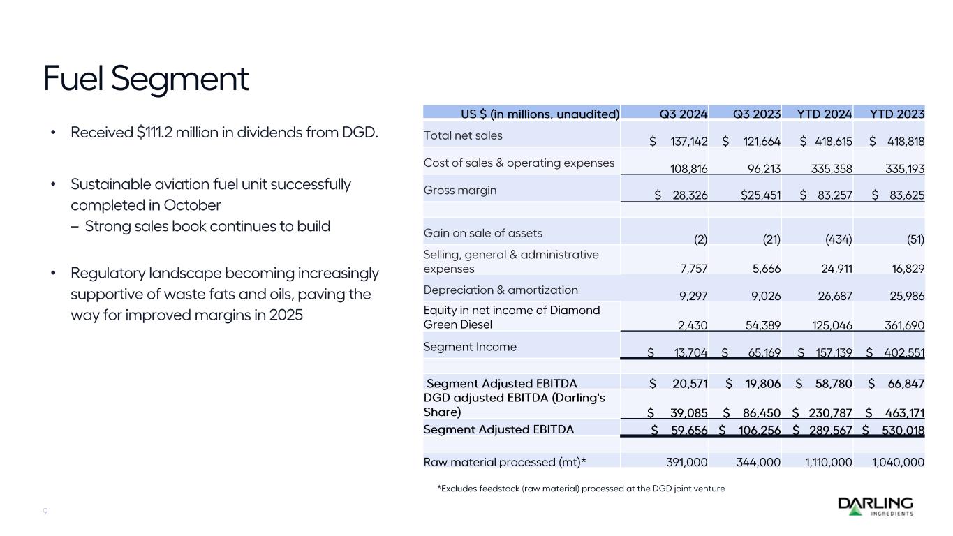 DGD sold 316.6 million gallons of renewable diesel for the third quarter 2024 at an average of $0.25 per gallon EBITDA. Darling Ingredients received $111.2 million cash dividends from Diamond Green Diesel during the third quarter of 2024. Year-to-date 2024, DGD has sold 959.5 million gallons at an average of $0.48 per gallon EBITDA.