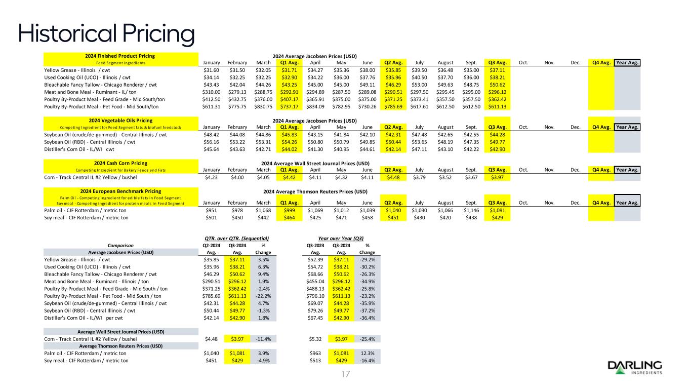 2024 Finished Product Pricing Feed Segment Ingredients January February March Q1 Avg. April May June Q2 Avg. July August Sept. Q3 Avg. Oct. Nov. Dec. Q4 Avg. Year Avg. Yellow Grease - Illinois / cwt $31.60 $31.50 $32.05 $31.71 $34.27 $35.36 $38.00 $35.85 $39.50 $36.48 $35.00 $37.11 Used Cooking Oil (UCO) - Illinois / cwt $34.14 $32.25 $32.25 $32.90 $34.22 $36.00 $37.76 $35.96 $40.50 $37.70 $36.00 $38.21 Bleachable Fancy Tallow - Chicago Renderer / cwt $43.43 $42.04 $44.26 $43.25 $45.00 $45.00 $49.11 $46.29 $53.00 $49.63 $48.75 $50.62 Meat and Bone Meal - Ruminant - IL/ ton $310.00 $279.13 $288.75 $292.91 $294.89 $287.50 $289.08 $290.51 $297.50 $295.45 $295.00 $296.12 Poultry By-Product Meal - Feed Grade - Mid South/ton $412.50 $432.75 $376.00 $407.17 $365.91 $375.00 $375.00 $371.25 $373.41 $357.50 $357.50 $362.42 Poultry By-Product Meal - Pet Food - Mid South/ton $611.31 $775.75 $830.75 $737.17 $834.09 $782.95 $730.26 $785.69 $617.61 $612.50 $612.50 $611.13 2024 Vegetable Oils Pricing Competing Ingredient for Feed Segment fats & biofuel feedstock January February March Q1 Avg. April May June Q2 Avg. July August Sept. Q3 Avg. Oct. Nov. Dec. Q4 Avg. Year Avg. Soybean Oil (crude/de-gummed) - Central Illinois / cwt $48.42 $44.08 $44.86 $45.83 $43.15 $41.84 $42.10 $42.31 $47.48 $42.65 $42.55 $44.28 Soybean Oil (RBD) - Central Illinois / cwt $56.16 $53.22 $53.31 $54.26 $50.80 $50.79 $49.85 $50.44 $53.65 $48.19 $47.35 $49.77 Distiller's Corn Oil - IL/WI cwt $45.64 $43.63 $42.71 $44.02 $41.30 $40.95 $44.61 $42.14 $47.11 $43.10 $42.22 $42.90 2024 Cash Corn Pricing Competing Ingredient for Bakery Feeds and Fats January February March Q1 Avg. April May June Q2 Avg. July August Sept. Q3 Avg. Oct. Nov. Dec. Q4 Avg. Year Avg. Corn - Track Central IL #2 Yellow / bushel $4.23 $4.00 $4.05 $4.42 $4.11 $4.32 $4.11 $4.48 $3.79 $3.52 $3.67 $3.97 2024 European Benchmark Pricing Palm Oi l - Competing ingredient for edible fats in Food Segment Soy meal - Competing ingredient for protein meals in Feed Segment January February March Q1 Avg. April May June Q2 Avg. July August Sept. Q3 Avg. Oct. Nov. Dec. Q4 Avg. Year Avg. Palm oil - CIF Rotterdam / metric ton $951 $978 $1,068 $999 $1,069 $1,012 $1,039 $1,040 $1,030 $1,066 $1,146 $1,081 Soy meal - CIF Rotterdam / metric ton $501 $450 $442 $464 $425 $471 $458 $451 $430 $420 $438 $429 QTR. over QTR. (Sequential) Year over Year (Q3) Comparison Q2-2024 Q3-2024 % Q3-2023 Q3-2024 % Average Jacobsen Prices (USD) Avg. Avg. Change Avg. Avg. Change Yellow Grease - Illinois / cwt $35.85 $37.11 3.5% $52.39 $37.11 -29.2% Used Cooking Oil (UCO) - Illinois / cwt $35.96 $38.21 6.3% $54.72 $38.21 -30.2% Bleachable Fancy Tallow - Chicago Renderer / cwt $46.29 $50.62 9.4% $68.66 $50.62 -26.3% Meat and Bone Meal - Ruminant - Illinois / ton $290.51 $296.12 1.9% $455.04 $296.12 -34.9% Poultry By-Product Meal - Feed Grade - Mid South / ton $371.25 $362.42 -2.4% $488.13 $362.42 -25.8% Poultry By-Product Meal - Pet Food - Mid South / ton $785.69 $611.13 -22.2% $796.10 $611.13 -23.2% Soybean Oil (crude/de-gummed) - Central Illinois / cwt $42.31 $44.28 4.7% $69.07 $44.28 -35.9% Soybean Oil (RBD) - Central Illinois / cwt $50.44 $49.77 -1.3% $79.26 $49.77 -37.2% Distiller's Corn Oil - IL/WI per cwt $42.14 $42.90 1.8% $67.45 $42.90 -36.4% Average Wall Street Journal Prices (USD) Corn - Track Central IL #2 Yellow / bushel $4.48 $3.97 -11.4% $5.32 $3.97 -25.4% Average Thomson Reuters Prices (USD) Palm oil - CIF Rotterdam / metric ton $1,040 $1,081 3.9% $963 $1,081 12.3% Soy meal - CIF Rotterdam / metric ton $451 $429 -4.9% $513 $429 -16.4% 2024 Average Jacobsen Prices (USD) 2024 Average Jacobsen Prices (USD) 2024 Average Wall Street Journal Prices (USD) 2024 Average Thomson Reuters Prices (USD) 17