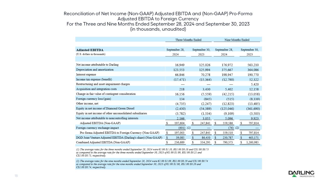 DGD Joint Venture Adjusted EBITDA (Darling's share) is not reflected in the Adjusted EBITDA or the Pro forma Adjusted EBITDA to Foreign Currency. DGD Joint Venture Adjusted EBITDA (Darling’s share) is not a recognized accounting measure under GAAP; it should not be considered as an alternative to net income or equity in net income of Diamond Green Diesel, as a measure of operating results, or as an alternative to cash flow as a measure of liquidity and is not intended to be a presentation in accordance with GAAP. The Company calculates DGD Joint Venture Adjusted EBITDA (Darling’s share) by taking DGD’s operating income plus DGD’s depreciation, amortization and accretion expense and then multiplying by 50% to get Darling’s share of DGD’s EBITDA. Management believes that DGD Joint Venture Adjusted EBITDA (Darling’s share) is useful in evaluating the Company's operating performance because the calculation of DGD Joint Venture Adjusted EBITDA (Darling’s share) generally eliminates non-cash and certain other items at DGD unrelated to overall operating performance and also believes this information is useful to investors.