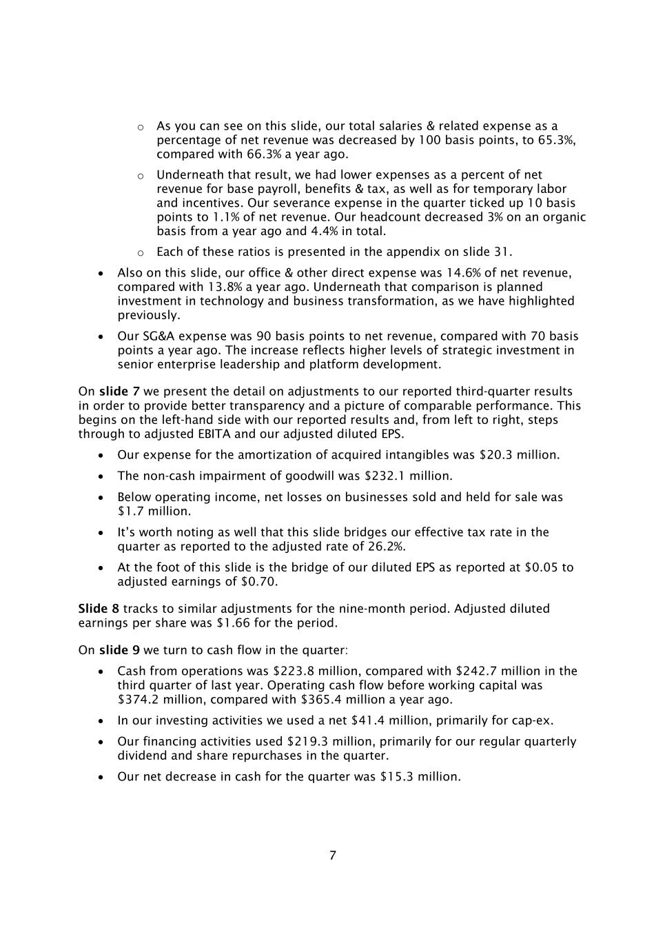 7 o As you can see on this slide, our total salaries & related expense as a percentage of net revenue was decreased by 100 basis points, to 65.3%, compared with 66.3% a year ago. o Underneath that result, we had lower expenses as a percent of net revenue for base payroll, benefits & tax, as well as for temporary labor and incentives. Our severance expense in the quarter ticked up 10 basis points to 1.1% of net revenue. Our headcount decreased 3% on an organic basis from a year ago and 4.4% in total. o Each of these ratios is presented in the appendix on slide 31. Also on this slide, our office & other direct expense was 14.6% of net revenue, compared with 13.8% a year ago. Underneath that comparison is planned investment in technology and business transformation, as we have highlighted previously. Our SG&A expense was 90 basis points to net revenue, compared with 70 basis points a year ago. The increase reflects higher levels of strategic investment in senior enterprise leadership and platform development. On slide 7 we present the detail on adjustments to our reported third-quarter results in order to provide better transparency and a picture of comparable performance. This begins on the left-hand side with our reported results and, from left to right, steps through to adjusted EBITA and our adjusted diluted EPS. Our expense for the amortization of acquired intangibles was $20.3 million. The non-cash impairment of goodwill was $232.1 million. Below operating income, net losses on businesses sold and held for sale was $1.7 million. It’s worth noting as well that this slide bridges our effective tax rate in the quarter as reported to the adjusted rate of 26.2%. At the foot of this slide is the bridge of our diluted EPS as reported at $0.05 to adjusted earnings of $0.70. Slide 8 tracks to similar adjustments for the nine-month period. Adjusted diluted earnings per share was $1.66 for the period. On slide 9 we turn to cash flow in the quarter: Cash from operations was $223.8 million, compared with $242.7 million in the third quarter of last year. Operating cash flow before working capital was $374.2 million, compared with $365.4 million a year ago. In our investing activities we used a net $41.4 million, primarily for cap-ex. Our financing activities used $219.3 million, primarily for our regular quarterly dividend and share repurchases in the quarter. Our net decrease in cash for the quarter was $15.3 million.