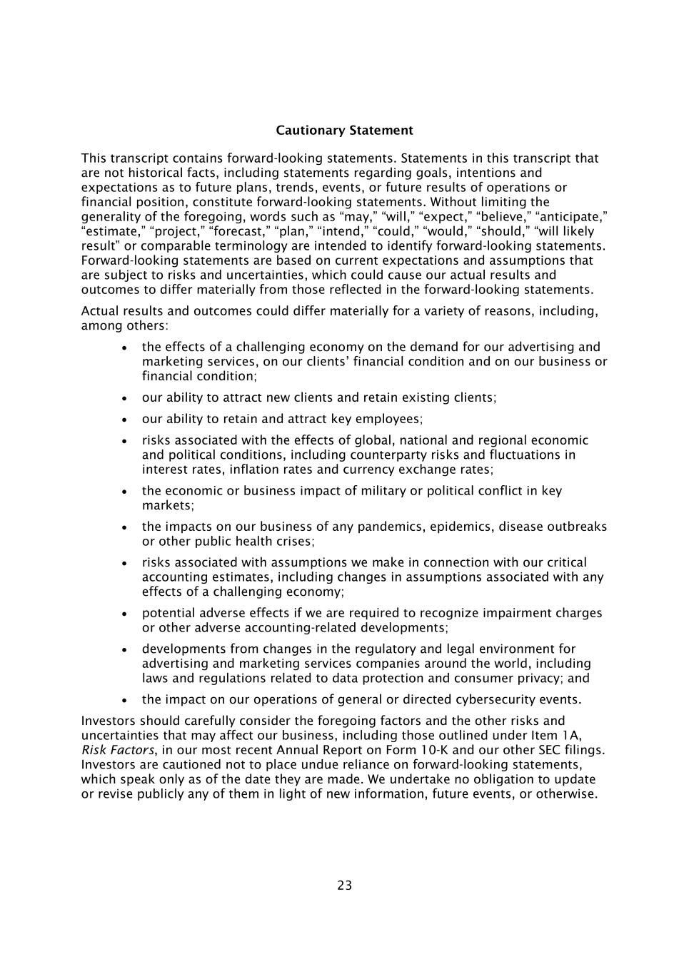 23 Cautionary Statement This transcript contains forward-looking statements. Statements in this transcript that are not historical facts, including statements regarding goals, intentions and expectations as to future plans, trends, events, or future results of operations or financial position, constitute forward-looking statements. Without limiting the generality of the foregoing, words such as “may,” “will,” “expect,” “believe,” “anticipate,” “estimate,” “project,” “forecast,” “plan,” “intend,” “could,” “would,” “should,” “will likely result” or comparable terminology are intended to identify forward-looking statements. Forward-looking statements are based on current expectations and assumptions that are subject to risks and uncertainties, which could cause our actual results and outcomes to differ materially from those reflected in the forward-looking statements. Actual results and outcomes could differ materially for a variety of reasons, including, among others: the effects of a challenging economy on the demand for our advertising and marketing services, on our clients’ financial condition and on our business or financial condition; our ability to attract new clients and retain existing clients; our ability to retain and attract key employees; risks associated with the effects of global, national and regional economic and political conditions, including counterparty risks and fluctuations in interest rates, inflation rates and currency exchange rates; the economic or business impact of military or political conflict in key markets; the impacts on our business of any pandemics, epidemics, disease outbreaks or other public health crises; risks associated with assumptions we make in connection with our critical accounting estimates, including changes in assumptions associated with any effects of a challenging economy; potential adverse effects if we are required to recognize impairment charges or other adverse accounting-related developments; developments from changes in the regulatory and legal environment for advertising and marketing services companies around the world, including laws and regulations related to data protection and consumer privacy; and the impact on our operations of general or directed cybersecurity events. Investors should carefully consider the foregoing factors and the other risks and uncertainties that may affect our business, including those outlined under Item 1A, Risk Factors, in our most recent Annual Report on Form 10-K and our other SEC filings. Investors are cautioned not to place undue reliance on forward-looking statements, which speak only as of the date they are made. We undertake no obligation to update or revise publicly any of them in light of new information, future events, or otherwise.