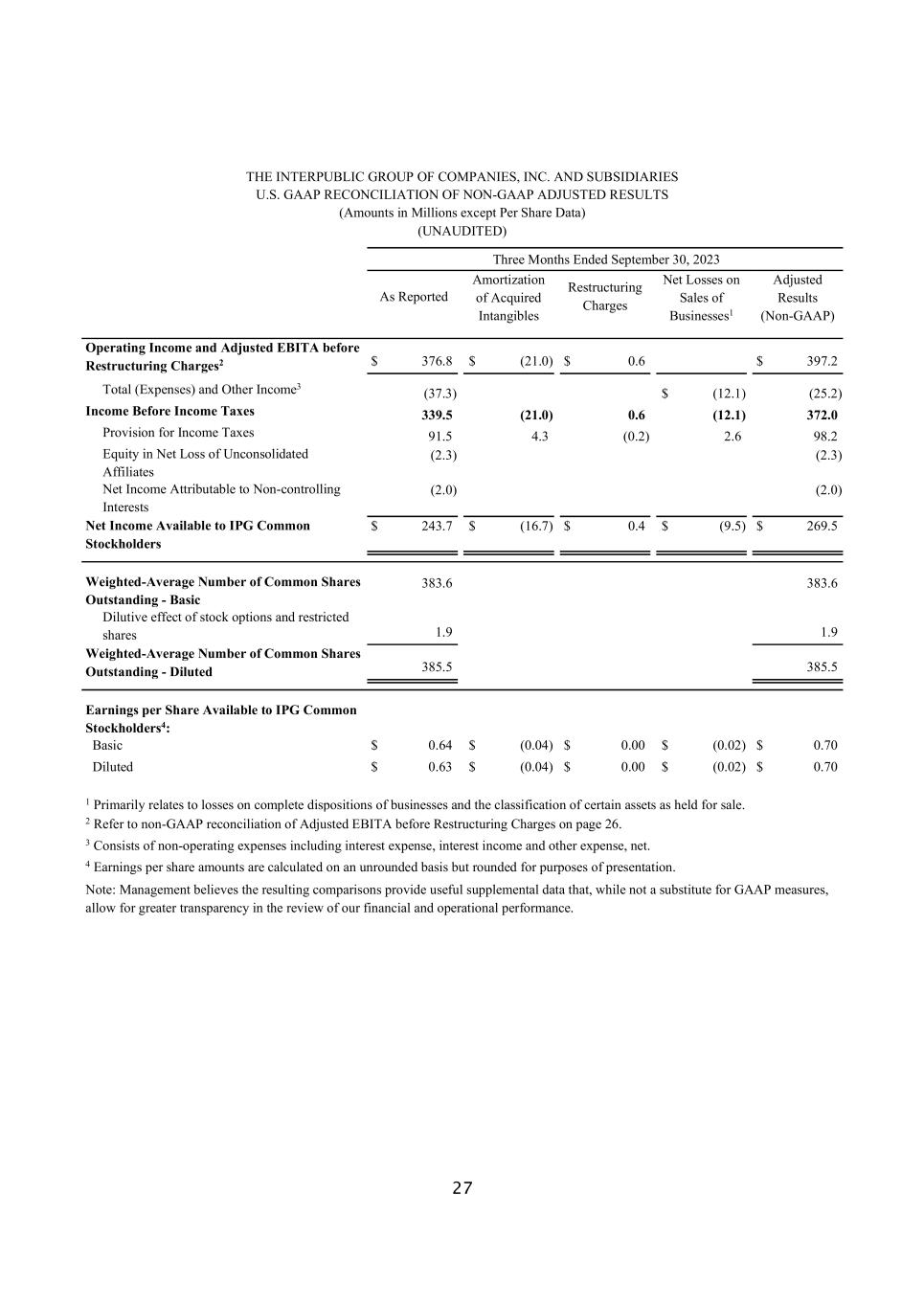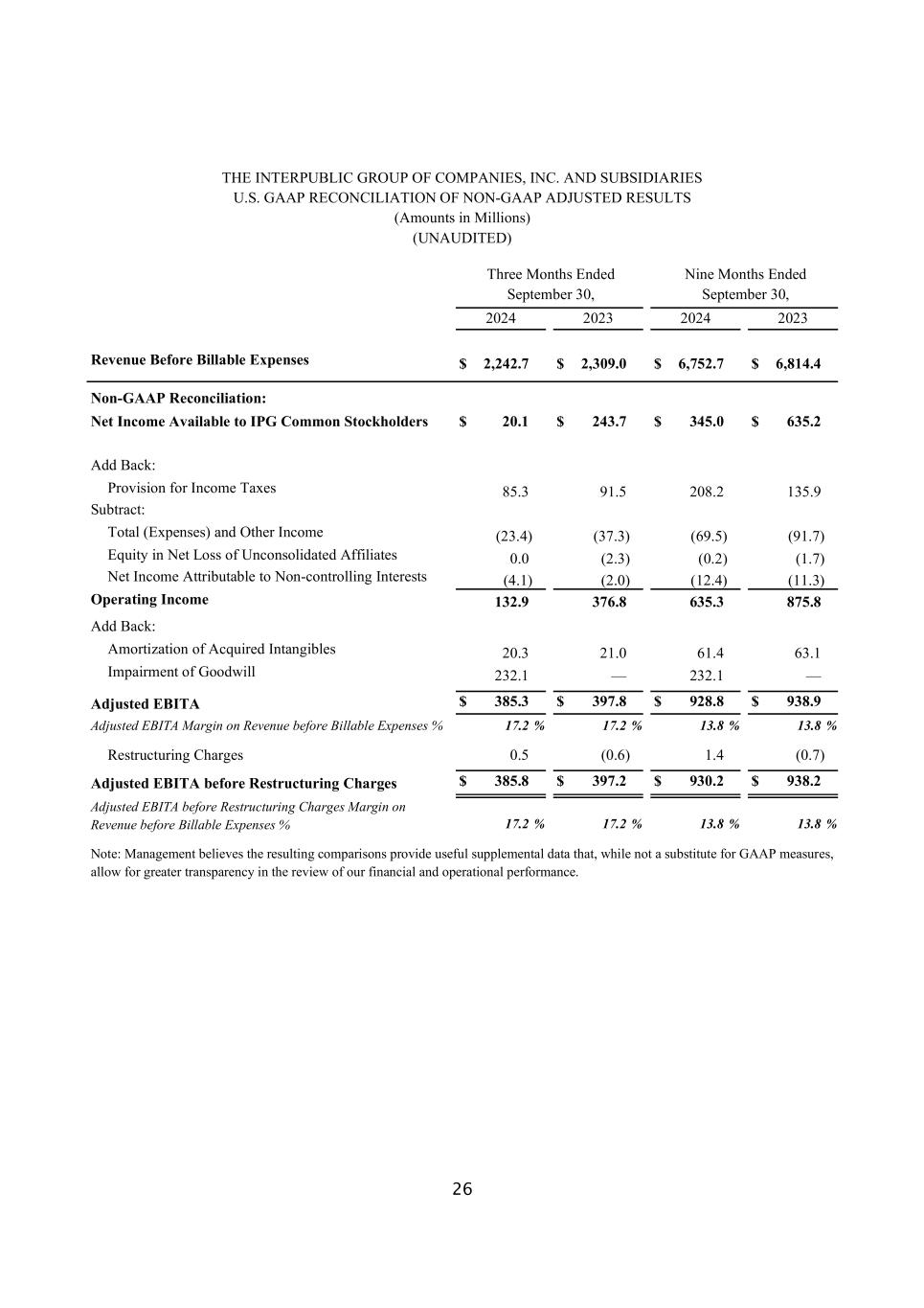 25 THE INTERPUBLIC GROUP OF COMPANIES, INC. AND SUBSIDIARIES U.S. GAAP RECONCILIATION OF NON-GAAP ADJUSTED RESULTS (Amounts in Millions except Per Share Data) (UNAUDITED) Nine Months Ended September 30, 2024 As Reported Amortization of Acquired Intangibles Impairment of Goodwill Restructuring Charges Net Losses on Sales of Businesses1 Adjusted Results (Non-GAAP) Operating Income and Adjusted EBITA before Restructuring Charges2 $ 635.3 $ (61.4) $ (232.1) $ (1.4) $ 930.2 Total (Expenses) and Other Income3 (69.5) $ (6.4) (63.1) Income Before Income Taxes 565.8 (61.4) (232.1) (1.4) (6.4) 867.1 Provision for Income Taxes 208.2 12.6 20.7 0.3 (16.5) 225.3 Equity in Net Loss of Unconsolidated Affiliates (0.2) (0.2) Net Income Attributable to Non-controlling Interests (12.4) (12.4) Net Income Available to IPG Common Stockholders $ 345.0 $ (48.8) $ (211.4) $ (1.1) $ (22.9) $ 629.2 Weighted-Average Number of Common Shares Outstanding - Basic 376.2 376.2 Dilutive effect of stock options and restricted shares 2.5 2.5 Weighted-Average Number of Common Shares Outstanding - Diluted 378.7 378.7 Earnings per Share Available to IPG Common Stockholders4: Basic $ 0.92 $ (0.13) $ (0.56) $ (0.00) $ (0.06) $ 1.67 Diluted $ 0.91 $ (0.13) $ (0.56) $ (0.00) $ (0.06) $ 1.66 1 Primarily relates to losses on complete dispositions of businesses and the classification of certain assets as held for sale. 2 Refer to non-GAAP reconciliation of Adjusted EBITA before Restructuring Charges on page 26. 3 Consists of non-operating expenses including interest expense, interest income and other expense, net. 4 Earnings per share amounts are calculated on an unrounded basis but rounded for purposes of presentation. Note: Management believes the resulting comparisons provide useful supplemental data that, while not a substitute for GAAP measures, allow for greater transparency in the review of our financial and operational performance.