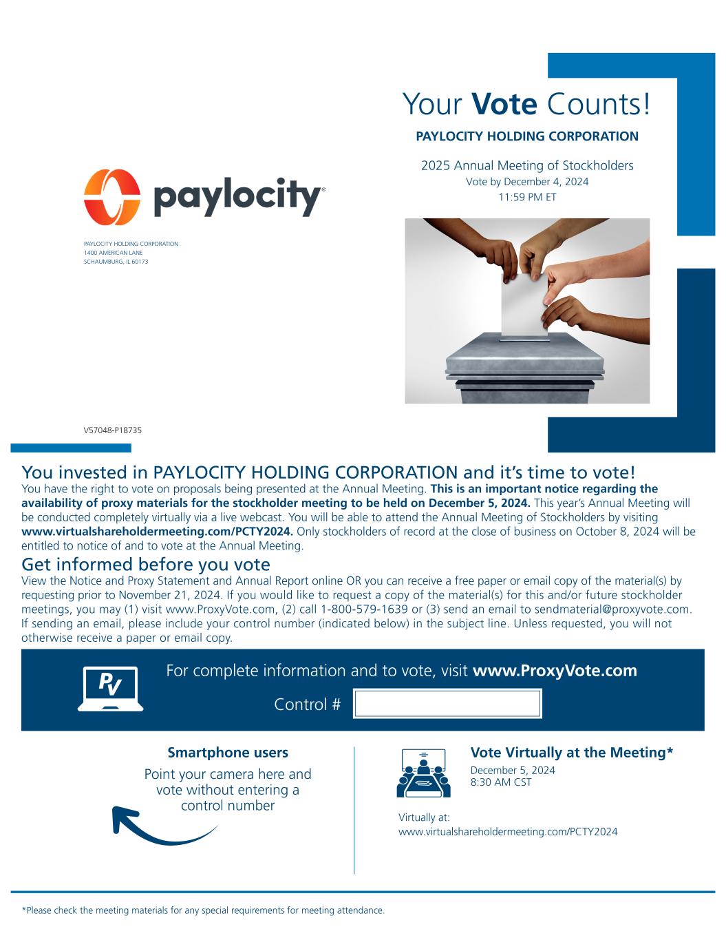Your Vote Counts! PAYLOCITY HOLDING CORPORATION Vote Virtually at the Meeting* December 5, 2024 8:30 AM CST Virtually at: www.virtualshareholdermeeting.com/PCTY2024 *Please check the meeting materials for any special requirements for meeting attendance. Smartphone users Point your camera here and vote without entering a control number For complete information and to vote, visit www.ProxyVote.com Control # V57048-P18735 PAYLOCITY HOLDING CORPORATION 1400 AMERICAN LANE SCHAUMBURG, IL 60173 You invested in PAYLOCITY HOLDING CORPORATION and it’s time to vote! You have the right to vote on proposals being presented at the Annual Meeting. This is an important notice regarding the availability of proxy materials for the stockholder meeting to be held on December 5, 2024. This year’s Annual Meeting will be conducted completely virtually via a live webcast. You will be able to attend the Annual Meeting of Stockholders by visiting www.virtualshareholdermeeting.com/PCTY2024. Only stockholders of record at the close of business on October 8, 2024 will be entitled to notice of and to vote at the Annual Meeting. Get informed before you vote View the Notice and Proxy Statement and Annual Report online OR you can receive a free paper or email copy of the material(s) by requesting prior to November 21, 2024. If you would like to request a copy of the material(s) for this and/or future stockholder meetings, you may (1) visit www.ProxyVote.com, (2) call 1-800-579-1639 or (3) send an email to sendmaterial@proxyvote.com. If sending an email, please include your control number (indicated below) in the subject line. Unless requested, you will not otherwise receive a paper or email copy. 2025 Annual Meeting of Stockholders Vote by December 4, 2024 11:59 PM ET