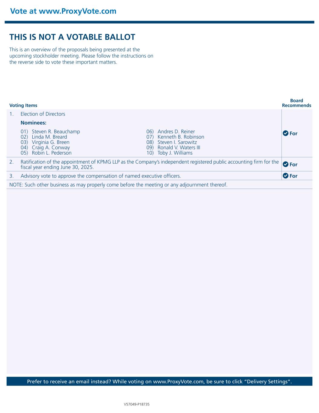 THIS IS NOT A VOTABLE BALLOT This is an overview of the proposals being presented at the upcoming stockholder meeting. Please follow the instructions on the reverse side to vote these important matters. Vote at www.ProxyVote.com Prefer to receive an email instead? While voting on www.ProxyVote.com, be sure to click “Delivery Settings”. Voting Items Board Recommends V57049-P18735 1. Election of Directors For Nominees: 01) Steven R. Beauchamp 02) Linda M. Breard 03) Virginia G. Breen 04) Craig A. Conway 05) Robin L. Pederson 06) Andres D. Reiner 07) Kenneth B. Robinson 08) Steven I. Sarowitz 09) Ronald V. Waters III 10) Toby J. Williams 2. Ratification of the appointment of KPMG LLP as the Company’s independent registered public accounting firm for the fiscal year ending June 30, 2025. For 3. Advisory vote to approve the compensation of named executive officers. For NOTE: Such other business as may properly come before the meeting or any adjournment thereof.