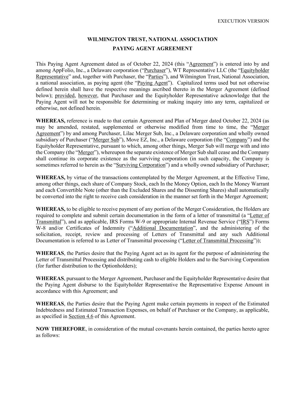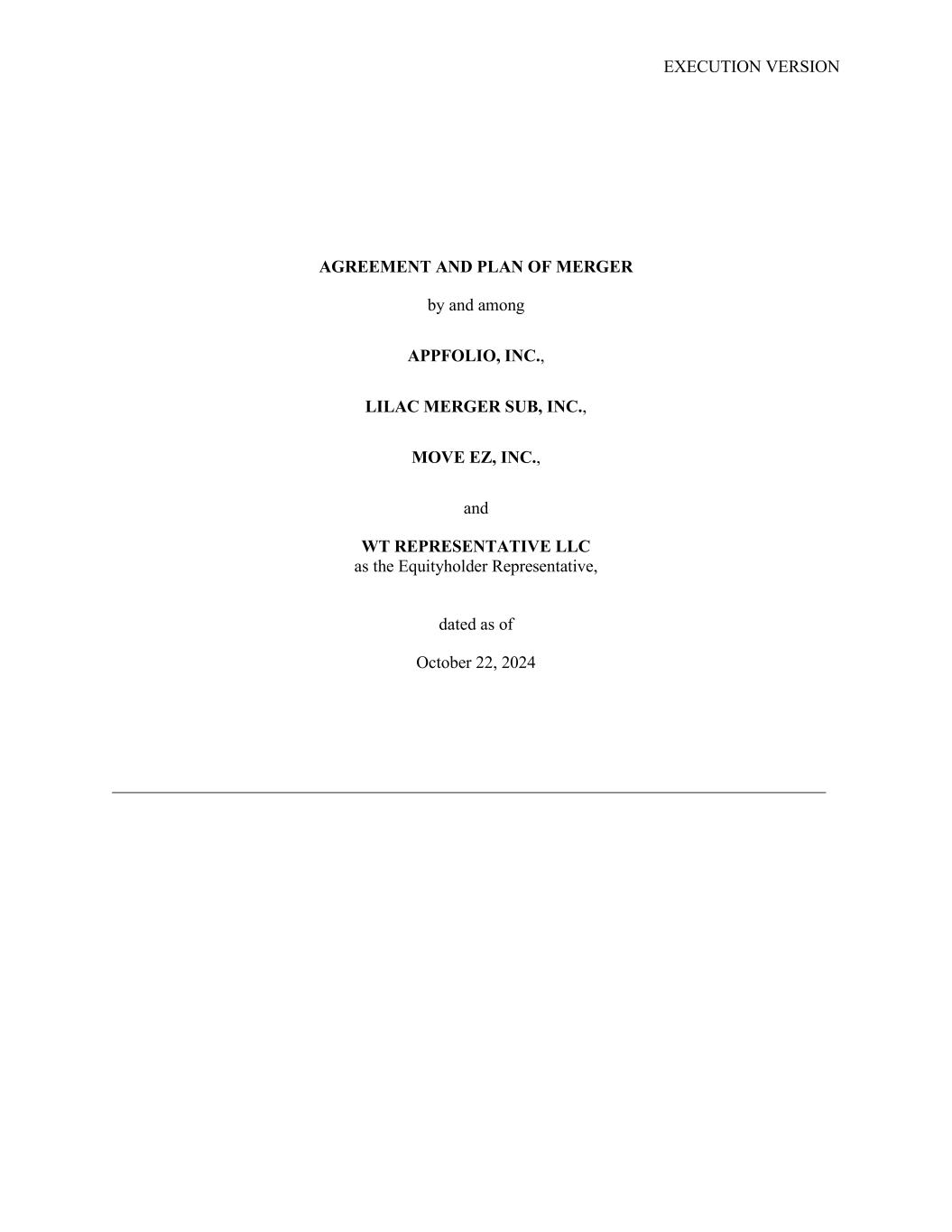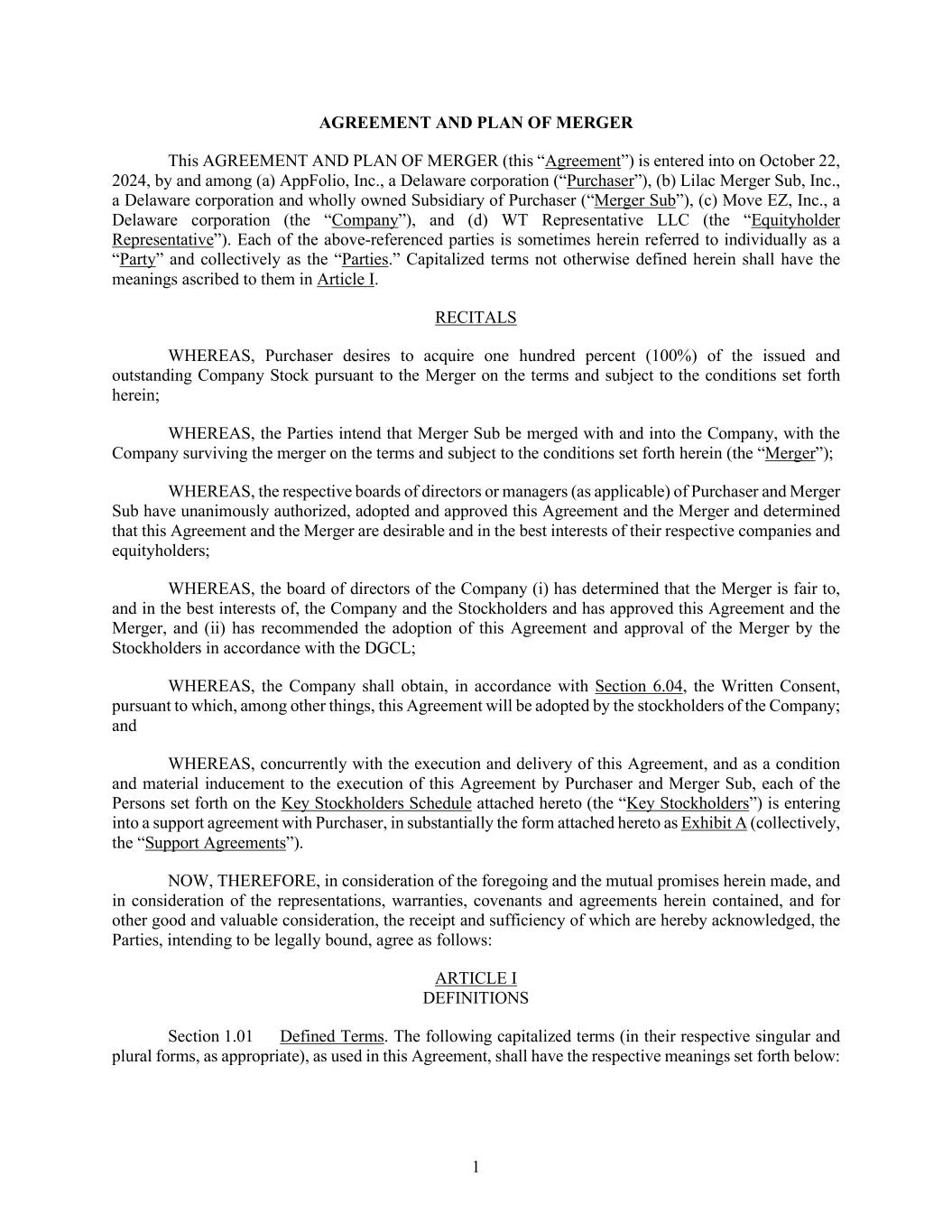 1 AGREEMENT AND PLAN OF MERGER This AGREEMENT AND PLAN OF MERGER (this “Agreement”) is entered into on October 22, 2024, by and among (a) AppFolio, Inc., a Delaware corporation (“Purchaser”), (b) Lilac Merger Sub, Inc., a Delaware corporation and wholly owned Subsidiary of Purchaser (“Merger Sub”), (c) Move EZ, Inc., a Delaware corporation (the “Company”), and (d) WT Representative LLC (the “Equityholder Representative”). Each of the above-referenced parties is sometimes herein referred to individually as a “Party” and collectively as the “Parties.” Capitalized terms not otherwise defined herein shall have the meanings ascribed to them in Article I. RECITALS WHEREAS, Purchaser desires to acquire one hundred percent (100%) of the issued and outstanding Company Stock pursuant to the Merger on the terms and subject to the conditions set forth herein; WHEREAS, the Parties intend that Merger Sub be merged with and into the Company, with the Company surviving the merger on the terms and subject to the conditions set forth herein (the “Merger”); WHEREAS, the respective boards of directors or managers (as applicable) of Purchaser and Merger Sub have unanimously authorized, adopted and approved this Agreement and the Merger and determined that this Agreement and the Merger are desirable and in the best interests of their respective companies and equityholders; WHEREAS, the board of directors of the Company (i) has determined that the Merger is fair to, and in the best interests of, the Company and the Stockholders and has approved this Agreement and the Merger, and (ii) has recommended the adoption of this Agreement and approval of the Merger by the Stockholders in accordance with the DGCL; WHEREAS, the Company shall obtain, in accordance with Section 6.04, the Written Consent, pursuant to which, among other things, this Agreement will be adopted by the stockholders of the Company; and WHEREAS, concurrently with the execution and delivery of this Agreement, and as a condition and material inducement to the execution of this Agreement by Purchaser and Merger Sub, each of the Persons set forth on the Key Stockholders Schedule attached hereto (the “Key Stockholders”) is entering into a support agreement with Purchaser, in substantially the form attached hereto as Exhibit A (collectively, the “Support Agreements”). NOW, THEREFORE, in consideration of the foregoing and the mutual promises herein made, and in consideration of the representations, warranties, covenants and agreements herein contained, and for other good and valuable consideration, the receipt and sufficiency of which are hereby acknowledged, the Parties, intending to be legally bound, agree as follows: ARTICLE I DEFINITIONS Section 1.01 Defined Terms. The following capitalized terms (in their respective singular and plural forms, as appropriate), as used in this Agreement, shall have the respective meanings set forth below: