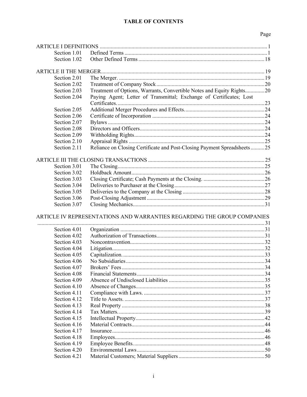 TABLE OF CONTENTS Page i ARTICLE I DEFINITIONS ......................................................................................................................... 1 Section 1.01 Defined Terms ....................................................................................................... 1 Section 1.02 Other Defined Terms ........................................................................................... 18 ARTICLE II THE MERGER ...................................................................................................................... 19 Section 2.01 The Merger. ......................................................................................................... 19 Section 2.02 Treatment of Company Stock .............................................................................. 20 Section 2.03 Treatment of Options, Warrants, Convertible Notes and Equity Rights.............. 20 Section 2.04 Paying Agent; Letter of Transmittal; Exchange of Certificates; Lost Certificates. .......................................................................................................... 23 Section 2.05 Additional Merger Procedures and Effects. ......................................................... 24 Section 2.06 Certificate of Incorporation ................................................................................. 24 Section 2.07 Bylaws ................................................................................................................. 24 Section 2.08 Directors and Officers .......................................................................................... 24 Section 2.09 Withholding Rights .............................................................................................. 24 Section 2.10 Appraisal Rights .................................................................................................. 25 Section 2.11 Reliance on Closing Certificate and Post-Closing Payment Spreadsheets .......... 25 ARTICLE III THE CLOSING TRANSACTIONS .................................................................................... 25 Section 3.01 The Closing .......................................................................................................... 25 Section 3.02 Holdback Amount ................................................................................................ 26 Section 3.03 Closing Certificate; Cash Payments at the Closing. ............................................ 26 Section 3.04 Deliveries to Purchaser at the Closing ................................................................. 27 Section 3.05 Deliveries to the Company at the Closing ........................................................... 28 Section 3.06 Post-Closing Adjustment ..................................................................................... 29 Section 3.07 Closing Mechanics ............................................................................................... 31 ARTICLE IV REPRESENTATIONS AND WARRANTIES REGARDING THE GROUP COMPANIES .................................................................................................................................................................... 31 Section 4.01 Organization ........................................................................................................ 31 Section 4.02 Authorization of Transactions.............................................................................. 31 Section 4.03 Noncontravention................................................................................................. 32 Section 4.04 Litigation .............................................................................................................. 32 Section 4.05 Capitalization. ...................................................................................................... 33 Section 4.06 No Subsidiaries .................................................................................................... 34 Section 4.07 Brokers’ Fees ....................................................................................................... 34 Section 4.08 Financial Statements ............................................................................................ 34 Section 4.09 Absence of Undisclosed Liabilities ..................................................................... 35 Section 4.10 Absence of Changes............................................................................................. 35 Section 4.11 Compliance with Laws. ....................................................................................... 37 Section 4.12 Title to Assets. ..................................................................................................... 37 Section 4.13 Real Property ....................................................................................................... 38 Section 4.14 Tax Matters. ......................................................................................................... 39 Section 4.15 Intellectual Property. ............................................................................................ 42 Section 4.16 Material Contracts................................................................................................ 44 Section 4.17 Insurance .............................................................................................................. 46 Section 4.18 Employees. ........................................................................................................... 46 Section 4.19 Employee Benefits. .............................................................................................. 48 Section 4.20 Environmental Laws ............................................................................................ 50 Section 4.21 Material Customers; Material Suppliers .............................................................. 50