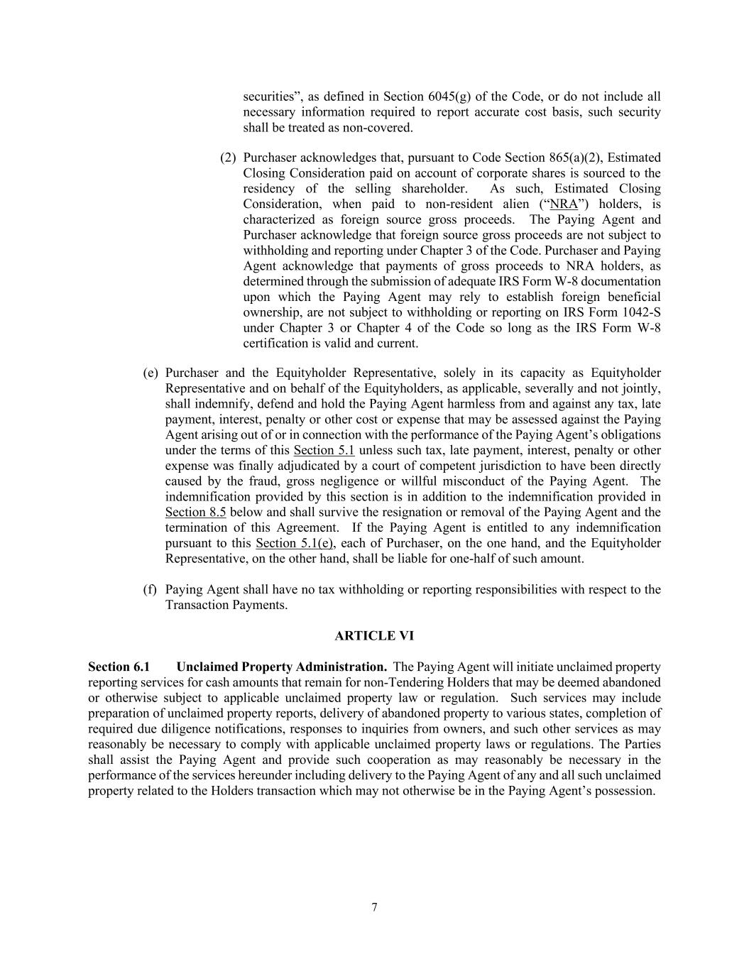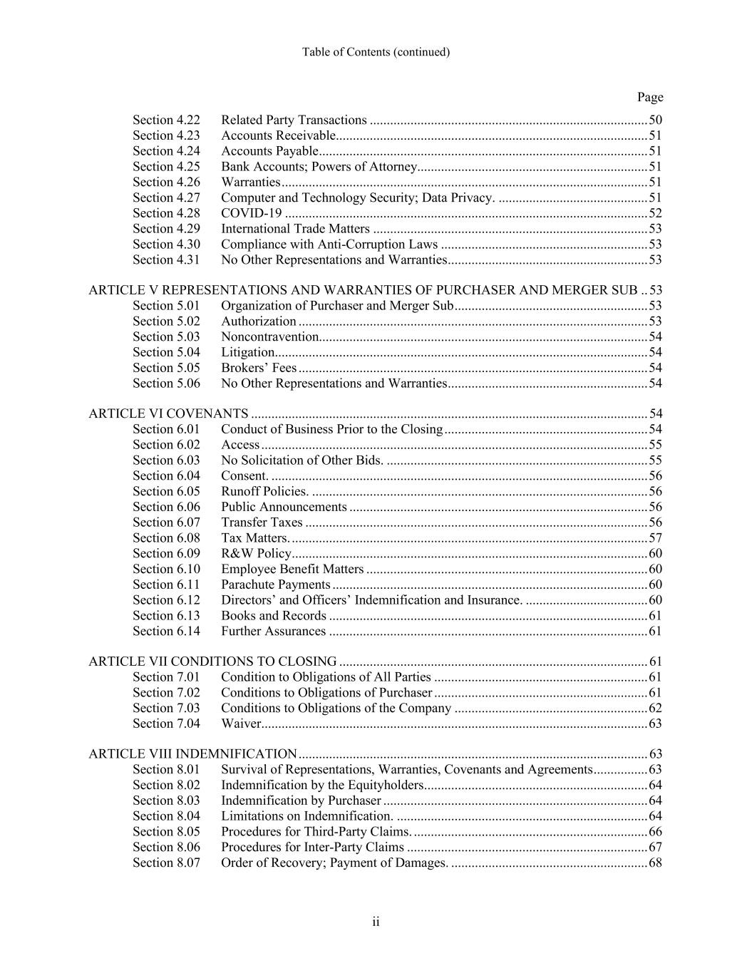 Table of Contents (continued) Page ii Section 4.22 Related Party Transactions .................................................................................. 50 Section 4.23 Accounts Receivable ............................................................................................ 51 Section 4.24 Accounts Payable ................................................................................................. 51 Section 4.25 Bank Accounts; Powers of Attorney.................................................................... 51 Section 4.26 Warranties ............................................................................................................ 51 Section 4.27 Computer and Technology Security; Data Privacy. ............................................ 51 Section 4.28 COVID-19 ........................................................................................................... 52 Section 4.29 International Trade Matters ................................................................................. 53 Section 4.30 Compliance with Anti-Corruption Laws ............................................................. 53 Section 4.31 No Other Representations and Warranties ........................................................... 53 ARTICLE V REPRESENTATIONS AND WARRANTIES OF PURCHASER AND MERGER SUB .. 53 Section 5.01 Organization of Purchaser and Merger Sub ......................................................... 53 Section 5.02 Authorization ....................................................................................................... 53 Section 5.03 Noncontravention................................................................................................. 54 Section 5.04 Litigation .............................................................................................................. 54 Section 5.05 Brokers’ Fees ....................................................................................................... 54 Section 5.06 No Other Representations and Warranties ........................................................... 54 ARTICLE VI COVENANTS ..................................................................................................................... 54 Section 6.01 Conduct of Business Prior to the Closing ............................................................ 54 Section 6.02 Access .................................................................................................................. 55 Section 6.03 No Solicitation of Other Bids. ............................................................................. 55 Section 6.04 Consent. ............................................................................................................... 56 Section 6.05 Runoff Policies. ................................................................................................... 56 Section 6.06 Public Announcements ........................................................................................ 56 Section 6.07 Transfer Taxes ..................................................................................................... 56 Section 6.08 Tax Matters. ......................................................................................................... 57 Section 6.09 R&W Policy ......................................................................................................... 60 Section 6.10 Employee Benefit Matters ................................................................................... 60 Section 6.11 Parachute Payments ............................................................................................. 60 Section 6.12 Directors’ and Officers’ Indemnification and Insurance. .................................... 60 Section 6.13 Books and Records .............................................................................................. 61 Section 6.14 Further Assurances .............................................................................................. 61 ARTICLE VII CONDITIONS TO CLOSING ........................................................................................... 61 Section 7.01 Condition to Obligations of All Parties ............................................................... 61 Section 7.02 Conditions to Obligations of Purchaser ............................................................... 61 Section 7.03 Conditions to Obligations of the Company ......................................................... 62 Section 7.04 Waiver .................................................................................................................. 63 ARTICLE VIII INDEMNIFICATION ....................................................................................................... 63 Section 8.01 Survival of Representations, Warranties, Covenants and Agreements ................ 63 Section 8.02 Indemnification by the Equityholders .................................................................. 64 Section 8.03 Indemnification by Purchaser .............................................................................. 64 Section 8.04 Limitations on Indemnification. .......................................................................... 64 Section 8.05 Procedures for Third-Party Claims. ..................................................................... 66 Section 8.06 Procedures for Inter-Party Claims ....................................................................... 67 Section 8.07 Order of Recovery; Payment of Damages. .......................................................... 68