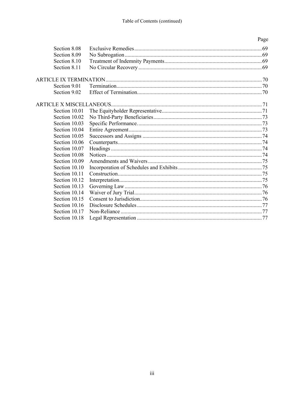 Table of Contents (continued) Page iii Section 8.08 Exclusive Remedies ............................................................................................. 69 Section 8.09 No Subrogation .................................................................................................... 69 Section 8.10 Treatment of Indemnity Payments ....................................................................... 69 Section 8.11 No Circular Recovery .......................................................................................... 69 ARTICLE IX TERMINATION .................................................................................................................. 70 Section 9.01 Termination .......................................................................................................... 70 Section 9.02 Effect of Termination ........................................................................................... 70 ARTICLE X MISCELLANEOUS.............................................................................................................. 71 Section 10.01 The Equityholder Representative. ........................................................................ 71 Section 10.02 No Third-Party Beneficiaries ............................................................................... 73 Section 10.03 Specific Performance. .......................................................................................... 73 Section 10.04 Entire Agreement ................................................................................................. 73 Section 10.05 Successors and Assigns ....................................................................................... 74 Section 10.06 Counterparts ......................................................................................................... 74 Section 10.07 Headings .............................................................................................................. 74 Section 10.08 Notices ................................................................................................................. 74 Section 10.09 Amendments and Waivers ................................................................................... 75 Section 10.10 Incorporation of Schedules and Exhibits ............................................................. 75 Section 10.11 Construction ......................................................................................................... 75 Section 10.12 Interpretation ........................................................................................................ 75 Section 10.13 Governing Law .................................................................................................... 76 Section 10.14 Waiver of Jury Trial ............................................................................................. 76 Section 10.15 Consent to Jurisdiction ......................................................................................... 76 Section 10.16 Disclosure Schedules ........................................................................................... 77 Section 10.17 Non-Reliance ....................................................................................................... 77 Section 10.18 Legal Representation ........................................................................................... 77