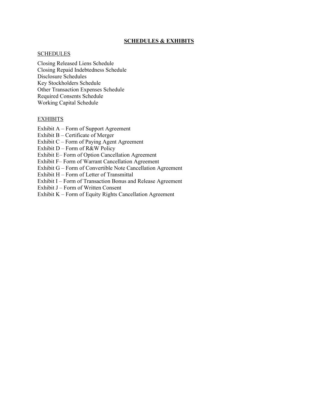 SCHEDULES & EXHIBITS SCHEDULES Closing Released Liens Schedule Closing Repaid Indebtedness Schedule Disclosure Schedules Key Stockholders Schedule Other Transaction Expenses Schedule Required Consents Schedule Working Capital Schedule EXHIBITS Exhibit A – Form of Support Agreement Exhibit B – Certificate of Merger Exhibit C – Form of Paying Agent Agreement Exhibit D – Form of R&W Policy Exhibit E– Form of Option Cancellation Agreement Exhibit F– Form of Warrant Cancellation Agreement Exhibit G – Form of Convertible Note Cancellation Agreement Exhibit H – Form of Letter of Transmittal Exhibit I – Form of Transaction Bonus and Release Agreement Exhibit J – Form of Written Consent Exhibit K – Form of Equity Rights Cancellation Agreement