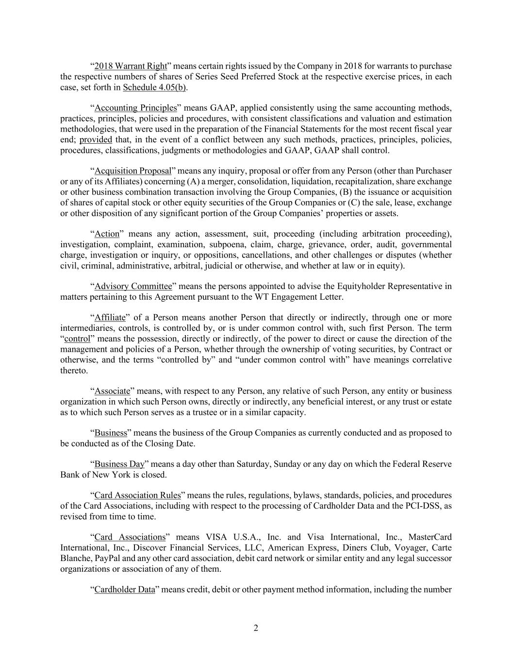 2 “2018 Warrant Right” means certain rights issued by the Company in 2018 for warrants to purchase the respective numbers of shares of Series Seed Preferred Stock at the respective exercise prices, in each case, set forth in Schedule 4.05(b). “Accounting Principles” means GAAP, applied consistently using the same accounting methods, practices, principles, policies and procedures, with consistent classifications and valuation and estimation methodologies, that were used in the preparation of the Financial Statements for the most recent fiscal year end; provided that, in the event of a conflict between any such methods, practices, principles, policies, procedures, classifications, judgments or methodologies and GAAP, GAAP shall control. “Acquisition Proposal” means any inquiry, proposal or offer from any Person (other than Purchaser or any of its Affiliates) concerning (A) a merger, consolidation, liquidation, recapitalization, share exchange or other business combination transaction involving the Group Companies, (B) the issuance or acquisition of shares of capital stock or other equity securities of the Group Companies or (C) the sale, lease, exchange or other disposition of any significant portion of the Group Companies’ properties or assets. “Action” means any action, assessment, suit, proceeding (including arbitration proceeding), investigation, complaint, examination, subpoena, claim, charge, grievance, order, audit, governmental charge, investigation or inquiry, or oppositions, cancellations, and other challenges or disputes (whether civil, criminal, administrative, arbitral, judicial or otherwise, and whether at law or in equity). “Advisory Committee” means the persons appointed to advise the Equityholder Representative in matters pertaining to this Agreement pursuant to the WT Engagement Letter. “Affiliate” of a Person means another Person that directly or indirectly, through one or more intermediaries, controls, is controlled by, or is under common control with, such first Person. The term “control” means the possession, directly or indirectly, of the power to direct or cause the direction of the management and policies of a Person, whether through the ownership of voting securities, by Contract or otherwise, and the terms “controlled by” and “under common control with” have meanings correlative thereto. “Associate” means, with respect to any Person, any relative of such Person, any entity or business organization in which such Person owns, directly or indirectly, any beneficial interest, or any trust or estate as to which such Person serves as a trustee or in a similar capacity. “Business” means the business of the Group Companies as currently conducted and as proposed to be conducted as of the Closing Date. “Business Day” means a day other than Saturday, Sunday or any day on which the Federal Reserve Bank of New York is closed. “Card Association Rules” means the rules, regulations, bylaws, standards, policies, and procedures of the Card Associations, including with respect to the processing of Cardholder Data and the PCI-DSS, as revised from time to time. “Card Associations” means VISA U.S.A., Inc. and Visa International, Inc., MasterCard International, Inc., Discover Financial Services, LLC, American Express, Diners Club, Voyager, Carte Blanche, PayPal and any other card association, debit card network or similar entity and any legal successor organizations or association of any of them. “Cardholder Data” means credit, debit or other payment method information, including the number