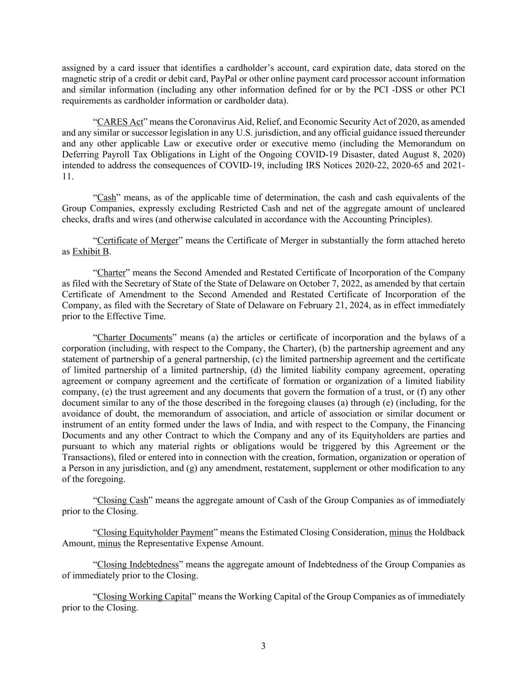 3 assigned by a card issuer that identifies a cardholder’s account, card expiration date, data stored on the magnetic strip of a credit or debit card, PayPal or other online payment card processor account information and similar information (including any other information defined for or by the PCI -DSS or other PCI requirements as cardholder information or cardholder data). “CARES Act” means the Coronavirus Aid, Relief, and Economic Security Act of 2020, as amended and any similar or successor legislation in any U.S. jurisdiction, and any official guidance issued thereunder and any other applicable Law or executive order or executive memo (including the Memorandum on Deferring Payroll Tax Obligations in Light of the Ongoing COVID-19 Disaster, dated August 8, 2020) intended to address the consequences of COVID-19, including IRS Notices 2020-22, 2020-65 and 2021- 11. “Cash” means, as of the applicable time of determination, the cash and cash equivalents of the Group Companies, expressly excluding Restricted Cash and net of the aggregate amount of uncleared checks, drafts and wires (and otherwise calculated in accordance with the Accounting Principles). “Certificate of Merger” means the Certificate of Merger in substantially the form attached hereto as Exhibit B. “Charter” means the Second Amended and Restated Certificate of Incorporation of the Company as filed with the Secretary of State of the State of Delaware on October 7, 2022, as amended by that certain Certificate of Amendment to the Second Amended and Restated Certificate of Incorporation of the Company, as filed with the Secretary of State of Delaware on February 21, 2024, as in effect immediately prior to the Effective Time. “Charter Documents” means (a) the articles or certificate of incorporation and the bylaws of a corporation (including, with respect to the Company, the Charter), (b) the partnership agreement and any statement of partnership of a general partnership, (c) the limited partnership agreement and the certificate of limited partnership of a limited partnership, (d) the limited liability company agreement, operating agreement or company agreement and the certificate of formation or organization of a limited liability company, (e) the trust agreement and any documents that govern the formation of a trust, or (f) any other document similar to any of the those described in the foregoing clauses (a) through (e) (including, for the avoidance of doubt, the memorandum of association, and article of association or similar document or instrument of an entity formed under the laws of India, and with respect to the Company, the Financing Documents and any other Contract to which the Company and any of its Equityholders are parties and pursuant to which any material rights or obligations would be triggered by this Agreement or the Transactions), filed or entered into in connection with the creation, formation, organization or operation of a Person in any jurisdiction, and (g) any amendment, restatement, supplement or other modification to any of the foregoing. “Closing Cash” means the aggregate amount of Cash of the Group Companies as of immediately prior to the Closing. “Closing Equityholder Payment” means the Estimated Closing Consideration, minus the Holdback Amount, minus the Representative Expense Amount. “Closing Indebtedness” means the aggregate amount of Indebtedness of the Group Companies as of immediately prior to the Closing. “Closing Working Capital” means the Working Capital of the Group Companies as of immediately prior to the Closing.