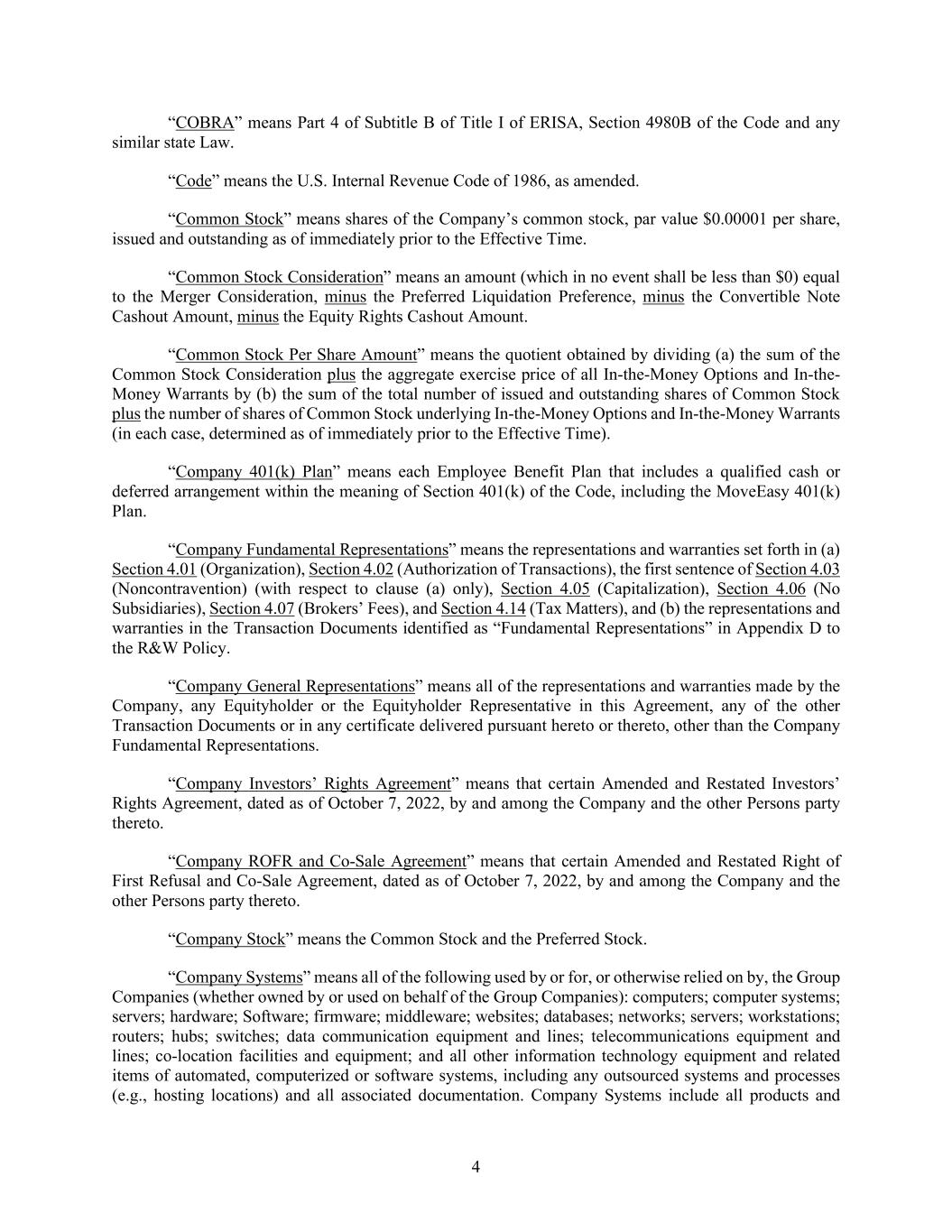 4 “COBRA” means Part 4 of Subtitle B of Title I of ERISA, Section 4980B of the Code and any similar state Law. “Code” means the U.S. Internal Revenue Code of 1986, as amended. “Common Stock” means shares of the Company’s common stock, par value $0.00001 per share, issued and outstanding as of immediately prior to the Effective Time. “Common Stock Consideration” means an amount (which in no event shall be less than $0) equal to the Merger Consideration, minus the Preferred Liquidation Preference, minus the Convertible Note Cashout Amount, minus the Equity Rights Cashout Amount. “Common Stock Per Share Amount” means the quotient obtained by dividing (a) the sum of the Common Stock Consideration plus the aggregate exercise price of all In-the-Money Options and In-the- Money Warrants by (b) the sum of the total number of issued and outstanding shares of Common Stock plus the number of shares of Common Stock underlying In-the-Money Options and In-the-Money Warrants (in each case, determined as of immediately prior to the Effective Time). “Company 401(k) Plan” means each Employee Benefit Plan that includes a qualified cash or deferred arrangement within the meaning of Section 401(k) of the Code, including the MoveEasy 401(k) Plan. “Company Fundamental Representations” means the representations and warranties set forth in (a) Section 4.01 (Organization), Section 4.02 (Authorization of Transactions), the first sentence of Section 4.03 (Noncontravention) (with respect to clause (a) only), Section 4.05 (Capitalization), Section 4.06 (No Subsidiaries), Section 4.07 (Brokers’ Fees), and Section 4.14 (Tax Matters), and (b) the representations and warranties in the Transaction Documents identified as “Fundamental Representations” in Appendix D to the R&W Policy. “Company General Representations” means all of the representations and warranties made by the Company, any Equityholder or the Equityholder Representative in this Agreement, any of the other Transaction Documents or in any certificate delivered pursuant hereto or thereto, other than the Company Fundamental Representations. “Company Investors’ Rights Agreement” means that certain Amended and Restated Investors’ Rights Agreement, dated as of October 7, 2022, by and among the Company and the other Persons party thereto. “Company ROFR and Co-Sale Agreement” means that certain Amended and Restated Right of First Refusal and Co-Sale Agreement, dated as of October 7, 2022, by and among the Company and the other Persons party thereto. “Company Stock” means the Common Stock and the Preferred Stock. “Company Systems” means all of the following used by or for, or otherwise relied on by, the Group Companies (whether owned by or used on behalf of the Group Companies): computers; computer systems; servers; hardware; Software; firmware; middleware; websites; databases; networks; servers; workstations; routers; hubs; switches; data communication equipment and lines; telecommunications equipment and lines; co-location facilities and equipment; and all other information technology equipment and related items of automated, computerized or software systems, including any outsourced systems and processes (e.g., hosting locations) and all associated documentation. Company Systems include all products and