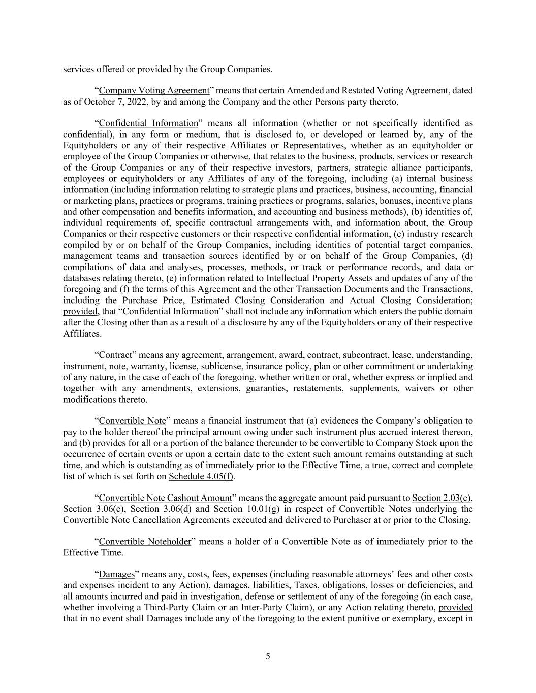 5 services offered or provided by the Group Companies. “Company Voting Agreement” means that certain Amended and Restated Voting Agreement, dated as of October 7, 2022, by and among the Company and the other Persons party thereto. “Confidential Information” means all information (whether or not specifically identified as confidential), in any form or medium, that is disclosed to, or developed or learned by, any of the Equityholders or any of their respective Affiliates or Representatives, whether as an equityholder or employee of the Group Companies or otherwise, that relates to the business, products, services or research of the Group Companies or any of their respective investors, partners, strategic alliance participants, employees or equityholders or any Affiliates of any of the foregoing, including (a) internal business information (including information relating to strategic plans and practices, business, accounting, financial or marketing plans, practices or programs, training practices or programs, salaries, bonuses, incentive plans and other compensation and benefits information, and accounting and business methods), (b) identities of, individual requirements of, specific contractual arrangements with, and information about, the Group Companies or their respective customers or their respective confidential information, (c) industry research compiled by or on behalf of the Group Companies, including identities of potential target companies, management teams and transaction sources identified by or on behalf of the Group Companies, (d) compilations of data and analyses, processes, methods, or track or performance records, and data or databases relating thereto, (e) information related to Intellectual Property Assets and updates of any of the foregoing and (f) the terms of this Agreement and the other Transaction Documents and the Transactions, including the Purchase Price, Estimated Closing Consideration and Actual Closing Consideration; provided, that “Confidential Information” shall not include any information which enters the public domain after the Closing other than as a result of a disclosure by any of the Equityholders or any of their respective Affiliates. “Contract” means any agreement, arrangement, award, contract, subcontract, lease, understanding, instrument, note, warranty, license, sublicense, insurance policy, plan or other commitment or undertaking of any nature, in the case of each of the foregoing, whether written or oral, whether express or implied and together with any amendments, extensions, guaranties, restatements, supplements, waivers or other modifications thereto. “Convertible Note” means a financial instrument that (a) evidences the Company’s obligation to pay to the holder thereof the principal amount owing under such instrument plus accrued interest thereon, and (b) provides for all or a portion of the balance thereunder to be convertible to Company Stock upon the occurrence of certain events or upon a certain date to the extent such amount remains outstanding at such time, and which is outstanding as of immediately prior to the Effective Time, a true, correct and complete list of which is set forth on Schedule 4.05(f). “Convertible Note Cashout Amount” means the aggregate amount paid pursuant to Section 2.03(c), Section 3.06(c), Section 3.06(d) and Section 10.01(g) in respect of Convertible Notes underlying the Convertible Note Cancellation Agreements executed and delivered to Purchaser at or prior to the Closing. “Convertible Noteholder” means a holder of a Convertible Note as of immediately prior to the Effective Time. “Damages” means any, costs, fees, expenses (including reasonable attorneys’ fees and other costs and expenses incident to any Action), damages, liabilities, Taxes, obligations, losses or deficiencies, and all amounts incurred and paid in investigation, defense or settlement of any of the foregoing (in each case, whether involving a Third-Party Claim or an Inter-Party Claim), or any Action relating thereto, provided that in no event shall Damages include any of the foregoing to the extent punitive or exemplary, except in