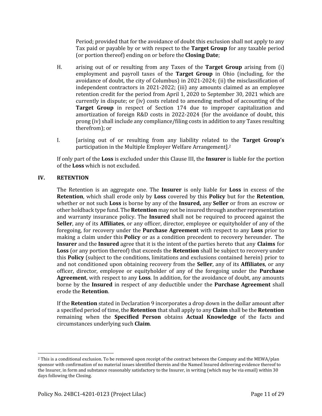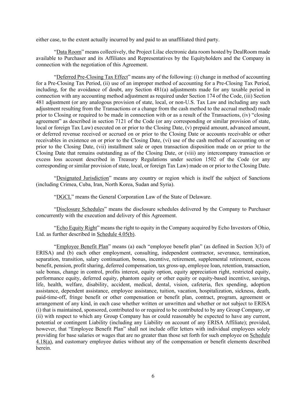 6 either case, to the extent actually incurred by and paid to an unaffiliated third party. “Data Room” means collectively, the Project Lilac electronic data room hosted by DealRoom made available to Purchaser and its Affiliates and Representatives by the Equityholders and the Company in connection with the negotiation of this Agreement. “Deferred Pre-Closing Tax Effect” means any of the following: (i) change in method of accounting for a Pre-Closing Tax Period, (ii) use of an improper method of accounting for a Pre-Closing Tax Period, including, for the avoidance of doubt, any Section 481(a) adjustments made for any taxable period in connection with any accounting method adjustment as required under Section 174 of the Code, (iii) Section 481 adjustment (or any analogous provision of state, local, or non-U.S. Tax Law and including any such adjustment resulting from the Transactions or a change from the cash method to the accrual method) made prior to Closing or required to be made in connection with or as a result of the Transactions, (iv) “closing agreement” as described in section 7121 of the Code (or any corresponding or similar provision of state, local or foreign Tax Law) executed on or prior to the Closing Date, (v) prepaid amount, advanced amount, or deferred revenue received or accrued on or prior to the Closing Date or accounts receivable or other receivables in existence on or prior to the Closing Date, (vi) use of the cash method of accounting on or prior to the Closing Date, (vii) installment sale or open transaction disposition made on or prior to the Closing Date that remains outstanding as of the Closing Date, or (viii) any intercompany transaction or excess loss account described in Treasury Regulations under section 1502 of the Code (or any corresponding or similar provision of state, local, or foreign Tax Law) made on or prior to the Closing Date. “Designated Jurisdiction” means any country or region which is itself the subject of Sanctions (including Crimea, Cuba, Iran, North Korea, Sudan and Syria). “DGCL” means the General Corporation Law of the State of Delaware. “Disclosure Schedules” means the disclosure schedules delivered by the Company to Purchaser concurrently with the execution and delivery of this Agreement. “Echo Equity Right” means the right to equity in the Company acquired by Echo Investors of Ohio, Ltd. as further described in Schedule 4.05(b). “Employee Benefit Plan” means (a) each “employee benefit plan” (as defined in Section 3(3) of ERISA) and (b) each other employment, consulting, independent contractor, severance, termination, separation, transition, salary continuation, bonus, incentive, retirement, supplemental retirement, excess benefit, pension, profit sharing, deferred compensation, tax gross-up, employee loan, retention, transaction, sale bonus, change in control, profits interest, equity option, equity appreciation right, restricted equity, performance equity, deferred equity, phantom equity or other equity or equity-based incentive, savings, life, health, welfare, disability, accident, medical, dental, vision, cafeteria, flex spending, adoption assistance, dependent assistance, employee assistance, tuition, vacation, hospitalization, sickness, death, paid-time-off, fringe benefit or other compensation or benefit plan, contract, program, agreement or arrangement of any kind, in each case whether written or unwritten and whether or not subject to ERISA (i) that is maintained, sponsored, contributed to or required to be contributed to by any Group Company, or (ii) with respect to which any Group Company has or could reasonably be expected to have any current, potential or contingent Liability (including any Liability on account of any ERISA Affiliate); provided, however, that “Employee Benefit Plan” shall not include offer letters with individual employees solely providing for base salaries or wages that are no greater than those set forth for such employee on Schedule 4.18(a), and customary employee duties without any of the compensation or benefit elements described herein.