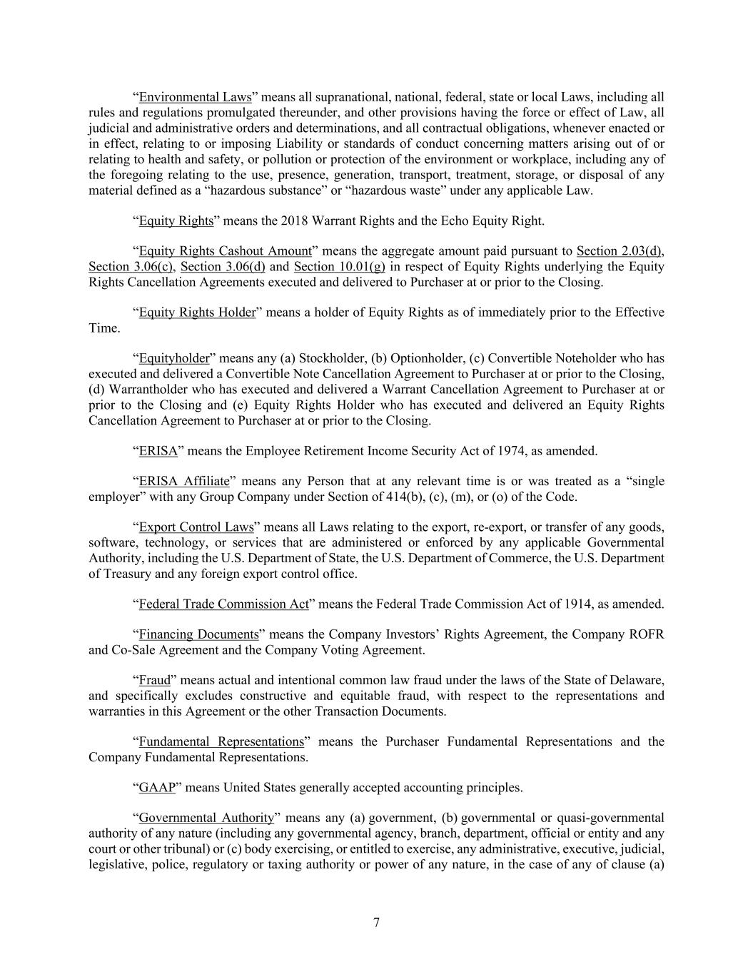 7 “Environmental Laws” means all supranational, national, federal, state or local Laws, including all rules and regulations promulgated thereunder, and other provisions having the force or effect of Law, all judicial and administrative orders and determinations, and all contractual obligations, whenever enacted or in effect, relating to or imposing Liability or standards of conduct concerning matters arising out of or relating to health and safety, or pollution or protection of the environment or workplace, including any of the foregoing relating to the use, presence, generation, transport, treatment, storage, or disposal of any material defined as a “hazardous substance” or “hazardous waste” under any applicable Law. “Equity Rights” means the 2018 Warrant Rights and the Echo Equity Right. “Equity Rights Cashout Amount” means the aggregate amount paid pursuant to Section 2.03(d), Section 3.06(c), Section 3.06(d) and Section 10.01(g) in respect of Equity Rights underlying the Equity Rights Cancellation Agreements executed and delivered to Purchaser at or prior to the Closing. “Equity Rights Holder” means a holder of Equity Rights as of immediately prior to the Effective Time. “Equityholder” means any (a) Stockholder, (b) Optionholder, (c) Convertible Noteholder who has executed and delivered a Convertible Note Cancellation Agreement to Purchaser at or prior to the Closing, (d) Warrantholder who has executed and delivered a Warrant Cancellation Agreement to Purchaser at or prior to the Closing and (e) Equity Rights Holder who has executed and delivered an Equity Rights Cancellation Agreement to Purchaser at or prior to the Closing. “ERISA” means the Employee Retirement Income Security Act of 1974, as amended. “ERISA Affiliate” means any Person that at any relevant time is or was treated as a “single employer” with any Group Company under Section of 414(b), (c), (m), or (o) of the Code. “Export Control Laws” means all Laws relating to the export, re-export, or transfer of any goods, software, technology, or services that are administered or enforced by any applicable Governmental Authority, including the U.S. Department of State, the U.S. Department of Commerce, the U.S. Department of Treasury and any foreign export control office. “Federal Trade Commission Act” means the Federal Trade Commission Act of 1914, as amended. “Financing Documents” means the Company Investors’ Rights Agreement, the Company ROFR and Co-Sale Agreement and the Company Voting Agreement. “Fraud” means actual and intentional common law fraud under the laws of the State of Delaware, and specifically excludes constructive and equitable fraud, with respect to the representations and warranties in this Agreement or the other Transaction Documents. “Fundamental Representations” means the Purchaser Fundamental Representations and the Company Fundamental Representations. “GAAP” means United States generally accepted accounting principles. “Governmental Authority” means any (a) government, (b) governmental or quasi-governmental authority of any nature (including any governmental agency, branch, department, official or entity and any court or other tribunal) or (c) body exercising, or entitled to exercise, any administrative, executive, judicial, legislative, police, regulatory or taxing authority or power of any nature, in the case of any of clause (a)