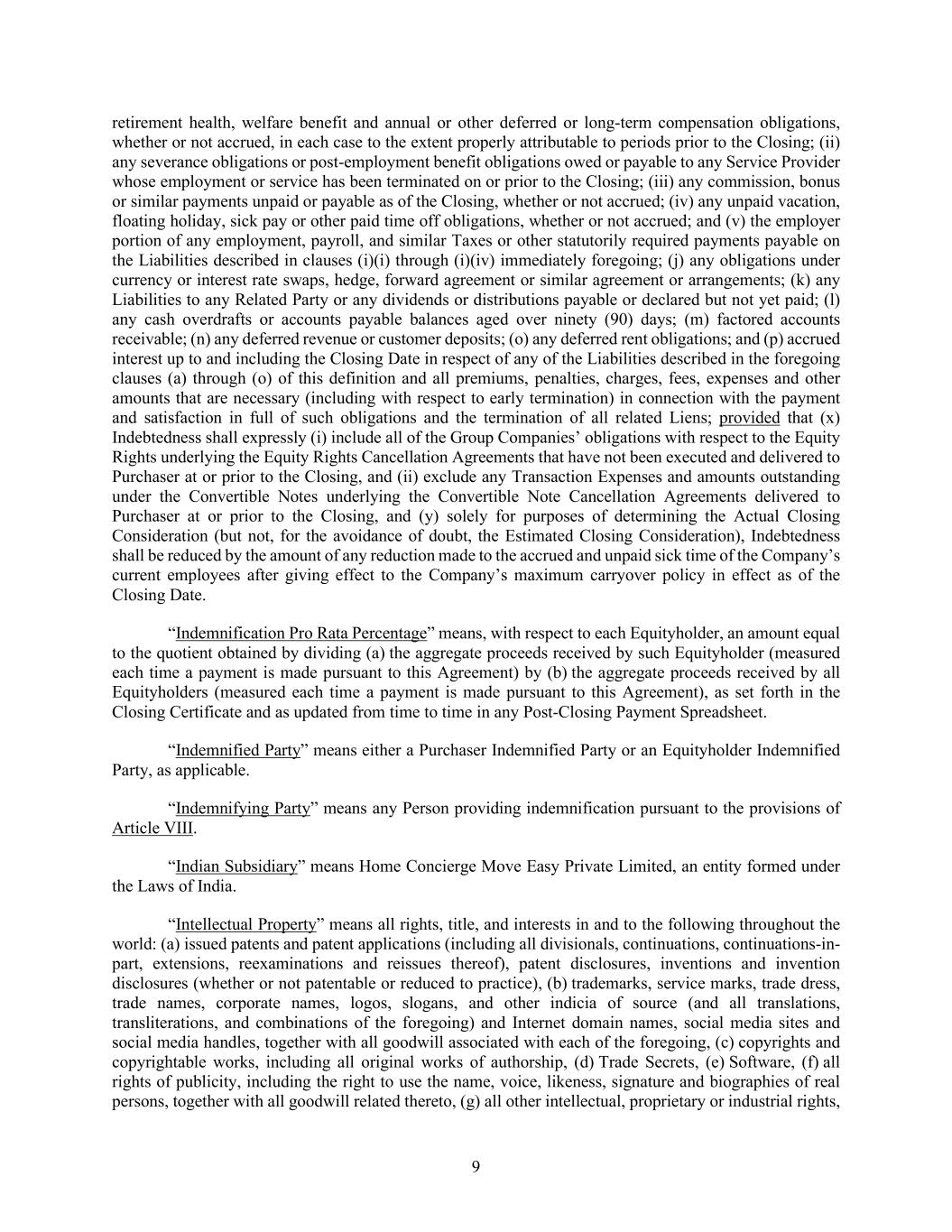 9 retirement health, welfare benefit and annual or other deferred or long-term compensation obligations, whether or not accrued, in each case to the extent properly attributable to periods prior to the Closing; (ii) any severance obligations or post-employment benefit obligations owed or payable to any Service Provider whose employment or service has been terminated on or prior to the Closing; (iii) any commission, bonus or similar payments unpaid or payable as of the Closing, whether or not accrued; (iv) any unpaid vacation, floating holiday, sick pay or other paid time off obligations, whether or not accrued; and (v) the employer portion of any employment, payroll, and similar Taxes or other statutorily required payments payable on the Liabilities described in clauses (i)(i) through (i)(iv) immediately foregoing; (j) any obligations under currency or interest rate swaps, hedge, forward agreement or similar agreement or arrangements; (k) any Liabilities to any Related Party or any dividends or distributions payable or declared but not yet paid; (l) any cash overdrafts or accounts payable balances aged over ninety (90) days; (m) factored accounts receivable; (n) any deferred revenue or customer deposits; (o) any deferred rent obligations; and (p) accrued interest up to and including the Closing Date in respect of any of the Liabilities described in the foregoing clauses (a) through (o) of this definition and all premiums, penalties, charges, fees, expenses and other amounts that are necessary (including with respect to early termination) in connection with the payment and satisfaction in full of such obligations and the termination of all related Liens; provided that (x) Indebtedness shall expressly (i) include all of the Group Companies’ obligations with respect to the Equity Rights underlying the Equity Rights Cancellation Agreements that have not been executed and delivered to Purchaser at or prior to the Closing, and (ii) exclude any Transaction Expenses and amounts outstanding under the Convertible Notes underlying the Convertible Note Cancellation Agreements delivered to Purchaser at or prior to the Closing, and (y) solely for purposes of determining the Actual Closing Consideration (but not, for the avoidance of doubt, the Estimated Closing Consideration), Indebtedness shall be reduced by the amount of any reduction made to the accrued and unpaid sick time of the Company’s current employees after giving effect to the Company’s maximum carryover policy in effect as of the Closing Date. “Indemnification Pro Rata Percentage” means, with respect to each Equityholder, an amount equal to the quotient obtained by dividing (a) the aggregate proceeds received by such Equityholder (measured each time a payment is made pursuant to this Agreement) by (b) the aggregate proceeds received by all Equityholders (measured each time a payment is made pursuant to this Agreement), as set forth in the Closing Certificate and as updated from time to time in any Post-Closing Payment Spreadsheet. “Indemnified Party” means either a Purchaser Indemnified Party or an Equityholder Indemnified Party, as applicable. “Indemnifying Party” means any Person providing indemnification pursuant to the provisions of Article VIII. “Indian Subsidiary” means Home Concierge Move Easy Private Limited, an entity formed under the Laws of India. “Intellectual Property” means all rights, title, and interests in and to the following throughout the world: (a) issued patents and patent applications (including all divisionals, continuations, continuations-in- part, extensions, reexaminations and reissues thereof), patent disclosures, inventions and invention disclosures (whether or not patentable or reduced to practice), (b) trademarks, service marks, trade dress, trade names, corporate names, logos, slogans, and other indicia of source (and all translations, transliterations, and combinations of the foregoing) and Internet domain names, social media sites and social media handles, together with all goodwill associated with each of the foregoing, (c) copyrights and copyrightable works, including all original works of authorship, (d) Trade Secrets, (e) Software, (f) all rights of publicity, including the right to use the name, voice, likeness, signature and biographies of real persons, together with all goodwill related thereto, (g) all other intellectual, proprietary or industrial rights,