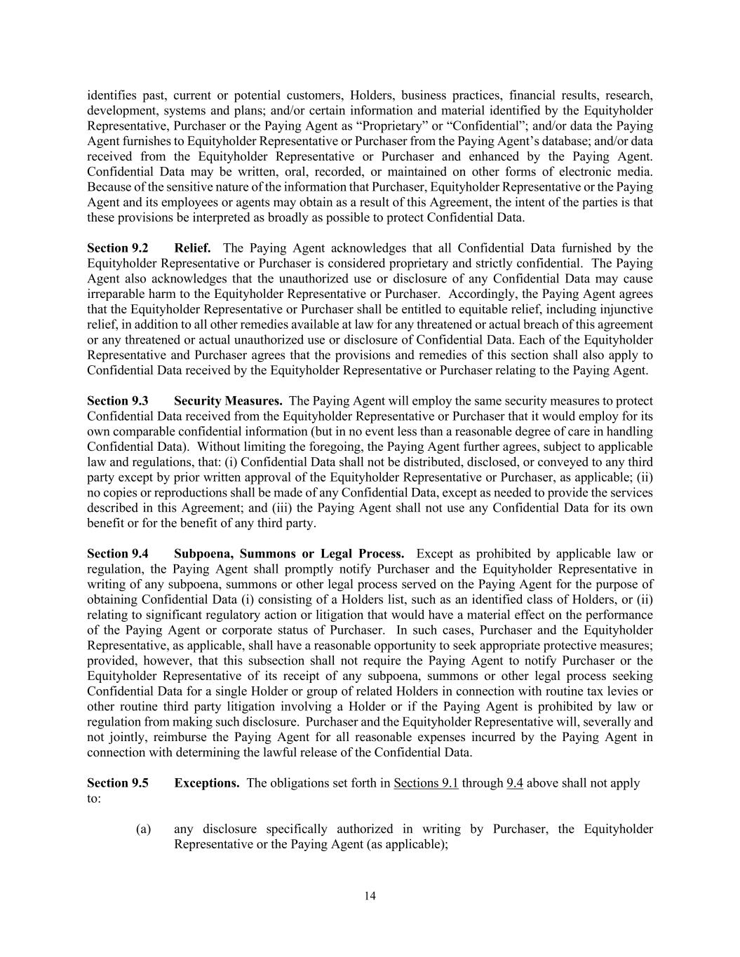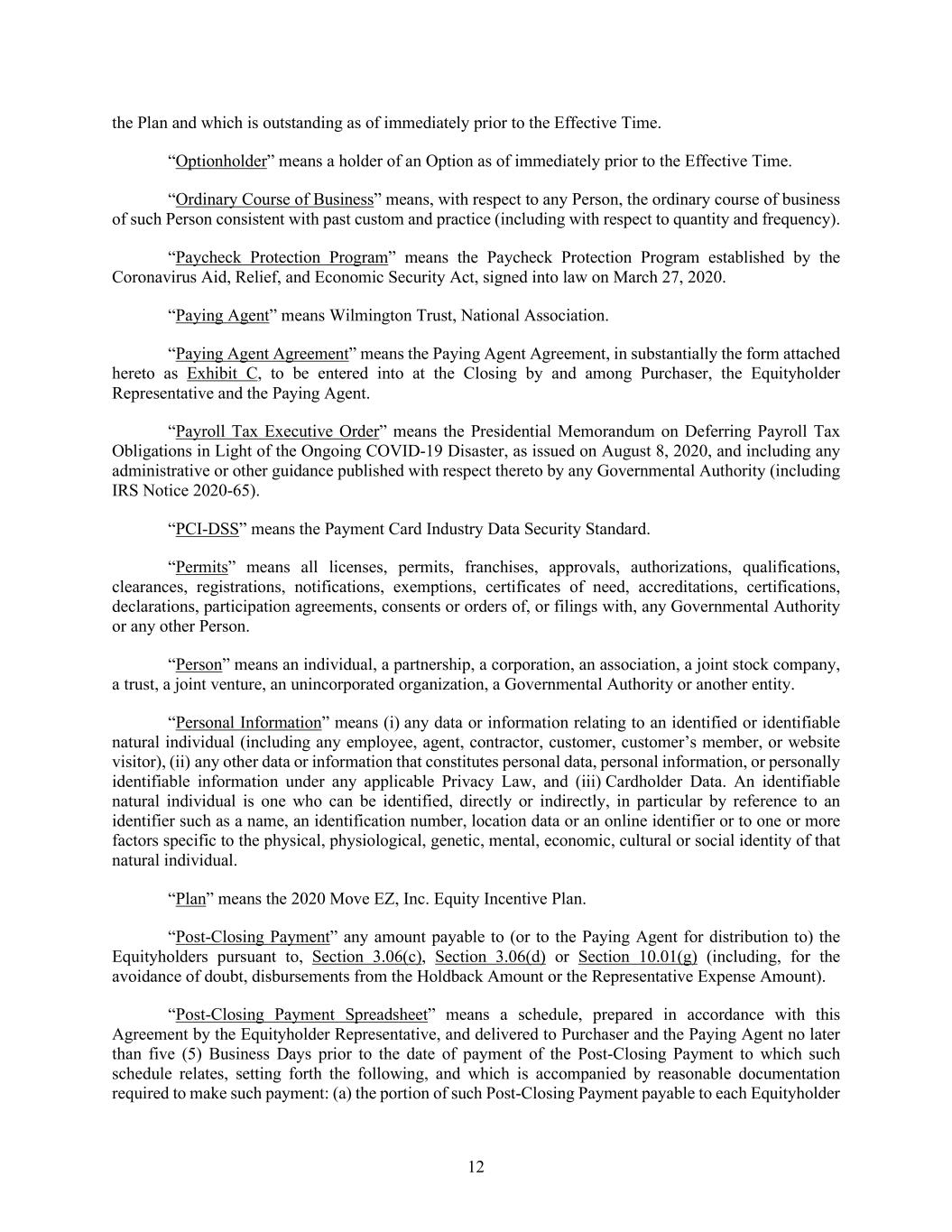 12 the Plan and which is outstanding as of immediately prior to the Effective Time. “Optionholder” means a holder of an Option as of immediately prior to the Effective Time. “Ordinary Course of Business” means, with respect to any Person, the ordinary course of business of such Person consistent with past custom and practice (including with respect to quantity and frequency). “Paycheck Protection Program” means the Paycheck Protection Program established by the Coronavirus Aid, Relief, and Economic Security Act, signed into law on March 27, 2020. “Paying Agent” means Wilmington Trust, National Association. “Paying Agent Agreement” means the Paying Agent Agreement, in substantially the form attached hereto as Exhibit C, to be entered into at the Closing by and among Purchaser, the Equityholder Representative and the Paying Agent. “Payroll Tax Executive Order” means the Presidential Memorandum on Deferring Payroll Tax Obligations in Light of the Ongoing COVID-19 Disaster, as issued on August 8, 2020, and including any administrative or other guidance published with respect thereto by any Governmental Authority (including IRS Notice 2020-65). “PCI-DSS” means the Payment Card Industry Data Security Standard. “Permits” means all licenses, permits, franchises, approvals, authorizations, qualifications, clearances, registrations, notifications, exemptions, certificates of need, accreditations, certifications, declarations, participation agreements, consents or orders of, or filings with, any Governmental Authority or any other Person. “Person” means an individual, a partnership, a corporation, an association, a joint stock company, a trust, a joint venture, an unincorporated organization, a Governmental Authority or another entity. “Personal Information” means (i) any data or information relating to an identified or identifiable natural individual (including any employee, agent, contractor, customer, customer’s member, or website visitor), (ii) any other data or information that constitutes personal data, personal information, or personally identifiable information under any applicable Privacy Law, and (iii) Cardholder Data. An identifiable natural individual is one who can be identified, directly or indirectly, in particular by reference to an identifier such as a name, an identification number, location data or an online identifier or to one or more factors specific to the physical, physiological, genetic, mental, economic, cultural or social identity of that natural individual. “Plan” means the 2020 Move EZ, Inc. Equity Incentive Plan. “Post-Closing Payment” any amount payable to (or to the Paying Agent for distribution to) the Equityholders pursuant to, Section 3.06(c), Section 3.06(d) or Section 10.01(g) (including, for the avoidance of doubt, disbursements from the Holdback Amount or the Representative Expense Amount). “Post-Closing Payment Spreadsheet” means a schedule, prepared in accordance with this Agreement by the Equityholder Representative, and delivered to Purchaser and the Paying Agent no later than five (5) Business Days prior to the date of payment of the Post-Closing Payment to which such schedule relates, setting forth the following, and which is accompanied by reasonable documentation required to make such payment: (a) the portion of such Post-Closing Payment payable to each Equityholder