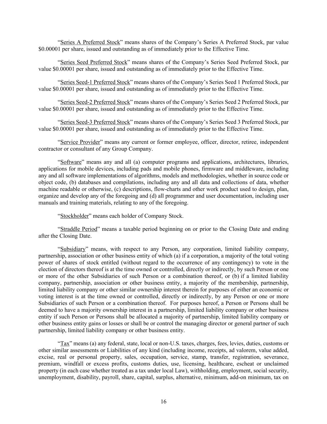 16 “Series A Preferred Stock” means shares of the Company’s Series A Preferred Stock, par value $0.00001 per share, issued and outstanding as of immediately prior to the Effective Time. “Series Seed Preferred Stock” means shares of the Company’s Series Seed Preferred Stock, par value $0.00001 per share, issued and outstanding as of immediately prior to the Effective Time. “Series Seed-1 Preferred Stock” means shares of the Company’s Series Seed 1 Preferred Stock, par value $0.00001 per share, issued and outstanding as of immediately prior to the Effective Time. “Series Seed-2 Preferred Stock” means shares of the Company’s Series Seed 2 Preferred Stock, par value $0.00001 per share, issued and outstanding as of immediately prior to the Effective Time. “Series Seed-3 Preferred Stock” means shares of the Company’s Series Seed 3 Preferred Stock, par value $0.00001 per share, issued and outstanding as of immediately prior to the Effective Time. “Service Provider” means any current or former employee, officer, director, retiree, independent contractor or consultant of any Group Company. “Software” means any and all (a) computer programs and applications, architectures, libraries, applications for mobile devices, including pads and mobile phones, firmware and middleware, including any and all software implementations of algorithms, models and methodologies, whether in source code or object code, (b) databases and compilations, including any and all data and collections of data, whether machine readable or otherwise, (c) descriptions, flow-charts and other work product used to design, plan, organize and develop any of the foregoing and (d) all programmer and user documentation, including user manuals and training materials, relating to any of the foregoing. “Stockholder” means each holder of Company Stock. “Straddle Period” means a taxable period beginning on or prior to the Closing Date and ending after the Closing Date. “Subsidiary” means, with respect to any Person, any corporation, limited liability company, partnership, association or other business entity of which (a) if a corporation, a majority of the total voting power of shares of stock entitled (without regard to the occurrence of any contingency) to vote in the election of directors thereof is at the time owned or controlled, directly or indirectly, by such Person or one or more of the other Subsidiaries of such Person or a combination thereof, or (b) if a limited liability company, partnership, association or other business entity, a majority of the membership, partnership, limited liability company or other similar ownership interest therein for purposes of either an economic or voting interest is at the time owned or controlled, directly or indirectly, by any Person or one or more Subsidiaries of such Person or a combination thereof. For purposes hereof, a Person or Persons shall be deemed to have a majority ownership interest in a partnership, limited liability company or other business entity if such Person or Persons shall be allocated a majority of partnership, limited liability company or other business entity gains or losses or shall be or control the managing director or general partner of such partnership, limited liability company or other business entity. “Tax” means (a) any federal, state, local or non-U.S. taxes, charges, fees, levies, duties, customs or other similar assessments or Liabilities of any kind (including income, receipts, ad valorem, value added, excise, real or personal property, sales, occupation, service, stamp, transfer, registration, severance, premium, windfall or excess profits, customs duties, use, licensing, healthcare, escheat or unclaimed property (in each case whether treated as a tax under local Law), withholding, employment, social security, unemployment, disability, payroll, share, capital, surplus, alternative, minimum, add-on minimum, tax on