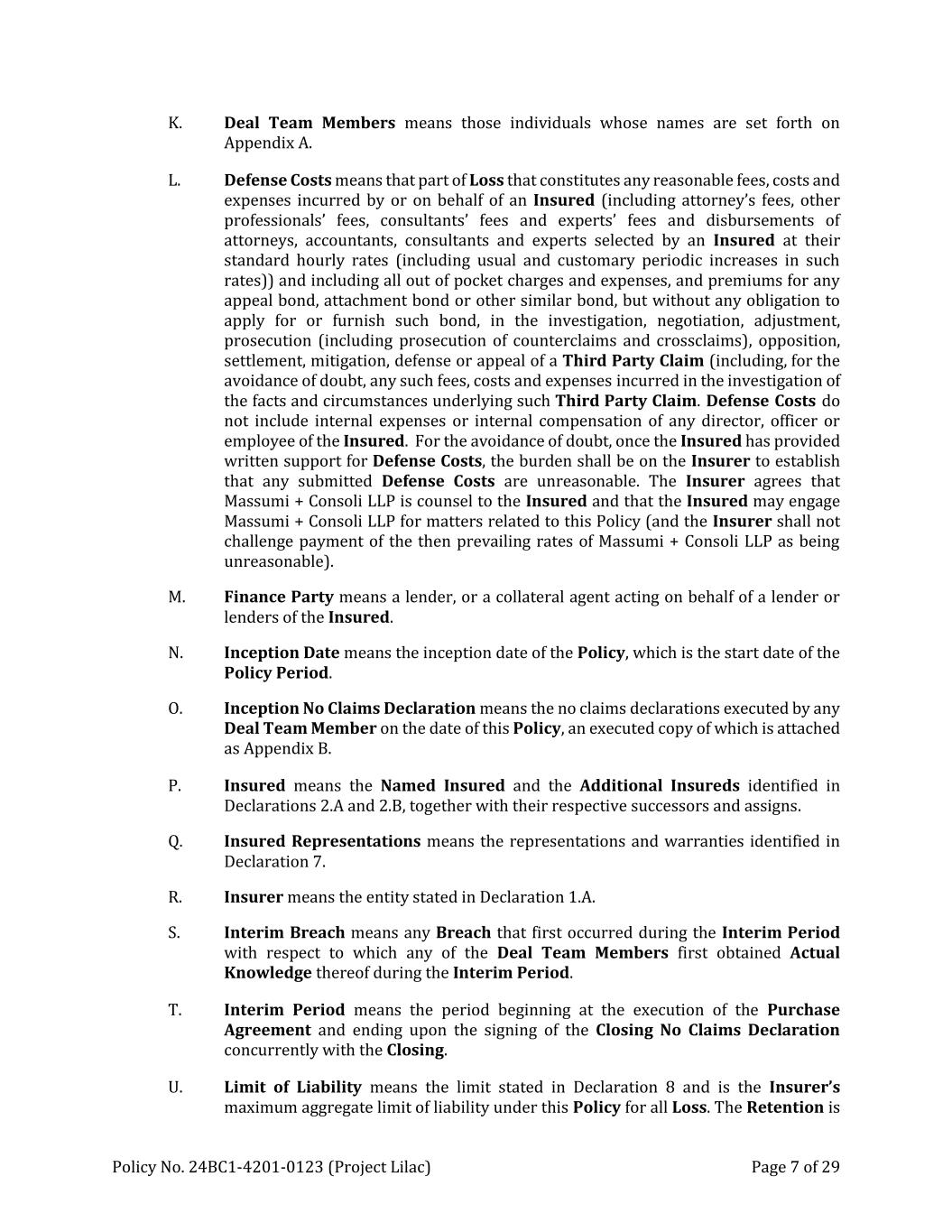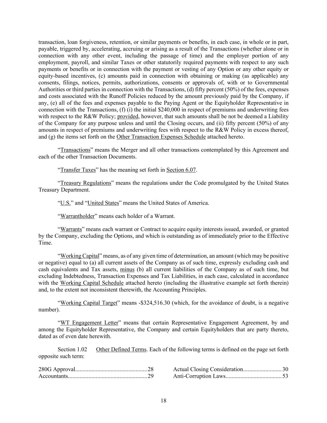 18 transaction, loan forgiveness, retention, or similar payments or benefits, in each case, in whole or in part, payable, triggered by, accelerating, accruing or arising as a result of the Transactions (whether alone or in connection with any other event, including the passage of time) and the employer portion of any employment, payroll, and similar Taxes or other statutorily required payments with respect to any such payments or benefits or in connection with the payment or vesting of any Option or any other equity or equity-based incentives, (c) amounts paid in connection with obtaining or making (as applicable) any consents, filings, notices, permits, authorizations, consents or approvals of, with or to Governmental Authorities or third parties in connection with the Transactions, (d) fifty percent (50%) of the fees, expenses and costs associated with the Runoff Policies reduced by the amount previously paid by the Company, if any, (e) all of the fees and expenses payable to the Paying Agent or the Equityholder Representative in connection with the Transactions, (f) (i) the initial $240,000 in respect of premiums and underwriting fees with respect to the R&W Policy; provided, however, that such amounts shall be not be deemed a Liability of the Company for any purpose unless and until the Closing occurs, and (ii) fifty percent (50%) of any amounts in respect of premiums and underwriting fees with respect to the R&W Policy in excess thereof, and (g) the items set forth on the Other Transaction Expenses Schedule attached hereto. “Transactions” means the Merger and all other transactions contemplated by this Agreement and each of the other Transaction Documents. “Transfer Taxes” has the meaning set forth in Section 6.07. “Treasury Regulations” means the regulations under the Code promulgated by the United States Treasury Department. “U.S.” and “United States” means the United States of America. “Warrantholder” means each holder of a Warrant. “Warrants” means each warrant or Contract to acquire equity interests issued, awarded, or granted by the Company, excluding the Options, and which is outstanding as of immediately prior to the Effective Time. “Working Capital” means, as of any given time of determination, an amount (which may be positive or negative) equal to (a) all current assets of the Company as of such time, expressly excluding cash and cash equivalents and Tax assets, minus (b) all current liabilities of the Company as of such time, but excluding Indebtedness, Transaction Expenses and Tax Liabilities, in each case, calculated in accordance with the Working Capital Schedule attached hereto (including the illustrative example set forth therein) and, to the extent not inconsistent therewith, the Accounting Principles. “Working Capital Target” means -$324,516.30 (which, for the avoidance of doubt, is a negative number). “WT Engagement Letter” means that certain Representative Engagement Agreement, by and among the Equityholder Representative, the Company and certain Equityholders that are party thereto, dated as of even date herewith. Section 1.02 Other Defined Terms. Each of the following terms is defined on the page set forth opposite such term: 280G Approval................................................. 28 Accountants...................................................... 29 Actual Closing Consideration .......................... 30 Anti-Corruption Laws ...................................... 53