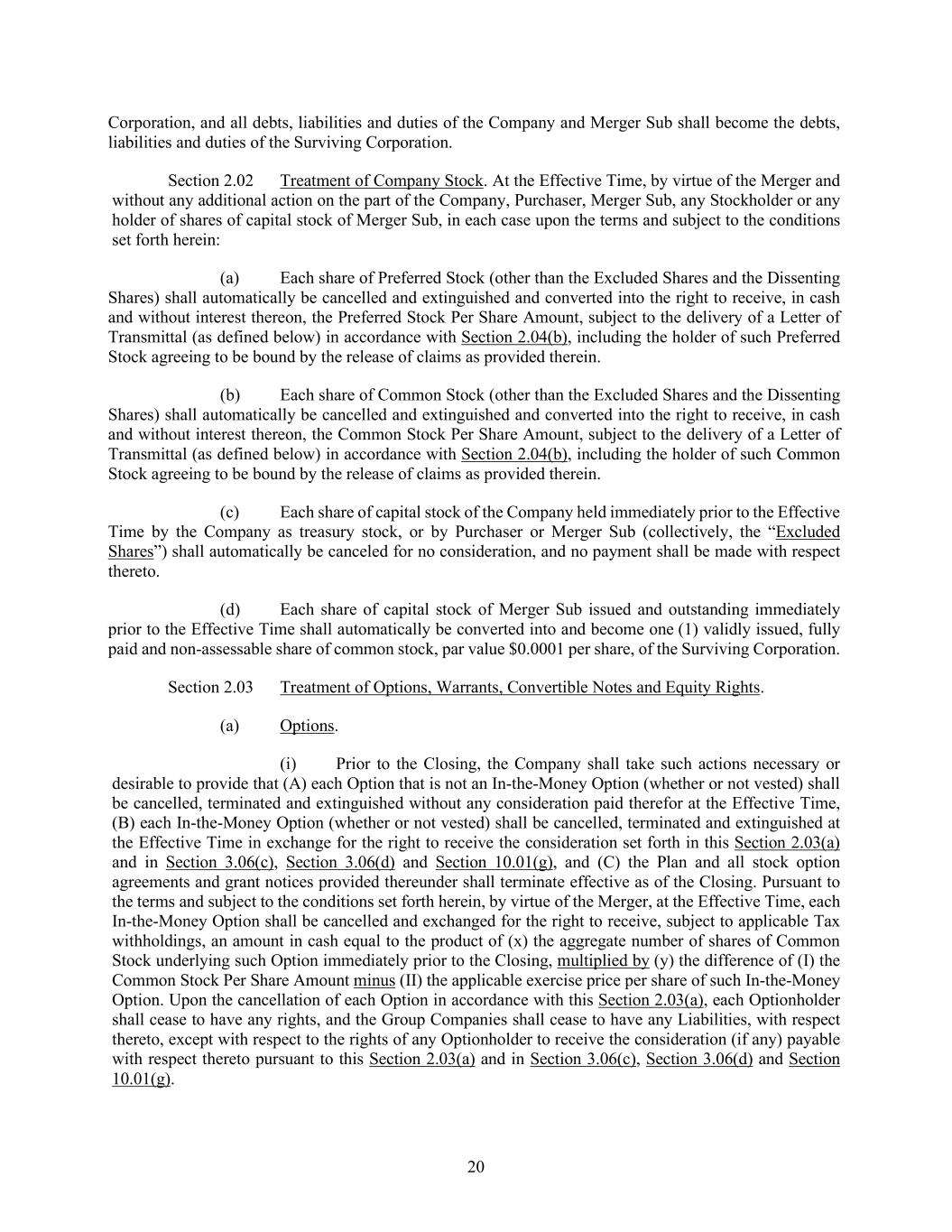 20 Corporation, and all debts, liabilities and duties of the Company and Merger Sub shall become the debts, liabilities and duties of the Surviving Corporation. Section 2.02 Treatment of Company Stock. At the Effective Time, by virtue of the Merger and without any additional action on the part of the Company, Purchaser, Merger Sub, any Stockholder or any holder of shares of capital stock of Merger Sub, in each case upon the terms and subject to the conditions set forth herein: (a) Each share of Preferred Stock (other than the Excluded Shares and the Dissenting Shares) shall automatically be cancelled and extinguished and converted into the right to receive, in cash and without interest thereon, the Preferred Stock Per Share Amount, subject to the delivery of a Letter of Transmittal (as defined below) in accordance with Section 2.04(b), including the holder of such Preferred Stock agreeing to be bound by the release of claims as provided therein. (b) Each share of Common Stock (other than the Excluded Shares and the Dissenting Shares) shall automatically be cancelled and extinguished and converted into the right to receive, in cash and without interest thereon, the Common Stock Per Share Amount, subject to the delivery of a Letter of Transmittal (as defined below) in accordance with Section 2.04(b), including the holder of such Common Stock agreeing to be bound by the release of claims as provided therein. (c) Each share of capital stock of the Company held immediately prior to the Effective Time by the Company as treasury stock, or by Purchaser or Merger Sub (collectively, the “Excluded Shares”) shall automatically be canceled for no consideration, and no payment shall be made with respect thereto. (d) Each share of capital stock of Merger Sub issued and outstanding immediately prior to the Effective Time shall automatically be converted into and become one (1) validly issued, fully paid and non-assessable share of common stock, par value $0.0001 per share, of the Surviving Corporation. Section 2.03 Treatment of Options, Warrants, Convertible Notes and Equity Rights. (a) Options. (i) Prior to the Closing, the Company shall take such actions necessary or desirable to provide that (A) each Option that is not an In-the-Money Option (whether or not vested) shall be cancelled, terminated and extinguished without any consideration paid therefor at the Effective Time, (B) each In-the-Money Option (whether or not vested) shall be cancelled, terminated and extinguished at the Effective Time in exchange for the right to receive the consideration set forth in this Section 2.03(a) and in Section 3.06(c), Section 3.06(d) and Section 10.01(g), and (C) the Plan and all stock option agreements and grant notices provided thereunder shall terminate effective as of the Closing. Pursuant to the terms and subject to the conditions set forth herein, by virtue of the Merger, at the Effective Time, each In-the-Money Option shall be cancelled and exchanged for the right to receive, subject to applicable Tax withholdings, an amount in cash equal to the product of (x) the aggregate number of shares of Common Stock underlying such Option immediately prior to the Closing, multiplied by (y) the difference of (I) the Common Stock Per Share Amount minus (II) the applicable exercise price per share of such In-the-Money Option. Upon the cancellation of each Option in accordance with this Section 2.03(a), each Optionholder shall cease to have any rights, and the Group Companies shall cease to have any Liabilities, with respect thereto, except with respect to the rights of any Optionholder to receive the consideration (if any) payable with respect thereto pursuant to this Section 2.03(a) and in Section 3.06(c), Section 3.06(d) and Section 10.01(g).