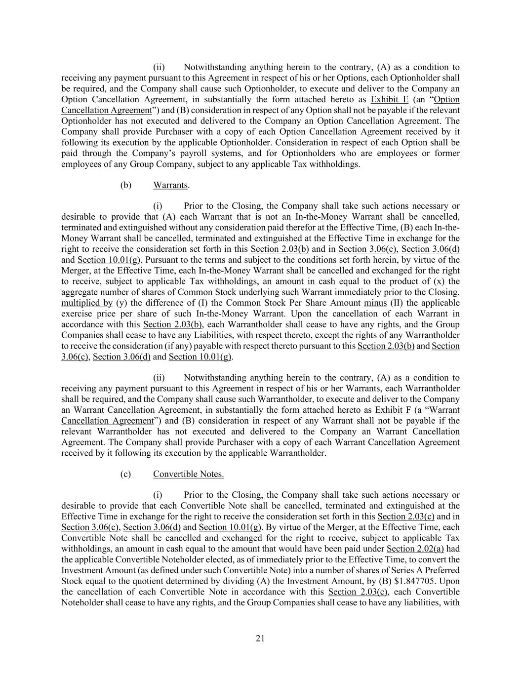 21 (ii) Notwithstanding anything herein to the contrary, (A) as a condition to receiving any payment pursuant to this Agreement in respect of his or her Options, each Optionholder shall be required, and the Company shall cause such Optionholder, to execute and deliver to the Company an Option Cancellation Agreement, in substantially the form attached hereto as Exhibit E (an “Option Cancellation Agreement”) and (B) consideration in respect of any Option shall not be payable if the relevant Optionholder has not executed and delivered to the Company an Option Cancellation Agreement. The Company shall provide Purchaser with a copy of each Option Cancellation Agreement received by it following its execution by the applicable Optionholder. Consideration in respect of each Option shall be paid through the Company’s payroll systems, and for Optionholders who are employees or former employees of any Group Company, subject to any applicable Tax withholdings. (b) Warrants. (i) Prior to the Closing, the Company shall take such actions necessary or desirable to provide that (A) each Warrant that is not an In-the-Money Warrant shall be cancelled, terminated and extinguished without any consideration paid therefor at the Effective Time, (B) each In-the- Money Warrant shall be cancelled, terminated and extinguished at the Effective Time in exchange for the right to receive the consideration set forth in this Section 2.03(b) and in Section 3.06(c), Section 3.06(d) and Section 10.01(g). Pursuant to the terms and subject to the conditions set forth herein, by virtue of the Merger, at the Effective Time, each In-the-Money Warrant shall be cancelled and exchanged for the right to receive, subject to applicable Tax withholdings, an amount in cash equal to the product of (x) the aggregate number of shares of Common Stock underlying such Warrant immediately prior to the Closing, multiplied by (y) the difference of (I) the Common Stock Per Share Amount minus (II) the applicable exercise price per share of such In-the-Money Warrant. Upon the cancellation of each Warrant in accordance with this Section 2.03(b), each Warrantholder shall cease to have any rights, and the Group Companies shall cease to have any Liabilities, with respect thereto, except the rights of any Warrantholder to receive the consideration (if any) payable with respect thereto pursuant to this Section 2.03(b) and Section 3.06(c), Section 3.06(d) and Section 10.01(g). (ii) Notwithstanding anything herein to the contrary, (A) as a condition to receiving any payment pursuant to this Agreement in respect of his or her Warrants, each Warrantholder shall be required, and the Company shall cause such Warrantholder, to execute and deliver to the Company an Warrant Cancellation Agreement, in substantially the form attached hereto as Exhibit F (a “Warrant Cancellation Agreement”) and (B) consideration in respect of any Warrant shall not be payable if the relevant Warrantholder has not executed and delivered to the Company an Warrant Cancellation Agreement. The Company shall provide Purchaser with a copy of each Warrant Cancellation Agreement received by it following its execution by the applicable Warrantholder. (c) Convertible Notes. (i) Prior to the Closing, the Company shall take such actions necessary or desirable to provide that each Convertible Note shall be cancelled, terminated and extinguished at the Effective Time in exchange for the right to receive the consideration set forth in this Section 2.03(c) and in Section 3.06(c), Section 3.06(d) and Section 10.01(g). By virtue of the Merger, at the Effective Time, each Convertible Note shall be cancelled and exchanged for the right to receive, subject to applicable Tax withholdings, an amount in cash equal to the amount that would have been paid under Section 2.02(a) had the applicable Convertible Noteholder elected, as of immediately prior to the Effective Time, to convert the Investment Amount (as defined under such Convertible Note) into a number of shares of Series A Preferred Stock equal to the quotient determined by dividing (A) the Investment Amount, by (B) $1.847705. Upon the cancellation of each Convertible Note in accordance with this Section 2.03(c), each Convertible Noteholder shall cease to have any rights, and the Group Companies shall cease to have any liabilities, with