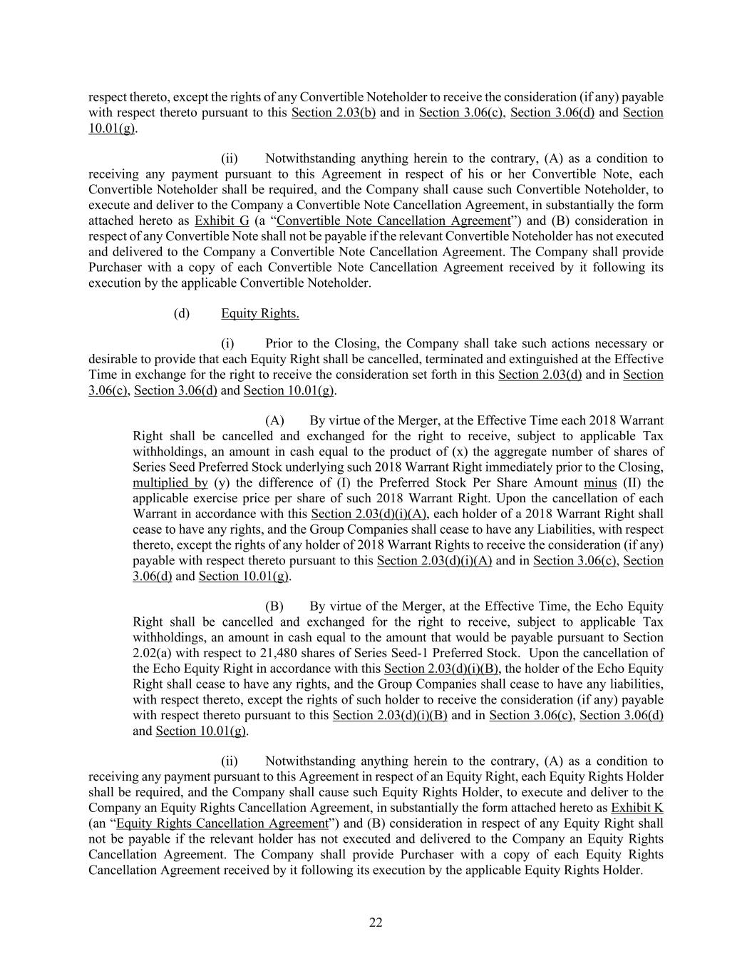 22 respect thereto, except the rights of any Convertible Noteholder to receive the consideration (if any) payable with respect thereto pursuant to this Section 2.03(b) and in Section 3.06(c), Section 3.06(d) and Section 10.01(g). (ii) Notwithstanding anything herein to the contrary, (A) as a condition to receiving any payment pursuant to this Agreement in respect of his or her Convertible Note, each Convertible Noteholder shall be required, and the Company shall cause such Convertible Noteholder, to execute and deliver to the Company a Convertible Note Cancellation Agreement, in substantially the form attached hereto as Exhibit G (a “Convertible Note Cancellation Agreement”) and (B) consideration in respect of any Convertible Note shall not be payable if the relevant Convertible Noteholder has not executed and delivered to the Company a Convertible Note Cancellation Agreement. The Company shall provide Purchaser with a copy of each Convertible Note Cancellation Agreement received by it following its execution by the applicable Convertible Noteholder. (d) Equity Rights. (i) Prior to the Closing, the Company shall take such actions necessary or desirable to provide that each Equity Right shall be cancelled, terminated and extinguished at the Effective Time in exchange for the right to receive the consideration set forth in this Section 2.03(d) and in Section 3.06(c), Section 3.06(d) and Section 10.01(g). (A) By virtue of the Merger, at the Effective Time each 2018 Warrant Right shall be cancelled and exchanged for the right to receive, subject to applicable Tax withholdings, an amount in cash equal to the product of (x) the aggregate number of shares of Series Seed Preferred Stock underlying such 2018 Warrant Right immediately prior to the Closing, multiplied by (y) the difference of (I) the Preferred Stock Per Share Amount minus (II) the applicable exercise price per share of such 2018 Warrant Right. Upon the cancellation of each Warrant in accordance with this Section 2.03(d)(i)(A), each holder of a 2018 Warrant Right shall cease to have any rights, and the Group Companies shall cease to have any Liabilities, with respect thereto, except the rights of any holder of 2018 Warrant Rights to receive the consideration (if any) payable with respect thereto pursuant to this Section 2.03(d)(i)(A) and in Section 3.06(c), Section 3.06(d) and Section 10.01(g). (B) By virtue of the Merger, at the Effective Time, the Echo Equity Right shall be cancelled and exchanged for the right to receive, subject to applicable Tax withholdings, an amount in cash equal to the amount that would be payable pursuant to Section 2.02(a) with respect to 21,480 shares of Series Seed-1 Preferred Stock. Upon the cancellation of the Echo Equity Right in accordance with this Section 2.03(d)(i)(B), the holder of the Echo Equity Right shall cease to have any rights, and the Group Companies shall cease to have any liabilities, with respect thereto, except the rights of such holder to receive the consideration (if any) payable with respect thereto pursuant to this Section 2.03(d)(i)(B) and in Section 3.06(c), Section 3.06(d) and Section 10.01(g). (ii) Notwithstanding anything herein to the contrary, (A) as a condition to receiving any payment pursuant to this Agreement in respect of an Equity Right, each Equity Rights Holder shall be required, and the Company shall cause such Equity Rights Holder, to execute and deliver to the Company an Equity Rights Cancellation Agreement, in substantially the form attached hereto as Exhibit K (an “Equity Rights Cancellation Agreement”) and (B) consideration in respect of any Equity Right shall not be payable if the relevant holder has not executed and delivered to the Company an Equity Rights Cancellation Agreement. The Company shall provide Purchaser with a copy of each Equity Rights Cancellation Agreement received by it following its execution by the applicable Equity Rights Holder.