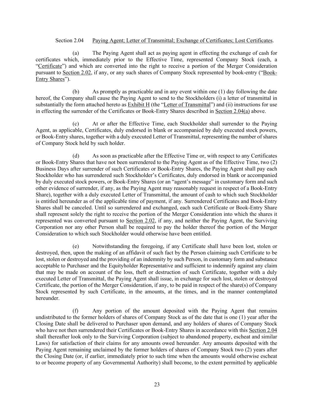 23 Section 2.04 Paying Agent; Letter of Transmittal; Exchange of Certificates; Lost Certificates. (a) The Paying Agent shall act as paying agent in effecting the exchange of cash for certificates which, immediately prior to the Effective Time, represented Company Stock (each, a “Certificate”) and which are converted into the right to receive a portion of the Merger Consideration pursuant to Section 2.02, if any, or any such shares of Company Stock represented by book-entry (“Book- Entry Shares”). (b) As promptly as practicable and in any event within one (1) day following the date hereof, the Company shall cause the Paying Agent to send to the Stockholders (i) a letter of transmittal in substantially the form attached hereto as Exhibit H (the “Letter of Transmittal”) and (ii) instructions for use in effecting the surrender of the Certificates or Book-Entry Shares described in Section 2.04(a) above. (c) At or after the Effective Time, each Stockholder shall surrender to the Paying Agent, as applicable, Certificates, duly endorsed in blank or accompanied by duly executed stock powers, or Book-Entry shares, together with a duly executed Letter of Transmittal, representing the number of shares of Company Stock held by such holder. (d) As soon as practicable after the Effective Time or, with respect to any Certificates or Book-Entry Shares that have not been surrendered to the Paying Agent as of the Effective Time, two (2) Business Days after surrender of such Certificates or Book-Entry Shares, the Paying Agent shall pay each Stockholder who has surrendered such Stockholder’s Certificates, duly endorsed in blank or accompanied by duly executed stock powers, or Book-Entry Shares (or an “agent’s message” in customary form and such other evidence of surrender, if any, as the Paying Agent may reasonably request in respect of a Book-Entry Share), together with a duly executed Letter of Transmittal, the amount of cash to which such Stockholder is entitled hereunder as of the applicable time of payment, if any. Surrendered Certificates and Book-Entry Shares shall be canceled. Until so surrendered and exchanged, each such Certificate or Book-Entry Share shall represent solely the right to receive the portion of the Merger Consideration into which the shares it represented was converted pursuant to Section 2.02, if any, and neither the Paying Agent, the Surviving Corporation nor any other Person shall be required to pay the holder thereof the portion of the Merger Consideration to which such Stockholder would otherwise have been entitled. (e) Notwithstanding the foregoing, if any Certificate shall have been lost, stolen or destroyed, then, upon the making of an affidavit of such fact by the Person claiming such Certificate to be lost, stolen or destroyed and the providing of an indemnity by such Person, in customary form and substance acceptable to Purchaser and the Equityholder Representative and sufficient to indemnify against any claim that may be made on account of the loss, theft or destruction of such Certificate, together with a duly executed Letter of Transmittal, the Paying Agent shall issue, in exchange for such lost, stolen or destroyed Certificate, the portion of the Merger Consideration, if any, to be paid in respect of the share(s) of Company Stock represented by such Certificate, in the amounts, at the times, and in the manner contemplated hereunder. (f) Any portion of the amount deposited with the Paying Agent that remains undistributed to the former holders of shares of Company Stock as of the date that is one (1) year after the Closing Date shall be delivered to Purchaser upon demand, and any holders of shares of Company Stock who have not then surrendered their Certificates or Book-Entry Shares in accordance with this Section 2.04 shall thereafter look only to the Surviving Corporation (subject to abandoned property, escheat and similar Laws) for satisfaction of their claims for any amounts owed hereunder. Any amounts deposited with the Paying Agent remaining unclaimed by the former holders of shares of Company Stock two (2) years after the Closing Date (or, if earlier, immediately prior to such time when the amounts would otherwise escheat to or become property of any Governmental Authority) shall become, to the extent permitted by applicable