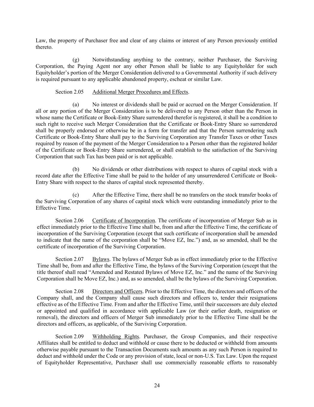 24 Law, the property of Purchaser free and clear of any claims or interest of any Person previously entitled thereto. (g) Notwithstanding anything to the contrary, neither Purchaser, the Surviving Corporation, the Paying Agent nor any other Person shall be liable to any Equityholder for such Equityholder’s portion of the Merger Consideration delivered to a Governmental Authority if such delivery is required pursuant to any applicable abandoned property, escheat or similar Law. Section 2.05 Additional Merger Procedures and Effects. (a) No interest or dividends shall be paid or accrued on the Merger Consideration. If all or any portion of the Merger Consideration is to be delivered to any Person other than the Person in whose name the Certificate or Book-Entry Share surrendered therefor is registered, it shall be a condition to such right to receive such Merger Consideration that the Certificate or Book-Entry Share so surrendered shall be properly endorsed or otherwise be in a form for transfer and that the Person surrendering such Certificate or Book-Entry Share shall pay to the Surviving Corporation any Transfer Taxes or other Taxes required by reason of the payment of the Merger Consideration to a Person other than the registered holder of the Certificate or Book-Entry Share surrendered, or shall establish to the satisfaction of the Surviving Corporation that such Tax has been paid or is not applicable. (b) No dividends or other distributions with respect to shares of capital stock with a record date after the Effective Time shall be paid to the holder of any unsurrendered Certificate or Book- Entry Share with respect to the shares of capital stock represented thereby. (c) After the Effective Time, there shall be no transfers on the stock transfer books of the Surviving Corporation of any shares of capital stock which were outstanding immediately prior to the Effective Time. Section 2.06 Certificate of Incorporation. The certificate of incorporation of Merger Sub as in effect immediately prior to the Effective Time shall be, from and after the Effective Time, the certificate of incorporation of the Surviving Corporation (except that such certificate of incorporation shall be amended to indicate that the name of the corporation shall be “Move EZ, Inc.”) and, as so amended, shall be the certificate of incorporation of the Surviving Corporation. Section 2.07 Bylaws. The bylaws of Merger Sub as in effect immediately prior to the Effective Time shall be, from and after the Effective Time, the bylaws of the Surviving Corporation (except that the title thereof shall read “Amended and Restated Bylaws of Move EZ, Inc.” and the name of the Surviving Corporation shall be Move EZ, Inc.) and, as so amended, shall be the bylaws of the Surviving Corporation. Section 2.08 Directors and Officers. Prior to the Effective Time, the directors and officers of the Company shall, and the Company shall cause such directors and officers to, tender their resignations effective as of the Effective Time. From and after the Effective Time, until their successors are duly elected or appointed and qualified in accordance with applicable Law (or their earlier death, resignation or removal), the directors and officers of Merger Sub immediately prior to the Effective Time shall be the directors and officers, as applicable, of the Surviving Corporation. Section 2.09 Withholding Rights. Purchaser, the Group Companies, and their respective Affiliates shall be entitled to deduct and withhold or cause there to be deducted or withheld from amounts otherwise payable pursuant to the Transaction Documents such amounts as any such Person is required to deduct and withhold under the Code or any provision of state, local or non-U.S. Tax Law. Upon the request of Equityholder Representative, Purchaser shall use commercially reasonable efforts to reasonably