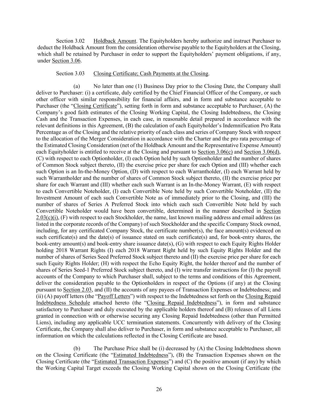 26 Section 3.02 Holdback Amount. The Equityholders hereby authorize and instruct Purchaser to deduct the Holdback Amount from the consideration otherwise payable to the Equityholders at the Closing, which shall be retained by Purchaser in order to support the Equityholders’ payment obligations, if any, under Section 3.06. Section 3.03 Closing Certificate; Cash Payments at the Closing. (a) No later than one (1) Business Day prior to the Closing Date, the Company shall deliver to Purchaser: (i) a certificate, duly certified by the Chief Financial Officer of the Company, or such other officer with similar responsibility for financial affairs, and in form and substance acceptable to Purchaser (the “Closing Certificate”), setting forth in form and substance acceptable to Purchaser, (A) the Company’s good faith estimates of the Closing Working Capital, the Closing Indebtedness, the Closing Cash and the Transaction Expenses, in each case, in reasonable detail prepared in accordance with the relevant definitions in this Agreement, (B) the calculation of each Equityholder’s Indemnification Pro Rata Percentage as of the Closing and the relative priority of each class and series of Company Stock with respect to the allocation of the Merger Consideration in accordance with the Charter and the pro rata percentage of the Estimated Closing Consideration (net of the Holdback Amount and the Representative Expense Amount) each Equityholder is entitled to receive at the Closing and pursuant to Section 3.06(c) and Section 3.06(d), (C) with respect to each Optionholder, (I) each Option held by such Optionholder and the number of shares of Common Stock subject thereto, (II) the exercise price per share for each Option and (III) whether each such Option is an In-the-Money Option, (D) with respect to each Warrantholder, (I) each Warrant held by such Warrantholder and the number of shares of Common Stock subject thereto, (II) the exercise price per share for each Warrant and (III) whether each such Warrant is an In-the-Money Warrant, (E) with respect to each Convertible Noteholder, (I) each Convertible Note held by such Convertible Noteholder, (II) the Investment Amount of each such Convertible Note as of immediately prior to the Closing, and (III) the number of shares of Series A Preferred Stock into which each such Convertible Note held by such Convertible Noteholder would have been convertible, determined in the manner described in Section 2.03(c)(i), (F) with respect to each Stockholder, the name, last known mailing address and email address (as listed in the corporate records of the Company) of such Stockholder and the specific Company Stock owned, including, for any certificated Company Stock, the certificate number(s), the face amount(s) evidenced on such certificate(s) and the date(s) of issuance stated on such certificate(s) and, for book-entry shares, the book-entry amount(s) and book-entry share issuance date(s), (G) with respect to each Equity Rights Holder holding 2018 Warrant Rights (I) each 2018 Warrant Right held by such Equity Rights Holder and the number of shares of Series Seed Preferred Stock subject thereto and (II) the exercise price per share for each such Equity Rights Holder; (H) with respect the Echo Equity Right, the holder thereof and the number of shares of Series Seed-1 Preferred Stock subject thereto, and (I) wire transfer instructions for (I) the payroll accounts of the Company to which Purchaser shall, subject to the terms and conditions of this Agreement, deliver the consideration payable to the Optionholders in respect of the Options (if any) at the Closing pursuant to Section 2.03, and (II) the accounts of any payees of Transaction Expenses or Indebtedness; and (ii) (A) payoff letters (the “Payoff Letters”) with respect to the Indebtedness set forth on the Closing Repaid Indebtedness Schedule attached hereto (the “Closing Repaid Indebtedness”), in form and substance satisfactory to Purchaser and duly executed by the applicable holders thereof and (B) releases of all Liens granted in connection with or otherwise securing any Closing Repaid Indebtedness (other than Permitted Liens), including any applicable UCC termination statements. Concurrently with delivery of the Closing Certificate, the Company shall also deliver to Purchaser, in form and substance acceptable to Purchaser, all information on which the calculations reflected in the Closing Certificate are based. (b) The Purchase Price shall be (i) decreased by (A) the Closing Indebtedness shown on the Closing Certificate (the “Estimated Indebtedness”), (B) the Transaction Expenses shown on the Closing Certificate (the “Estimated Transaction Expenses”) and (C) the positive amount (if any) by which the Working Capital Target exceeds the Closing Working Capital shown on the Closing Certificate (the