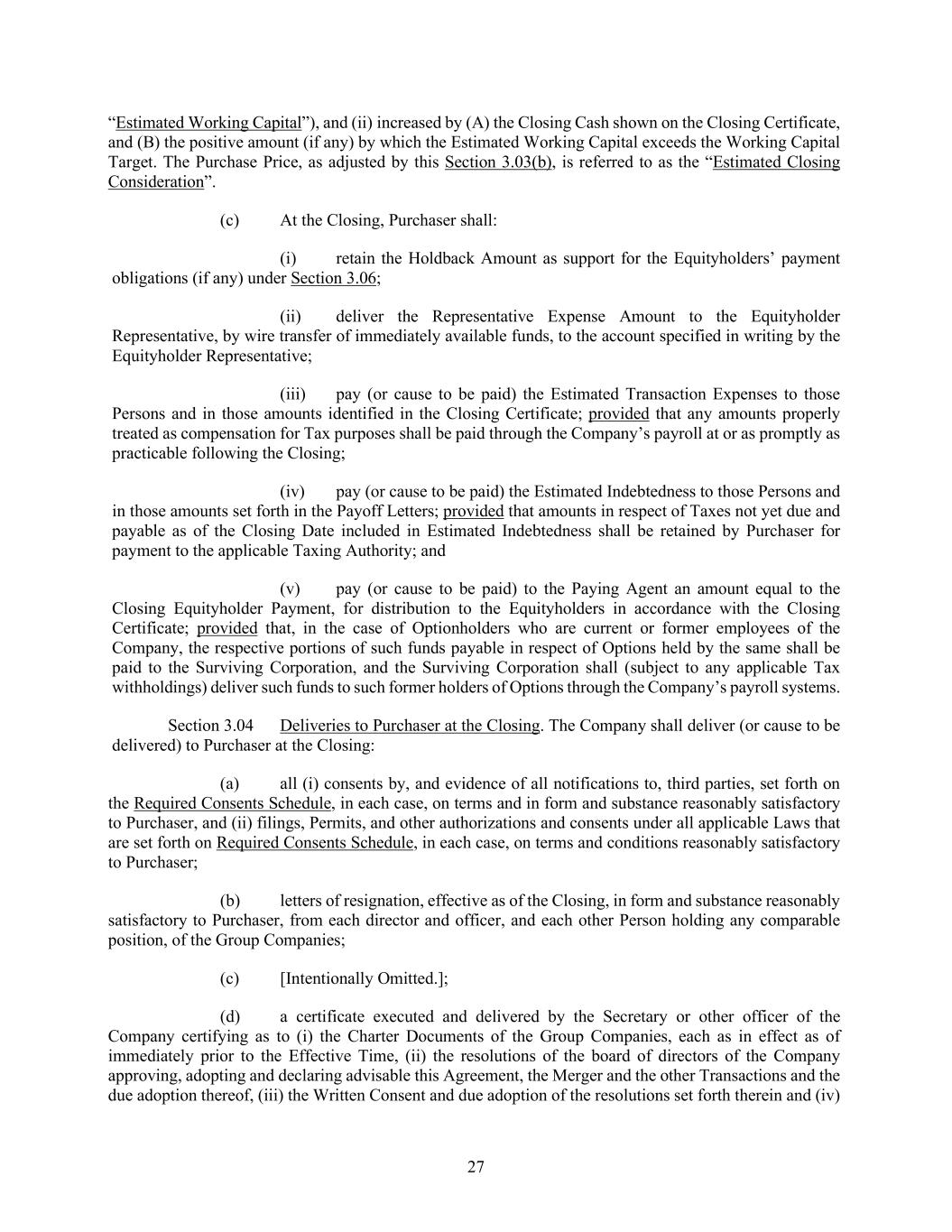 27 “Estimated Working Capital”), and (ii) increased by (A) the Closing Cash shown on the Closing Certificate, and (B) the positive amount (if any) by which the Estimated Working Capital exceeds the Working Capital Target. The Purchase Price, as adjusted by this Section 3.03(b), is referred to as the “Estimated Closing Consideration”. (c) At the Closing, Purchaser shall: (i) retain the Holdback Amount as support for the Equityholders’ payment obligations (if any) under Section 3.06; (ii) deliver the Representative Expense Amount to the Equityholder Representative, by wire transfer of immediately available funds, to the account specified in writing by the Equityholder Representative; (iii) pay (or cause to be paid) the Estimated Transaction Expenses to those Persons and in those amounts identified in the Closing Certificate; provided that any amounts properly treated as compensation for Tax purposes shall be paid through the Company’s payroll at or as promptly as practicable following the Closing; (iv) pay (or cause to be paid) the Estimated Indebtedness to those Persons and in those amounts set forth in the Payoff Letters; provided that amounts in respect of Taxes not yet due and payable as of the Closing Date included in Estimated Indebtedness shall be retained by Purchaser for payment to the applicable Taxing Authority; and (v) pay (or cause to be paid) to the Paying Agent an amount equal to the Closing Equityholder Payment, for distribution to the Equityholders in accordance with the Closing Certificate; provided that, in the case of Optionholders who are current or former employees of the Company, the respective portions of such funds payable in respect of Options held by the same shall be paid to the Surviving Corporation, and the Surviving Corporation shall (subject to any applicable Tax withholdings) deliver such funds to such former holders of Options through the Company’s payroll systems. Section 3.04 Deliveries to Purchaser at the Closing. The Company shall deliver (or cause to be delivered) to Purchaser at the Closing: (a) all (i) consents by, and evidence of all notifications to, third parties, set forth on the Required Consents Schedule, in each case, on terms and in form and substance reasonably satisfactory to Purchaser, and (ii) filings, Permits, and other authorizations and consents under all applicable Laws that are set forth on Required Consents Schedule, in each case, on terms and conditions reasonably satisfactory to Purchaser; (b) letters of resignation, effective as of the Closing, in form and substance reasonably satisfactory to Purchaser, from each director and officer, and each other Person holding any comparable position, of the Group Companies; (c) [Intentionally Omitted.]; (d) a certificate executed and delivered by the Secretary or other officer of the Company certifying as to (i) the Charter Documents of the Group Companies, each as in effect as of immediately prior to the Effective Time, (ii) the resolutions of the board of directors of the Company approving, adopting and declaring advisable this Agreement, the Merger and the other Transactions and the due adoption thereof, (iii) the Written Consent and due adoption of the resolutions set forth therein and (iv)