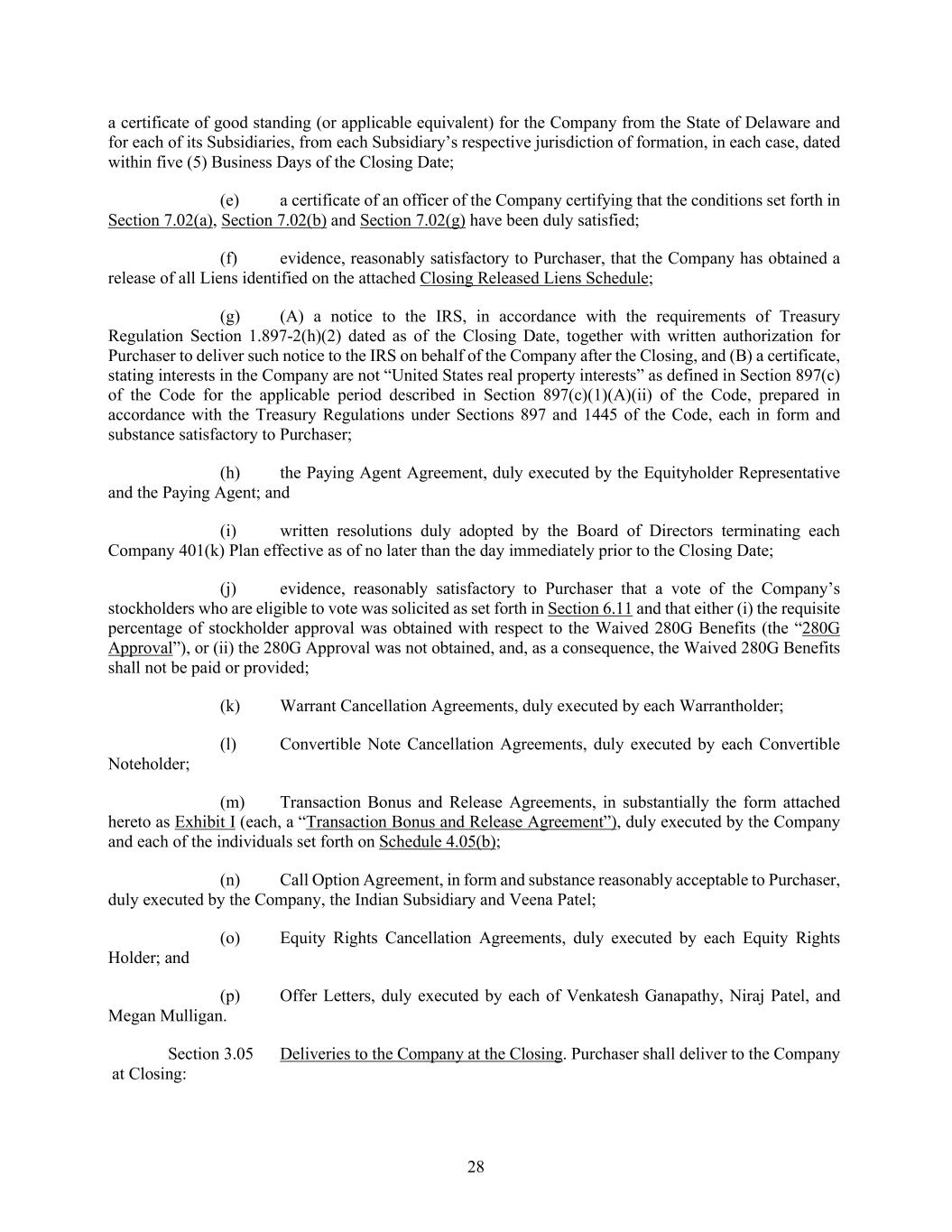 28 a certificate of good standing (or applicable equivalent) for the Company from the State of Delaware and for each of its Subsidiaries, from each Subsidiary’s respective jurisdiction of formation, in each case, dated within five (5) Business Days of the Closing Date; (e) a certificate of an officer of the Company certifying that the conditions set forth in Section 7.02(a), Section 7.02(b) and Section 7.02(g) have been duly satisfied; (f) evidence, reasonably satisfactory to Purchaser, that the Company has obtained a release of all Liens identified on the attached Closing Released Liens Schedule; (g) (A) a notice to the IRS, in accordance with the requirements of Treasury Regulation Section 1.897-2(h)(2) dated as of the Closing Date, together with written authorization for Purchaser to deliver such notice to the IRS on behalf of the Company after the Closing, and (B) a certificate, stating interests in the Company are not “United States real property interests” as defined in Section 897(c) of the Code for the applicable period described in Section 897(c)(1)(A)(ii) of the Code, prepared in accordance with the Treasury Regulations under Sections 897 and 1445 of the Code, each in form and substance satisfactory to Purchaser; (h) the Paying Agent Agreement, duly executed by the Equityholder Representative and the Paying Agent; and (i) written resolutions duly adopted by the Board of Directors terminating each Company 401(k) Plan effective as of no later than the day immediately prior to the Closing Date; (j) evidence, reasonably satisfactory to Purchaser that a vote of the Company’s stockholders who are eligible to vote was solicited as set forth in Section 6.11 and that either (i) the requisite percentage of stockholder approval was obtained with respect to the Waived 280G Benefits (the “280G Approval”), or (ii) the 280G Approval was not obtained, and, as a consequence, the Waived 280G Benefits shall not be paid or provided; (k) Warrant Cancellation Agreements, duly executed by each Warrantholder; (l) Convertible Note Cancellation Agreements, duly executed by each Convertible Noteholder; (m) Transaction Bonus and Release Agreements, in substantially the form attached hereto as Exhibit I (each, a “Transaction Bonus and Release Agreement”), duly executed by the Company and each of the individuals set forth on Schedule 4.05(b); (n) Call Option Agreement, in form and substance reasonably acceptable to Purchaser, duly executed by the Company, the Indian Subsidiary and Veena Patel; (o) Equity Rights Cancellation Agreements, duly executed by each Equity Rights Holder; and (p) Offer Letters, duly executed by each of Venkatesh Ganapathy, Niraj Patel, and Megan Mulligan. Section 3.05 Deliveries to the Company at the Closing. Purchaser shall deliver to the Company at Closing: