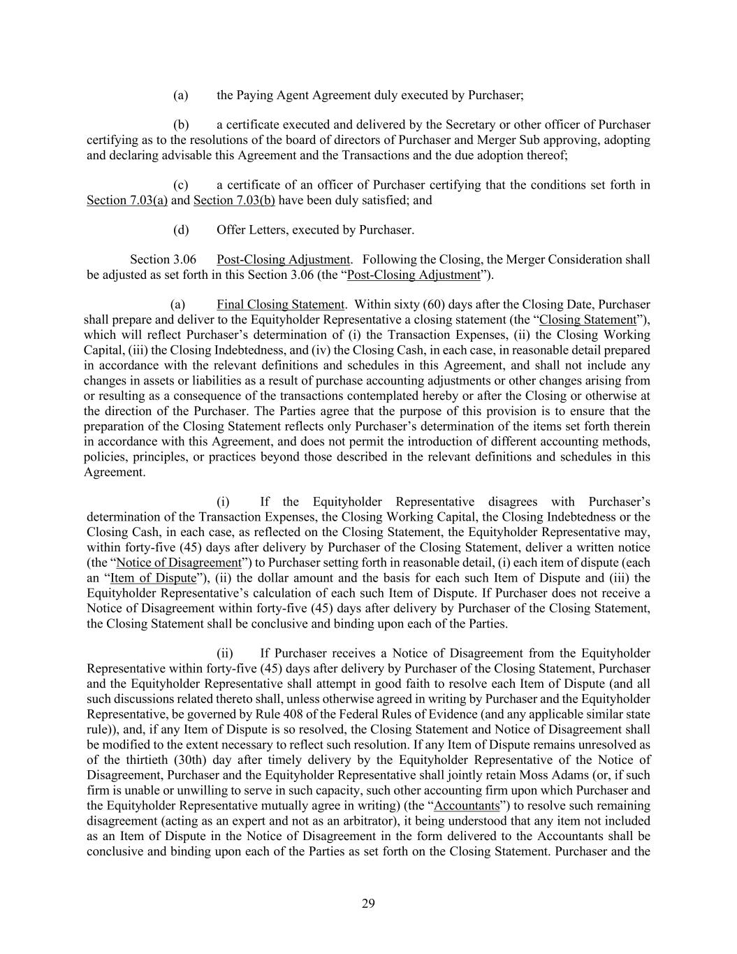 29 (a) the Paying Agent Agreement duly executed by Purchaser; (b) a certificate executed and delivered by the Secretary or other officer of Purchaser certifying as to the resolutions of the board of directors of Purchaser and Merger Sub approving, adopting and declaring advisable this Agreement and the Transactions and the due adoption thereof; (c) a certificate of an officer of Purchaser certifying that the conditions set forth in Section 7.03(a) and Section 7.03(b) have been duly satisfied; and (d) Offer Letters, executed by Purchaser. Section 3.06 Post-Closing Adjustment. Following the Closing, the Merger Consideration shall be adjusted as set forth in this Section 3.06 (the “Post-Closing Adjustment”). (a) Final Closing Statement. Within sixty (60) days after the Closing Date, Purchaser shall prepare and deliver to the Equityholder Representative a closing statement (the “Closing Statement”), which will reflect Purchaser’s determination of (i) the Transaction Expenses, (ii) the Closing Working Capital, (iii) the Closing Indebtedness, and (iv) the Closing Cash, in each case, in reasonable detail prepared in accordance with the relevant definitions and schedules in this Agreement, and shall not include any changes in assets or liabilities as a result of purchase accounting adjustments or other changes arising from or resulting as a consequence of the transactions contemplated hereby or after the Closing or otherwise at the direction of the Purchaser. The Parties agree that the purpose of this provision is to ensure that the preparation of the Closing Statement reflects only Purchaser’s determination of the items set forth therein in accordance with this Agreement, and does not permit the introduction of different accounting methods, policies, principles, or practices beyond those described in the relevant definitions and schedules in this Agreement. (i) If the Equityholder Representative disagrees with Purchaser’s determination of the Transaction Expenses, the Closing Working Capital, the Closing Indebtedness or the Closing Cash, in each case, as reflected on the Closing Statement, the Equityholder Representative may, within forty-five (45) days after delivery by Purchaser of the Closing Statement, deliver a written notice (the “Notice of Disagreement”) to Purchaser setting forth in reasonable detail, (i) each item of dispute (each an “Item of Dispute”), (ii) the dollar amount and the basis for each such Item of Dispute and (iii) the Equityholder Representative’s calculation of each such Item of Dispute. If Purchaser does not receive a Notice of Disagreement within forty-five (45) days after delivery by Purchaser of the Closing Statement, the Closing Statement shall be conclusive and binding upon each of the Parties. (ii) If Purchaser receives a Notice of Disagreement from the Equityholder Representative within forty-five (45) days after delivery by Purchaser of the Closing Statement, Purchaser and the Equityholder Representative shall attempt in good faith to resolve each Item of Dispute (and all such discussions related thereto shall, unless otherwise agreed in writing by Purchaser and the Equityholder Representative, be governed by Rule 408 of the Federal Rules of Evidence (and any applicable similar state rule)), and, if any Item of Dispute is so resolved, the Closing Statement and Notice of Disagreement shall be modified to the extent necessary to reflect such resolution. If any Item of Dispute remains unresolved as of the thirtieth (30th) day after timely delivery by the Equityholder Representative of the Notice of Disagreement, Purchaser and the Equityholder Representative shall jointly retain Moss Adams (or, if such firm is unable or unwilling to serve in such capacity, such other accounting firm upon which Purchaser and the Equityholder Representative mutually agree in writing) (the “Accountants”) to resolve such remaining disagreement (acting as an expert and not as an arbitrator), it being understood that any item not included as an Item of Dispute in the Notice of Disagreement in the form delivered to the Accountants shall be conclusive and binding upon each of the Parties as set forth on the Closing Statement. Purchaser and the