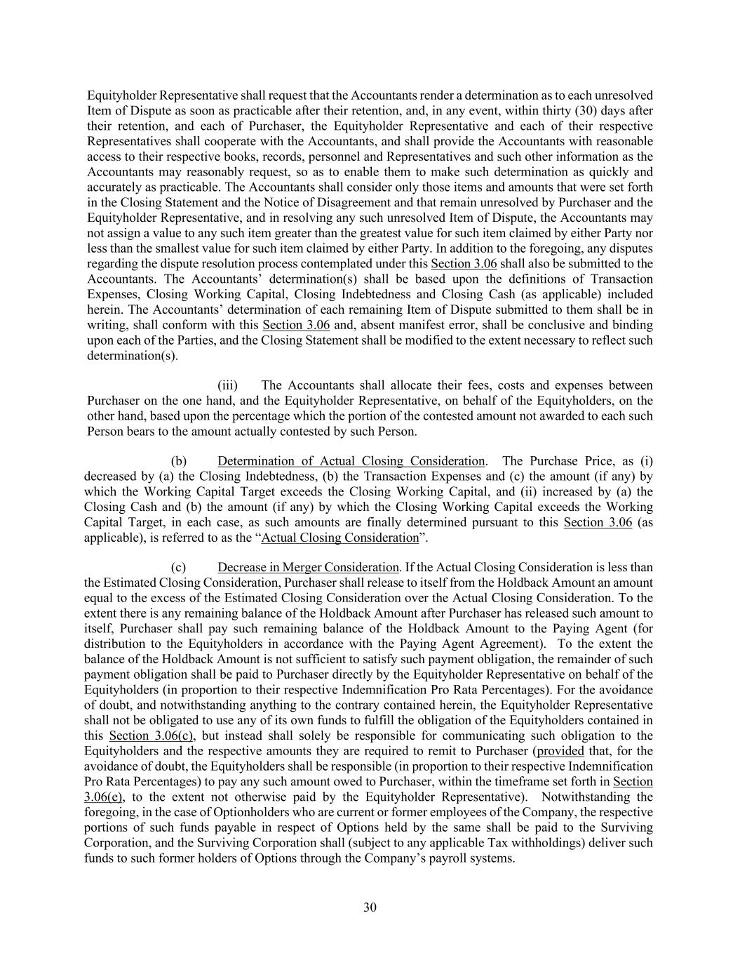 30 Equityholder Representative shall request that the Accountants render a determination as to each unresolved Item of Dispute as soon as practicable after their retention, and, in any event, within thirty (30) days after their retention, and each of Purchaser, the Equityholder Representative and each of their respective Representatives shall cooperate with the Accountants, and shall provide the Accountants with reasonable access to their respective books, records, personnel and Representatives and such other information as the Accountants may reasonably request, so as to enable them to make such determination as quickly and accurately as practicable. The Accountants shall consider only those items and amounts that were set forth in the Closing Statement and the Notice of Disagreement and that remain unresolved by Purchaser and the Equityholder Representative, and in resolving any such unresolved Item of Dispute, the Accountants may not assign a value to any such item greater than the greatest value for such item claimed by either Party nor less than the smallest value for such item claimed by either Party. In addition to the foregoing, any disputes regarding the dispute resolution process contemplated under this Section 3.06 shall also be submitted to the Accountants. The Accountants’ determination(s) shall be based upon the definitions of Transaction Expenses, Closing Working Capital, Closing Indebtedness and Closing Cash (as applicable) included herein. The Accountants’ determination of each remaining Item of Dispute submitted to them shall be in writing, shall conform with this Section 3.06 and, absent manifest error, shall be conclusive and binding upon each of the Parties, and the Closing Statement shall be modified to the extent necessary to reflect such determination(s). (iii) The Accountants shall allocate their fees, costs and expenses between Purchaser on the one hand, and the Equityholder Representative, on behalf of the Equityholders, on the other hand, based upon the percentage which the portion of the contested amount not awarded to each such Person bears to the amount actually contested by such Person. (b) Determination of Actual Closing Consideration. The Purchase Price, as (i) decreased by (a) the Closing Indebtedness, (b) the Transaction Expenses and (c) the amount (if any) by which the Working Capital Target exceeds the Closing Working Capital, and (ii) increased by (a) the Closing Cash and (b) the amount (if any) by which the Closing Working Capital exceeds the Working Capital Target, in each case, as such amounts are finally determined pursuant to this Section 3.06 (as applicable), is referred to as the “Actual Closing Consideration”. (c) Decrease in Merger Consideration. If the Actual Closing Consideration is less than the Estimated Closing Consideration, Purchaser shall release to itself from the Holdback Amount an amount equal to the excess of the Estimated Closing Consideration over the Actual Closing Consideration. To the extent there is any remaining balance of the Holdback Amount after Purchaser has released such amount to itself, Purchaser shall pay such remaining balance of the Holdback Amount to the Paying Agent (for distribution to the Equityholders in accordance with the Paying Agent Agreement). To the extent the balance of the Holdback Amount is not sufficient to satisfy such payment obligation, the remainder of such payment obligation shall be paid to Purchaser directly by the Equityholder Representative on behalf of the Equityholders (in proportion to their respective Indemnification Pro Rata Percentages). For the avoidance of doubt, and notwithstanding anything to the contrary contained herein, the Equityholder Representative shall not be obligated to use any of its own funds to fulfill the obligation of the Equityholders contained in this Section 3.06(c), but instead shall solely be responsible for communicating such obligation to the Equityholders and the respective amounts they are required to remit to Purchaser (provided that, for the avoidance of doubt, the Equityholders shall be responsible (in proportion to their respective Indemnification Pro Rata Percentages) to pay any such amount owed to Purchaser, within the timeframe set forth in Section 3.06(e), to the extent not otherwise paid by the Equityholder Representative). Notwithstanding the foregoing, in the case of Optionholders who are current or former employees of the Company, the respective portions of such funds payable in respect of Options held by the same shall be paid to the Surviving Corporation, and the Surviving Corporation shall (subject to any applicable Tax withholdings) deliver such funds to such former holders of Options through the Company’s payroll systems.