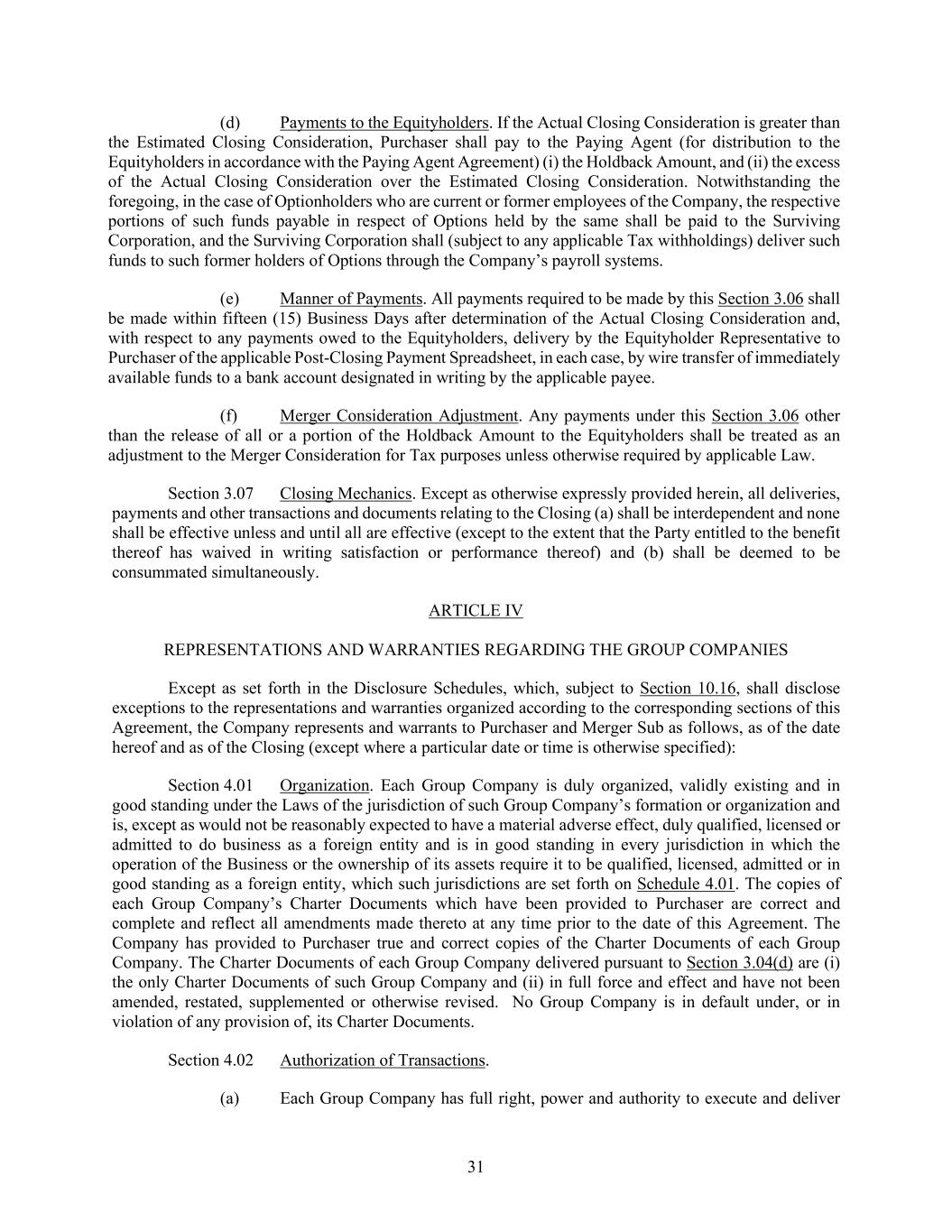 31 (d) Payments to the Equityholders. If the Actual Closing Consideration is greater than the Estimated Closing Consideration, Purchaser shall pay to the Paying Agent (for distribution to the Equityholders in accordance with the Paying Agent Agreement) (i) the Holdback Amount, and (ii) the excess of the Actual Closing Consideration over the Estimated Closing Consideration. Notwithstanding the foregoing, in the case of Optionholders who are current or former employees of the Company, the respective portions of such funds payable in respect of Options held by the same shall be paid to the Surviving Corporation, and the Surviving Corporation shall (subject to any applicable Tax withholdings) deliver such funds to such former holders of Options through the Company’s payroll systems. (e) Manner of Payments. All payments required to be made by this Section 3.06 shall be made within fifteen (15) Business Days after determination of the Actual Closing Consideration and, with respect to any payments owed to the Equityholders, delivery by the Equityholder Representative to Purchaser of the applicable Post-Closing Payment Spreadsheet, in each case, by wire transfer of immediately available funds to a bank account designated in writing by the applicable payee. (f) Merger Consideration Adjustment. Any payments under this Section 3.06 other than the release of all or a portion of the Holdback Amount to the Equityholders shall be treated as an adjustment to the Merger Consideration for Tax purposes unless otherwise required by applicable Law. Section 3.07 Closing Mechanics. Except as otherwise expressly provided herein, all deliveries, payments and other transactions and documents relating to the Closing (a) shall be interdependent and none shall be effective unless and until all are effective (except to the extent that the Party entitled to the benefit thereof has waived in writing satisfaction or performance thereof) and (b) shall be deemed to be consummated simultaneously. ARTICLE IV REPRESENTATIONS AND WARRANTIES REGARDING THE GROUP COMPANIES Except as set forth in the Disclosure Schedules, which, subject to Section 10.16, shall disclose exceptions to the representations and warranties organized according to the corresponding sections of this Agreement, the Company represents and warrants to Purchaser and Merger Sub as follows, as of the date hereof and as of the Closing (except where a particular date or time is otherwise specified): Section 4.01 Organization. Each Group Company is duly organized, validly existing and in good standing under the Laws of the jurisdiction of such Group Company’s formation or organization and is, except as would not be reasonably expected to have a material adverse effect, duly qualified, licensed or admitted to do business as a foreign entity and is in good standing in every jurisdiction in which the operation of the Business or the ownership of its assets require it to be qualified, licensed, admitted or in good standing as a foreign entity, which such jurisdictions are set forth on Schedule 4.01. The copies of each Group Company’s Charter Documents which have been provided to Purchaser are correct and complete and reflect all amendments made thereto at any time prior to the date of this Agreement. The Company has provided to Purchaser true and correct copies of the Charter Documents of each Group Company. The Charter Documents of each Group Company delivered pursuant to Section 3.04(d) are (i) the only Charter Documents of such Group Company and (ii) in full force and effect and have not been amended, restated, supplemented or otherwise revised. No Group Company is in default under, or in violation of any provision of, its Charter Documents. Section 4.02 Authorization of Transactions. (a) Each Group Company has full right, power and authority to execute and deliver