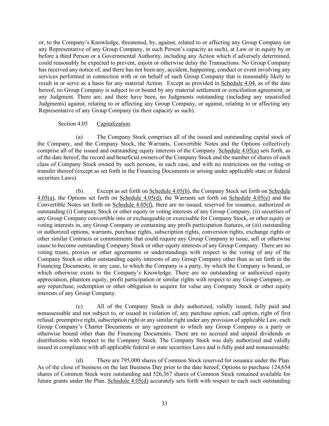 33 or, to the Company’s Knowledge, threatened, by, against, related to or affecting any Group Company (or any Representative of any Group Company, in such Person’s capacity as such), at Law or in equity by or before a third Person or a Governmental Authority, including any Action which if adversely determined, could reasonably be expected to prevent, enjoin or otherwise delay the Transactions. No Group Company has received any notice of, and there has not been any, accident, happening, conduct or event involving any services performed in connection with or on behalf of such Group Company that is reasonably likely to result in or serve as a basis for any material Action. Except as provided in Schedule 4.04, as of the date hereof, no Group Company is subject to or bound by any material settlement or conciliation agreement, or any Judgment. There are, and there have been, no Judgments outstanding (including any unsatisfied Judgments) against, relating to or affecting any Group Company, or against, relating to or affecting any Representative of any Group Company (in their capacity as such). Section 4.05 Capitalization. (a) The Company Stock comprises all of the issued and outstanding capital stock of the Company, and the Company Stock, the Warrants, Convertible Notes and the Options collectively comprise all of the issued and outstanding equity interests of the Company. Schedule 4.05(a) sets forth, as of the date hereof, the record and beneficial owners of the Company Stock and the number of shares of each class of Company Stock owned by such persons, in each case, and with no restrictions on the voting or transfer thereof (except as set forth in the Financing Documents or arising under applicable state or federal securities Laws). (b) Except as set forth on Schedule 4.05(b), the Company Stock set forth on Schedule 4.05(a), the Options set forth on Schedule 4.05(d), the Warrants set forth on Schedule 4.05(e) and the Convertible Notes set forth on Schedule 4.05(f), there are no issued, reserved for issuance, authorized or outstanding (i) Company Stock or other equity or voting interests of any Group Company, (ii) securities of any Group Company convertible into or exchangeable or exercisable for Company Stock, or other equity or voting interests in, any Group Company or containing any profit participation features, or (iii) outstanding or authorized options, warrants, purchase rights, subscription rights, conversion rights, exchange rights or other similar Contracts or commitments that could require any Group Company to issue, sell or otherwise cause to become outstanding Company Stock or other equity interests of any Group Company. There are no voting trusts, proxies or other agreements or understandings with respect to the voting of any of the Company Stock or other outstanding equity interests of any Group Company other than as set forth in the Financing Documents, in any case, to which the Company is a party, by which the Company is bound, or which otherwise exists to the Company’s Knowledge. There are no outstanding or authorized equity appreciation, phantom equity, profit participation or similar rights with respect to any Group Company, or any repurchase, redemption or other obligation to acquire for value any Company Stock or other equity interests of any Group Company. (c) All of the Company Stock is duly authorized, validly issued, fully paid and nonassessable and not subject to, or issued in violation of, any purchase option, call option, right of first refusal, preemptive right, subscription right or any similar right under any provision of applicable Law, each Group Company’s Charter Documents or any agreement to which any Group Company is a party or otherwise bound other than the Financing Documents. There are no accrued and unpaid dividends or distributions with respect to the Company Stock. The Company Stock was duly authorized and validly issued in compliance with all applicable federal or state securities Laws and is fully paid and nonassessable. (d) There are 795,000 shares of Common Stock reserved for issuance under the Plan. As of the close of business on the last Business Day prior to the date hereof, Options to purchase 124,654 shares of Common Stock were outstanding and 526,367 shares of Common Stock remained available for future grants under the Plan. Schedule 4.05(d) accurately sets forth with respect to each such outstanding