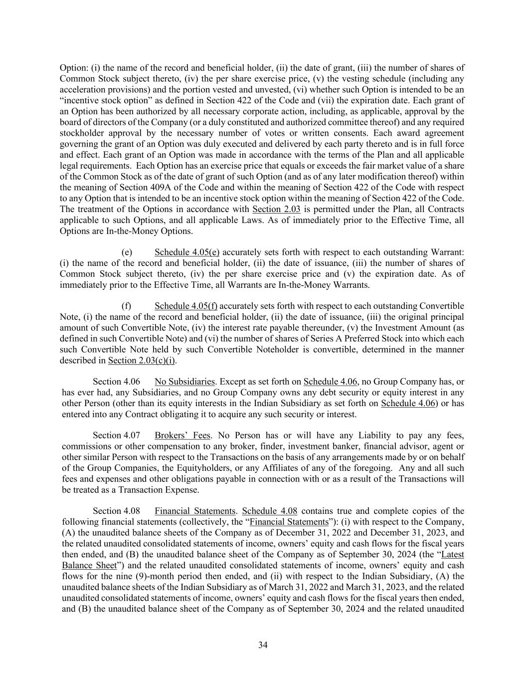 34 Option: (i) the name of the record and beneficial holder, (ii) the date of grant, (iii) the number of shares of Common Stock subject thereto, (iv) the per share exercise price, (v) the vesting schedule (including any acceleration provisions) and the portion vested and unvested, (vi) whether such Option is intended to be an “incentive stock option” as defined in Section 422 of the Code and (vii) the expiration date. Each grant of an Option has been authorized by all necessary corporate action, including, as applicable, approval by the board of directors of the Company (or a duly constituted and authorized committee thereof) and any required stockholder approval by the necessary number of votes or written consents. Each award agreement governing the grant of an Option was duly executed and delivered by each party thereto and is in full force and effect. Each grant of an Option was made in accordance with the terms of the Plan and all applicable legal requirements. Each Option has an exercise price that equals or exceeds the fair market value of a share of the Common Stock as of the date of grant of such Option (and as of any later modification thereof) within the meaning of Section 409A of the Code and within the meaning of Section 422 of the Code with respect to any Option that is intended to be an incentive stock option within the meaning of Section 422 of the Code. The treatment of the Options in accordance with Section 2.03 is permitted under the Plan, all Contracts applicable to such Options, and all applicable Laws. As of immediately prior to the Effective Time, all Options are In-the-Money Options. (e) Schedule 4.05(e) accurately sets forth with respect to each outstanding Warrant: (i) the name of the record and beneficial holder, (ii) the date of issuance, (iii) the number of shares of Common Stock subject thereto, (iv) the per share exercise price and (v) the expiration date. As of immediately prior to the Effective Time, all Warrants are In-the-Money Warrants. (f) Schedule 4.05(f) accurately sets forth with respect to each outstanding Convertible Note, (i) the name of the record and beneficial holder, (ii) the date of issuance, (iii) the original principal amount of such Convertible Note, (iv) the interest rate payable thereunder, (v) the Investment Amount (as defined in such Convertible Note) and (vi) the number of shares of Series A Preferred Stock into which each such Convertible Note held by such Convertible Noteholder is convertible, determined in the manner described in Section 2.03(c)(i). Section 4.06 No Subsidiaries. Except as set forth on Schedule 4.06, no Group Company has, or has ever had, any Subsidiaries, and no Group Company owns any debt security or equity interest in any other Person (other than its equity interests in the Indian Subsidiary as set forth on Schedule 4.06) or has entered into any Contract obligating it to acquire any such security or interest. Section 4.07 Brokers’ Fees. No Person has or will have any Liability to pay any fees, commissions or other compensation to any broker, finder, investment banker, financial advisor, agent or other similar Person with respect to the Transactions on the basis of any arrangements made by or on behalf of the Group Companies, the Equityholders, or any Affiliates of any of the foregoing. Any and all such fees and expenses and other obligations payable in connection with or as a result of the Transactions will be treated as a Transaction Expense. Section 4.08 Financial Statements. Schedule 4.08 contains true and complete copies of the following financial statements (collectively, the “Financial Statements”): (i) with respect to the Company, (A) the unaudited balance sheets of the Company as of December 31, 2022 and December 31, 2023, and the related unaudited consolidated statements of income, owners’ equity and cash flows for the fiscal years then ended, and (B) the unaudited balance sheet of the Company as of September 30, 2024 (the “Latest Balance Sheet”) and the related unaudited consolidated statements of income, owners’ equity and cash flows for the nine (9)-month period then ended, and (ii) with respect to the Indian Subsidiary, (A) the unaudited balance sheets of the Indian Subsidiary as of March 31, 2022 and March 31, 2023, and the related unaudited consolidated statements of income, owners’ equity and cash flows for the fiscal years then ended, and (B) the unaudited balance sheet of the Company as of September 30, 2024 and the related unaudited