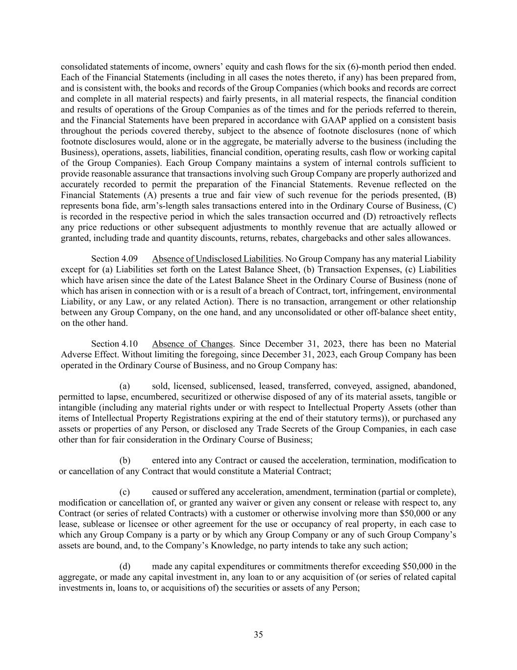 35 consolidated statements of income, owners’ equity and cash flows for the six (6)-month period then ended. Each of the Financial Statements (including in all cases the notes thereto, if any) has been prepared from, and is consistent with, the books and records of the Group Companies (which books and records are correct and complete in all material respects) and fairly presents, in all material respects, the financial condition and results of operations of the Group Companies as of the times and for the periods referred to therein, and the Financial Statements have been prepared in accordance with GAAP applied on a consistent basis throughout the periods covered thereby, subject to the absence of footnote disclosures (none of which footnote disclosures would, alone or in the aggregate, be materially adverse to the business (including the Business), operations, assets, liabilities, financial condition, operating results, cash flow or working capital of the Group Companies). Each Group Company maintains a system of internal controls sufficient to provide reasonable assurance that transactions involving such Group Company are properly authorized and accurately recorded to permit the preparation of the Financial Statements. Revenue reflected on the Financial Statements (A) presents a true and fair view of such revenue for the periods presented, (B) represents bona fide, arm’s-length sales transactions entered into in the Ordinary Course of Business, (C) is recorded in the respective period in which the sales transaction occurred and (D) retroactively reflects any price reductions or other subsequent adjustments to monthly revenue that are actually allowed or granted, including trade and quantity discounts, returns, rebates, chargebacks and other sales allowances. Section 4.09 Absence of Undisclosed Liabilities. No Group Company has any material Liability except for (a) Liabilities set forth on the Latest Balance Sheet, (b) Transaction Expenses, (c) Liabilities which have arisen since the date of the Latest Balance Sheet in the Ordinary Course of Business (none of which has arisen in connection with or is a result of a breach of Contract, tort, infringement, environmental Liability, or any Law, or any related Action). There is no transaction, arrangement or other relationship between any Group Company, on the one hand, and any unconsolidated or other off-balance sheet entity, on the other hand. Section 4.10 Absence of Changes. Since December 31, 2023, there has been no Material Adverse Effect. Without limiting the foregoing, since December 31, 2023, each Group Company has been operated in the Ordinary Course of Business, and no Group Company has: (a) sold, licensed, sublicensed, leased, transferred, conveyed, assigned, abandoned, permitted to lapse, encumbered, securitized or otherwise disposed of any of its material assets, tangible or intangible (including any material rights under or with respect to Intellectual Property Assets (other than items of Intellectual Property Registrations expiring at the end of their statutory terms)), or purchased any assets or properties of any Person, or disclosed any Trade Secrets of the Group Companies, in each case other than for fair consideration in the Ordinary Course of Business; (b) entered into any Contract or caused the acceleration, termination, modification to or cancellation of any Contract that would constitute a Material Contract; (c) caused or suffered any acceleration, amendment, termination (partial or complete), modification or cancellation of, or granted any waiver or given any consent or release with respect to, any Contract (or series of related Contracts) with a customer or otherwise involving more than $50,000 or any lease, sublease or licensee or other agreement for the use or occupancy of real property, in each case to which any Group Company is a party or by which any Group Company or any of such Group Company’s assets are bound, and, to the Company’s Knowledge, no party intends to take any such action; (d) made any capital expenditures or commitments therefor exceeding $50,000 in the aggregate, or made any capital investment in, any loan to or any acquisition of (or series of related capital investments in, loans to, or acquisitions of) the securities or assets of any Person;
