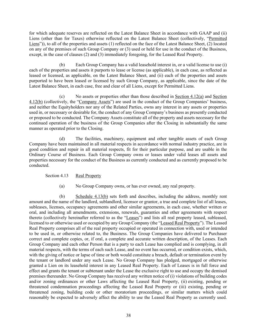 38 for which adequate reserves are reflected on the Latest Balance Sheet in accordance with GAAP and (ii) Liens (other than for Taxes) otherwise reflected on the Latest Balance Sheet (collectively, “Permitted Liens”)), to all of the properties and assets (1) reflected on the face of the Latest Balance Sheet, (2) located on any of the premises of such Group Company or (3) used or held for use in the conduct of the Business, except, in the case of clauses (2) and (3) immediately foregoing, for the Leased Real Property. (b) Each Group Company has a valid leasehold interest in, or a valid license to use (i) each of the properties and assets it purports to lease or license (as applicable), in each case, as reflected as leased or licensed, as applicable, on the Latest Balance Sheet, and (ii) each of the properties and assets purported to have been leased or licensed by such Group Company, as applicable, since the date of the Latest Balance Sheet, in each case, free and clear of all Liens, except for Permitted Liens. (c) No assets or properties other than those described in Section 4.12(a) and Section 4.12(b) (collectively, the “Company Assets”) are used in the conduct of the Group Companies’ business, and neither the Equityholders nor any of the Related Parties, owns any interest in any assets or properties used in, or necessary or desirable for, the conduct of any Group Company’s business as presently conducted or proposed to be conducted. The Company Assets constitute all of the property and assets necessary for the continued operation of the business of the Group Companies after the Closing in substantially the same manner as operated prior to the Closing. (d) The facilities, machinery, equipment and other tangible assets of each Group Company have been maintained in all material respects in accordance with normal industry practice, are in good condition and repair in all material respects, fit for their particular purpose, and are usable in the Ordinary Course of Business. Each Group Company owns or leases under valid leases all assets and properties necessary for the conduct of the Business as currently conducted and as currently proposed to be conducted. Section 4.13 Real Property (a) No Group Company owns, or has ever owned, any real property. (b) Schedule 4.13(b) sets forth and describes, including the address, monthly rent amount and the name of the landlord, sublandlord, licensor or grantor, a true and complete list of all leases, subleases, licenses, occupancy agreements and other similar agreements, in each case, whether written or oral, and including all amendments, extensions, renewals, guaranties and other agreements with respect thereto (collectively hereinafter referred to as the “Leases”) and lists all real property leased, subleased, licensed to or otherwise used or occupied by any Group Company (the “Leased Real Property”). The Leased Real Property comprises all of the real property occupied or operated in connection with, used or intended to be used in, or otherwise related to, the Business. The Group Companies have delivered to Purchaser correct and complete copies, or, if oral, a complete and accurate written description, of the Leases. Each Group Company and each other Person that is a party to each Lease has complied and is complying, in all material respects, with the terms of each such Lease, and no event has occurred, or condition exists, which, with the giving of notice or lapse of time or both would constitute a breach, default or termination event by the tenant or landlord under any such Lease. No Group Company has pledged, mortgaged or otherwise granted a Lien on its leasehold interest in any Leased Real Property. Each of Leases is in full force and effect and grants the tenant or subtenant under the Lease the exclusive right to use and occupy the demised premises thereunder. No Group Company has received any written notice of (i) violations of building codes and/or zoning ordinances or other Laws affecting the Leased Real Property, (ii) existing, pending or threatened condemnation proceedings affecting the Leased Real Property or (iii) existing, pending or threatened zoning, building code or other moratorium proceedings, or similar matters which could reasonably be expected to adversely affect the ability to use the Leased Real Property as currently used.