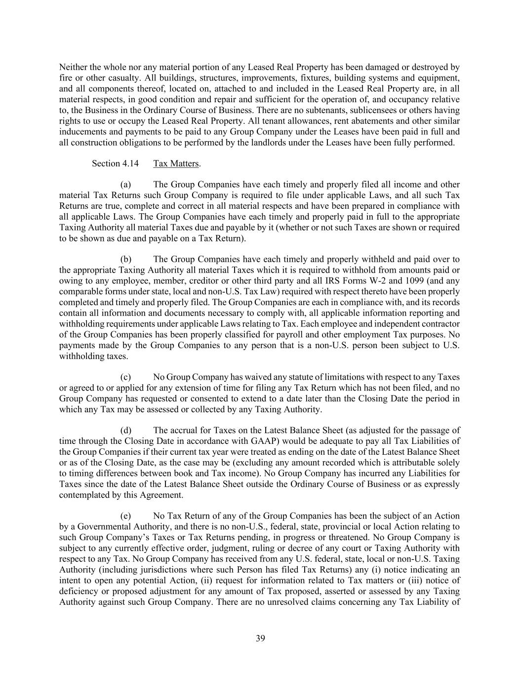 39 Neither the whole nor any material portion of any Leased Real Property has been damaged or destroyed by fire or other casualty. All buildings, structures, improvements, fixtures, building systems and equipment, and all components thereof, located on, attached to and included in the Leased Real Property are, in all material respects, in good condition and repair and sufficient for the operation of, and occupancy relative to, the Business in the Ordinary Course of Business. There are no subtenants, sublicensees or others having rights to use or occupy the Leased Real Property. All tenant allowances, rent abatements and other similar inducements and payments to be paid to any Group Company under the Leases have been paid in full and all construction obligations to be performed by the landlords under the Leases have been fully performed. Section 4.14 Tax Matters. (a) The Group Companies have each timely and properly filed all income and other material Tax Returns such Group Company is required to file under applicable Laws, and all such Tax Returns are true, complete and correct in all material respects and have been prepared in compliance with all applicable Laws. The Group Companies have each timely and properly paid in full to the appropriate Taxing Authority all material Taxes due and payable by it (whether or not such Taxes are shown or required to be shown as due and payable on a Tax Return). (b) The Group Companies have each timely and properly withheld and paid over to the appropriate Taxing Authority all material Taxes which it is required to withhold from amounts paid or owing to any employee, member, creditor or other third party and all IRS Forms W-2 and 1099 (and any comparable forms under state, local and non-U.S. Tax Law) required with respect thereto have been properly completed and timely and properly filed. The Group Companies are each in compliance with, and its records contain all information and documents necessary to comply with, all applicable information reporting and withholding requirements under applicable Laws relating to Tax. Each employee and independent contractor of the Group Companies has been properly classified for payroll and other employment Tax purposes. No payments made by the Group Companies to any person that is a non-U.S. person been subject to U.S. withholding taxes. (c) No Group Company has waived any statute of limitations with respect to any Taxes or agreed to or applied for any extension of time for filing any Tax Return which has not been filed, and no Group Company has requested or consented to extend to a date later than the Closing Date the period in which any Tax may be assessed or collected by any Taxing Authority. (d) The accrual for Taxes on the Latest Balance Sheet (as adjusted for the passage of time through the Closing Date in accordance with GAAP) would be adequate to pay all Tax Liabilities of the Group Companies if their current tax year were treated as ending on the date of the Latest Balance Sheet or as of the Closing Date, as the case may be (excluding any amount recorded which is attributable solely to timing differences between book and Tax income). No Group Company has incurred any Liabilities for Taxes since the date of the Latest Balance Sheet outside the Ordinary Course of Business or as expressly contemplated by this Agreement. (e) No Tax Return of any of the Group Companies has been the subject of an Action by a Governmental Authority, and there is no non-U.S., federal, state, provincial or local Action relating to such Group Company’s Taxes or Tax Returns pending, in progress or threatened. No Group Company is subject to any currently effective order, judgment, ruling or decree of any court or Taxing Authority with respect to any Tax. No Group Company has received from any U.S. federal, state, local or non-U.S. Taxing Authority (including jurisdictions where such Person has filed Tax Returns) any (i) notice indicating an intent to open any potential Action, (ii) request for information related to Tax matters or (iii) notice of deficiency or proposed adjustment for any amount of Tax proposed, asserted or assessed by any Taxing Authority against such Group Company. There are no unresolved claims concerning any Tax Liability of