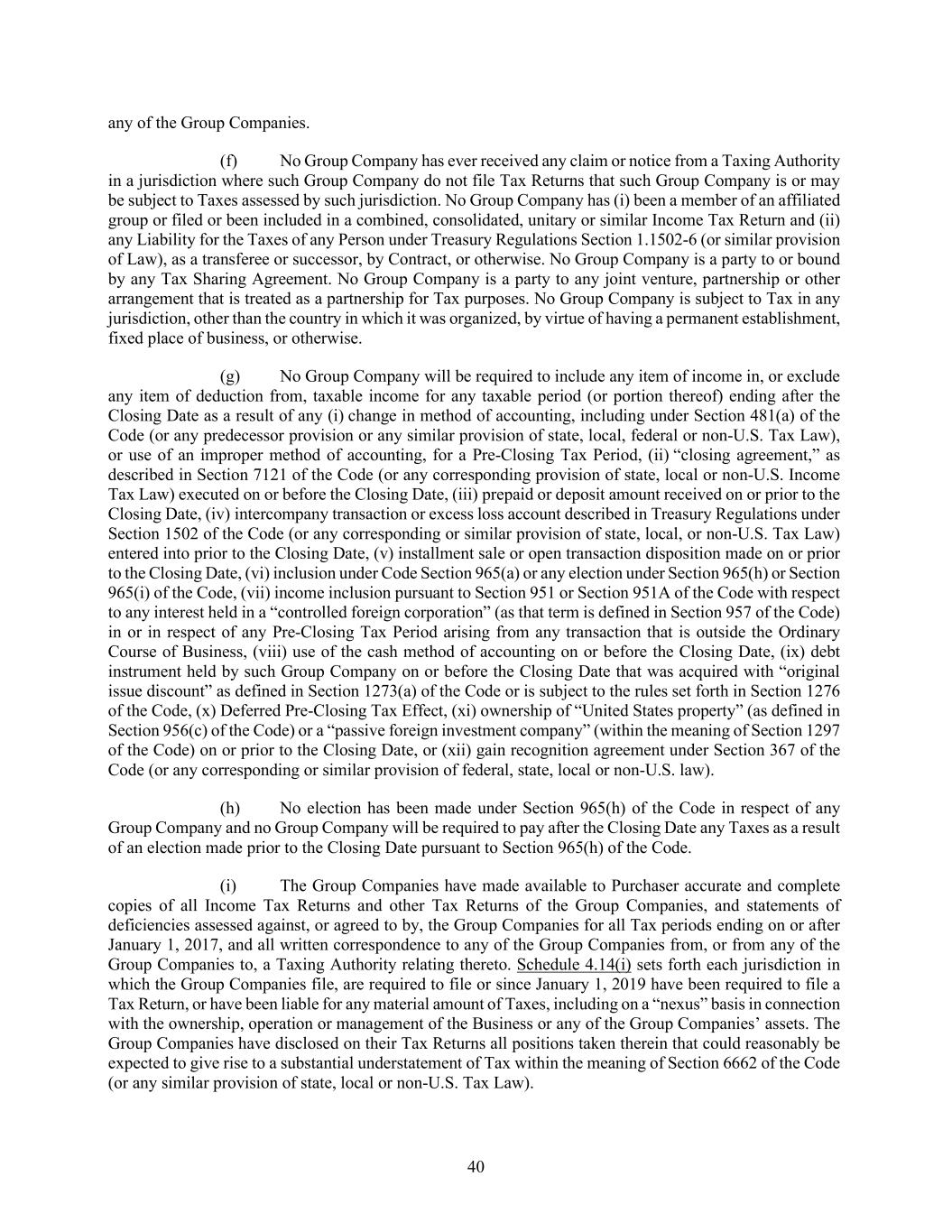 40 any of the Group Companies. (f) No Group Company has ever received any claim or notice from a Taxing Authority in a jurisdiction where such Group Company do not file Tax Returns that such Group Company is or may be subject to Taxes assessed by such jurisdiction. No Group Company has (i) been a member of an affiliated group or filed or been included in a combined, consolidated, unitary or similar Income Tax Return and (ii) any Liability for the Taxes of any Person under Treasury Regulations Section 1.1502-6 (or similar provision of Law), as a transferee or successor, by Contract, or otherwise. No Group Company is a party to or bound by any Tax Sharing Agreement. No Group Company is a party to any joint venture, partnership or other arrangement that is treated as a partnership for Tax purposes. No Group Company is subject to Tax in any jurisdiction, other than the country in which it was organized, by virtue of having a permanent establishment, fixed place of business, or otherwise. (g) No Group Company will be required to include any item of income in, or exclude any item of deduction from, taxable income for any taxable period (or portion thereof) ending after the Closing Date as a result of any (i) change in method of accounting, including under Section 481(a) of the Code (or any predecessor provision or any similar provision of state, local, federal or non-U.S. Tax Law), or use of an improper method of accounting, for a Pre-Closing Tax Period, (ii) “closing agreement,” as described in Section 7121 of the Code (or any corresponding provision of state, local or non-U.S. Income Tax Law) executed on or before the Closing Date, (iii) prepaid or deposit amount received on or prior to the Closing Date, (iv) intercompany transaction or excess loss account described in Treasury Regulations under Section 1502 of the Code (or any corresponding or similar provision of state, local, or non-U.S. Tax Law) entered into prior to the Closing Date, (v) installment sale or open transaction disposition made on or prior to the Closing Date, (vi) inclusion under Code Section 965(a) or any election under Section 965(h) or Section 965(i) of the Code, (vii) income inclusion pursuant to Section 951 or Section 951A of the Code with respect to any interest held in a “controlled foreign corporation” (as that term is defined in Section 957 of the Code) in or in respect of any Pre-Closing Tax Period arising from any transaction that is outside the Ordinary Course of Business, (viii) use of the cash method of accounting on or before the Closing Date, (ix) debt instrument held by such Group Company on or before the Closing Date that was acquired with “original issue discount” as defined in Section 1273(a) of the Code or is subject to the rules set forth in Section 1276 of the Code, (x) Deferred Pre-Closing Tax Effect, (xi) ownership of “United States property” (as defined in Section 956(c) of the Code) or a “passive foreign investment company” (within the meaning of Section 1297 of the Code) on or prior to the Closing Date, or (xii) gain recognition agreement under Section 367 of the Code (or any corresponding or similar provision of federal, state, local or non-U.S. law). (h) No election has been made under Section 965(h) of the Code in respect of any Group Company and no Group Company will be required to pay after the Closing Date any Taxes as a result of an election made prior to the Closing Date pursuant to Section 965(h) of the Code. (i) The Group Companies have made available to Purchaser accurate and complete copies of all Income Tax Returns and other Tax Returns of the Group Companies, and statements of deficiencies assessed against, or agreed to by, the Group Companies for all Tax periods ending on or after January 1, 2017, and all written correspondence to any of the Group Companies from, or from any of the Group Companies to, a Taxing Authority relating thereto. Schedule 4.14(i) sets forth each jurisdiction in which the Group Companies file, are required to file or since January 1, 2019 have been required to file a Tax Return, or have been liable for any material amount of Taxes, including on a “nexus” basis in connection with the ownership, operation or management of the Business or any of the Group Companies’ assets. The Group Companies have disclosed on their Tax Returns all positions taken therein that could reasonably be expected to give rise to a substantial understatement of Tax within the meaning of Section 6662 of the Code (or any similar provision of state, local or non-U.S. Tax Law).