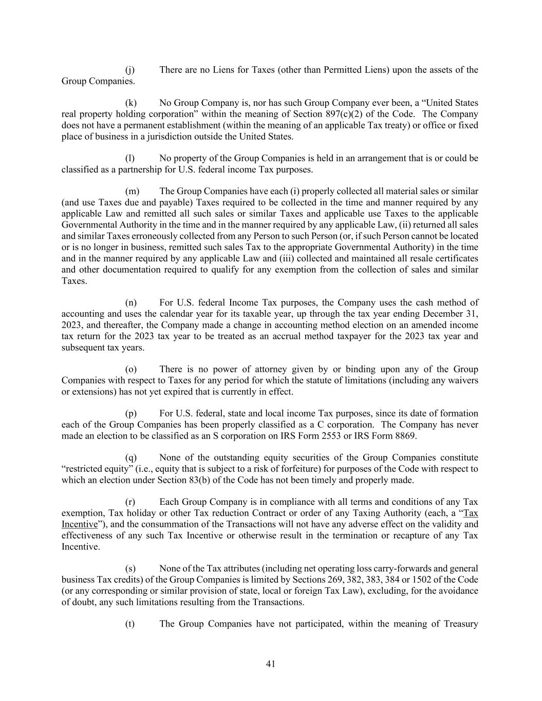 41 (j) There are no Liens for Taxes (other than Permitted Liens) upon the assets of the Group Companies. (k) No Group Company is, nor has such Group Company ever been, a “United States real property holding corporation” within the meaning of Section 897(c)(2) of the Code. The Company does not have a permanent establishment (within the meaning of an applicable Tax treaty) or office or fixed place of business in a jurisdiction outside the United States. (l) No property of the Group Companies is held in an arrangement that is or could be classified as a partnership for U.S. federal income Tax purposes. (m) The Group Companies have each (i) properly collected all material sales or similar (and use Taxes due and payable) Taxes required to be collected in the time and manner required by any applicable Law and remitted all such sales or similar Taxes and applicable use Taxes to the applicable Governmental Authority in the time and in the manner required by any applicable Law, (ii) returned all sales and similar Taxes erroneously collected from any Person to such Person (or, if such Person cannot be located or is no longer in business, remitted such sales Tax to the appropriate Governmental Authority) in the time and in the manner required by any applicable Law and (iii) collected and maintained all resale certificates and other documentation required to qualify for any exemption from the collection of sales and similar Taxes. (n) For U.S. federal Income Tax purposes, the Company uses the cash method of accounting and uses the calendar year for its taxable year, up through the tax year ending December 31, 2023, and thereafter, the Company made a change in accounting method election on an amended income tax return for the 2023 tax year to be treated as an accrual method taxpayer for the 2023 tax year and subsequent tax years. (o) There is no power of attorney given by or binding upon any of the Group Companies with respect to Taxes for any period for which the statute of limitations (including any waivers or extensions) has not yet expired that is currently in effect. (p) For U.S. federal, state and local income Tax purposes, since its date of formation each of the Group Companies has been properly classified as a C corporation. The Company has never made an election to be classified as an S corporation on IRS Form 2553 or IRS Form 8869. (q) None of the outstanding equity securities of the Group Companies constitute “restricted equity” (i.e., equity that is subject to a risk of forfeiture) for purposes of the Code with respect to which an election under Section 83(b) of the Code has not been timely and properly made. (r) Each Group Company is in compliance with all terms and conditions of any Tax exemption, Tax holiday or other Tax reduction Contract or order of any Taxing Authority (each, a “Tax Incentive”), and the consummation of the Transactions will not have any adverse effect on the validity and effectiveness of any such Tax Incentive or otherwise result in the termination or recapture of any Tax Incentive. (s) None of the Tax attributes (including net operating loss carry-forwards and general business Tax credits) of the Group Companies is limited by Sections 269, 382, 383, 384 or 1502 of the Code (or any corresponding or similar provision of state, local or foreign Tax Law), excluding, for the avoidance of doubt, any such limitations resulting from the Transactions. (t) The Group Companies have not participated, within the meaning of Treasury
