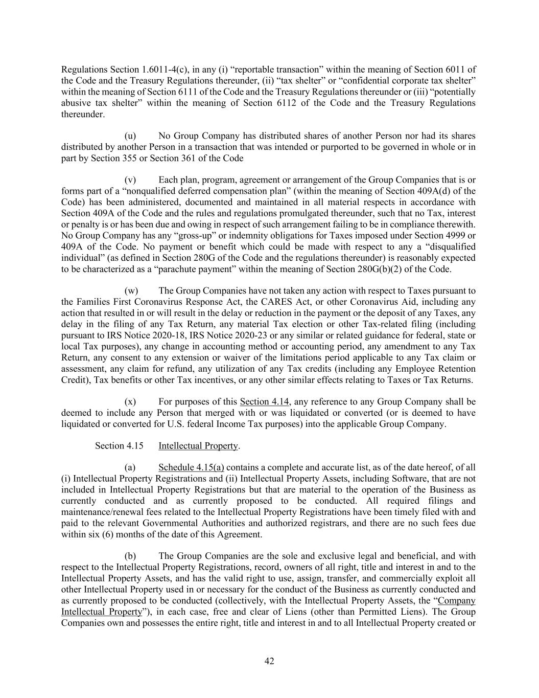 42 Regulations Section 1.6011-4(c), in any (i) “reportable transaction” within the meaning of Section 6011 of the Code and the Treasury Regulations thereunder, (ii) “tax shelter” or “confidential corporate tax shelter” within the meaning of Section 6111 of the Code and the Treasury Regulations thereunder or (iii) “potentially abusive tax shelter” within the meaning of Section 6112 of the Code and the Treasury Regulations thereunder. (u) No Group Company has distributed shares of another Person nor had its shares distributed by another Person in a transaction that was intended or purported to be governed in whole or in part by Section 355 or Section 361 of the Code (v) Each plan, program, agreement or arrangement of the Group Companies that is or forms part of a “nonqualified deferred compensation plan” (within the meaning of Section 409A(d) of the Code) has been administered, documented and maintained in all material respects in accordance with Section 409A of the Code and the rules and regulations promulgated thereunder, such that no Tax, interest or penalty is or has been due and owing in respect of such arrangement failing to be in compliance therewith. No Group Company has any “gross-up” or indemnity obligations for Taxes imposed under Section 4999 or 409A of the Code. No payment or benefit which could be made with respect to any a “disqualified individual” (as defined in Section 280G of the Code and the regulations thereunder) is reasonably expected to be characterized as a “parachute payment” within the meaning of Section 280G(b)(2) of the Code. (w) The Group Companies have not taken any action with respect to Taxes pursuant to the Families First Coronavirus Response Act, the CARES Act, or other Coronavirus Aid, including any action that resulted in or will result in the delay or reduction in the payment or the deposit of any Taxes, any delay in the filing of any Tax Return, any material Tax election or other Tax-related filing (including pursuant to IRS Notice 2020-18, IRS Notice 2020-23 or any similar or related guidance for federal, state or local Tax purposes), any change in accounting method or accounting period, any amendment to any Tax Return, any consent to any extension or waiver of the limitations period applicable to any Tax claim or assessment, any claim for refund, any utilization of any Tax credits (including any Employee Retention Credit), Tax benefits or other Tax incentives, or any other similar effects relating to Taxes or Tax Returns. (x) For purposes of this Section 4.14, any reference to any Group Company shall be deemed to include any Person that merged with or was liquidated or converted (or is deemed to have liquidated or converted for U.S. federal Income Tax purposes) into the applicable Group Company. Section 4.15 Intellectual Property. (a) Schedule 4.15(a) contains a complete and accurate list, as of the date hereof, of all (i) Intellectual Property Registrations and (ii) Intellectual Property Assets, including Software, that are not included in Intellectual Property Registrations but that are material to the operation of the Business as currently conducted and as currently proposed to be conducted. All required filings and maintenance/renewal fees related to the Intellectual Property Registrations have been timely filed with and paid to the relevant Governmental Authorities and authorized registrars, and there are no such fees due within six (6) months of the date of this Agreement. (b) The Group Companies are the sole and exclusive legal and beneficial, and with respect to the Intellectual Property Registrations, record, owners of all right, title and interest in and to the Intellectual Property Assets, and has the valid right to use, assign, transfer, and commercially exploit all other Intellectual Property used in or necessary for the conduct of the Business as currently conducted and as currently proposed to be conducted (collectively, with the Intellectual Property Assets, the “Company Intellectual Property”), in each case, free and clear of Liens (other than Permitted Liens). The Group Companies own and possesses the entire right, title and interest in and to all Intellectual Property created or