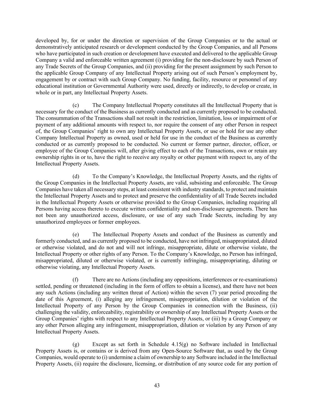 43 developed by, for or under the direction or supervision of the Group Companies or to the actual or demonstratively anticipated research or development conducted by the Group Companies, and all Persons who have participated in such creation or development have executed and delivered to the applicable Group Company a valid and enforceable written agreement (i) providing for the non-disclosure by such Person of any Trade Secrets of the Group Companies, and (ii) providing for the present assignment by such Person to the applicable Group Company of any Intellectual Property arising out of such Person’s employment by, engagement by or contract with such Group Company. No funding, facility, resource or personnel of any educational institution or Governmental Authority were used, directly or indirectly, to develop or create, in whole or in part, any Intellectual Property Assets. (c) The Company Intellectual Property constitutes all the Intellectual Property that is necessary for the conduct of the Business as currently conducted and as currently proposed to be conducted. The consummation of the Transactions shall not result in the restriction, limitation, loss or impairment of or payment of any additional amounts with respect to, nor require the consent of any other Person in respect of, the Group Companies’ right to own any Intellectual Property Assets, or use or hold for use any other Company Intellectual Property as owned, used or held for use in the conduct of the Business as currently conducted or as currently proposed to be conducted. No current or former partner, director, officer, or employee of the Group Companies will, after giving effect to each of the Transactions, own or retain any ownership rights in or to, have the right to receive any royalty or other payment with respect to, any of the Intellectual Property Assets. (d) To the Company’s Knowledge, the Intellectual Property Assets, and the rights of the Group Companies in the Intellectual Property Assets, are valid, subsisting and enforceable. The Group Companies have taken all necessary steps, at least consistent with industry standards, to protect and maintain the Intellectual Property Assets and to protect and preserve the confidentiality of all Trade Secrets included in the Intellectual Property Assets or otherwise provided to the Group Companies, including requiring all Persons having access thereto to execute written confidentiality and non-disclosure agreements. There has not been any unauthorized access, disclosure, or use of any such Trade Secrets, including by any unauthorized employees or former employees. (e) The Intellectual Property Assets and conduct of the Business as currently and formerly conducted, and as currently proposed to be conducted, have not infringed, misappropriated, diluted or otherwise violated, and do not and will not infringe, misappropriate, dilute or otherwise violate, the Intellectual Property or other rights of any Person. To the Company’s Knowledge, no Person has infringed, misappropriated, diluted or otherwise violated, or is currently infringing, misappropriating, diluting or otherwise violating, any Intellectual Property Assets. (f) There are no Actions (including any oppositions, interferences or re-examinations) settled, pending or threatened (including in the form of offers to obtain a license), and there have not been any such Actions (including any written threat of Action) within the seven (7) year period preceding the date of this Agreement, (i) alleging any infringement, misappropriation, dilution or violation of the Intellectual Property of any Person by the Group Companies in connection with the Business, (ii) challenging the validity, enforceability, registrability or ownership of any Intellectual Property Assets or the Group Companies’ rights with respect to any Intellectual Property Assets, or (iii) by a Group Company or any other Person alleging any infringement, misappropriation, dilution or violation by any Person of any Intellectual Property Assets. (g) Except as set forth in Schedule 4.15(g) no Software included in Intellectual Property Assets is, or contains or is derived from any Open-Source Software that, as used by the Group Companies, would operate to (i) undermine a claim of ownership to any Software included in the Intellectual Property Assets, (ii) require the disclosure, licensing, or distribution of any source code for any portion of