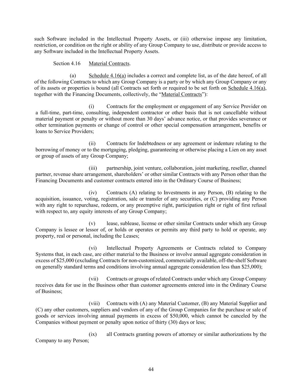 44 such Software included in the Intellectual Property Assets, or (iii) otherwise impose any limitation, restriction, or condition on the right or ability of any Group Company to use, distribute or provide access to any Software included in the Intellectual Property Assets. Section 4.16 Material Contracts. (a) Schedule 4.16(a) includes a correct and complete list, as of the date hereof, of all of the following Contracts to which any Group Company is a party or by which any Group Company or any of its assets or properties is bound (all Contracts set forth or required to be set forth on Schedule 4.16(a), together with the Financing Documents, collectively, the “Material Contracts”): (i) Contracts for the employment or engagement of any Service Provider on a full-time, part-time, consulting, independent contractor or other basis that is not cancellable without material payment or penalty or without more than 30 days’ advance notice, or that provides severance or other termination payments or change of control or other special compensation arrangement, benefits or loans to Service Providers; (ii) Contracts for Indebtedness or any agreement or indenture relating to the borrowing of money or to the mortgaging, pledging, guaranteeing or otherwise placing a Lien on any asset or group of assets of any Group Company; (iii) partnership, joint venture, collaboration, joint marketing, reseller, channel partner, revenue share arrangement, shareholders’ or other similar Contracts with any Person other than the Financing Documents and customer contracts entered into in the Ordinary Course of Business; (iv) Contracts (A) relating to Investments in any Person, (B) relating to the acquisition, issuance, voting, registration, sale or transfer of any securities, or (C) providing any Person with any right to repurchase, redeem, or any preemptive right, participation right or right of first refusal with respect to, any equity interests of any Group Company; (v) lease, sublease, license or other similar Contracts under which any Group Company is lessee or lessor of, or holds or operates or permits any third party to hold or operate, any property, real or personal, including the Leases; (vi) Intellectual Property Agreements or Contracts related to Company Systems that, in each case, are either material to the Business or involve annual aggregate consideration in excess of $25,000 (excluding Contracts for non-customized, commercially available, off-the-shelf Software on generally standard terms and conditions involving annual aggregate consideration less than $25,000); (vii) Contracts or groups of related Contracts under which any Group Company receives data for use in the Business other than customer agreements entered into in the Ordinary Course of Business; (viii) Contracts with (A) any Material Customer, (B) any Material Supplier and (C) any other customers, suppliers and vendors of any of the Group Companies for the purchase or sale of goods or services involving annual payments in excess of $50,000, which cannot be canceled by the Companies without payment or penalty upon notice of thirty (30) days or less; (ix) all Contracts granting powers of attorney or similar authorizations by the Company to any Person;