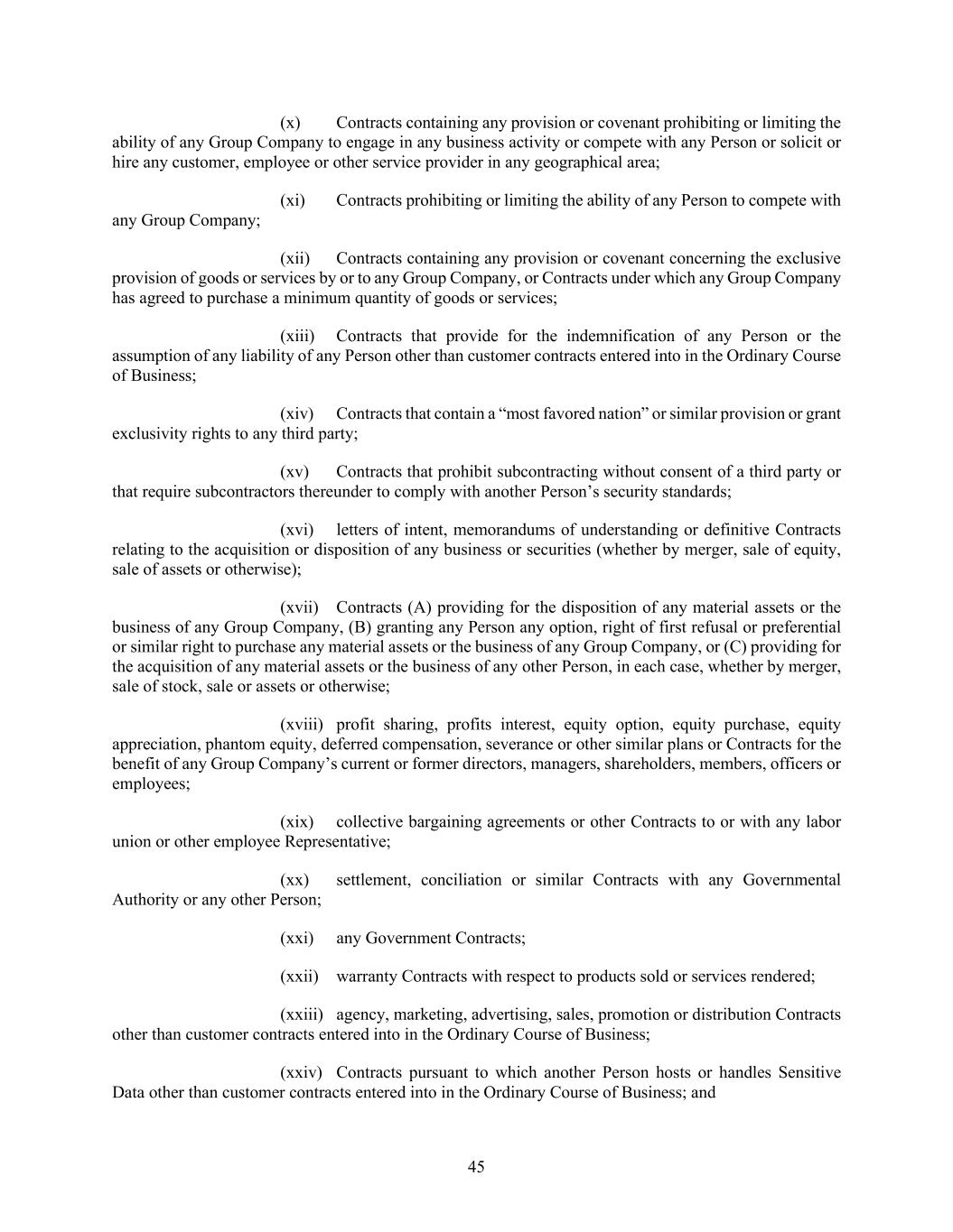 45 (x) Contracts containing any provision or covenant prohibiting or limiting the ability of any Group Company to engage in any business activity or compete with any Person or solicit or hire any customer, employee or other service provider in any geographical area; (xi) Contracts prohibiting or limiting the ability of any Person to compete with any Group Company; (xii) Contracts containing any provision or covenant concerning the exclusive provision of goods or services by or to any Group Company, or Contracts under which any Group Company has agreed to purchase a minimum quantity of goods or services; (xiii) Contracts that provide for the indemnification of any Person or the assumption of any liability of any Person other than customer contracts entered into in the Ordinary Course of Business; (xiv) Contracts that contain a “most favored nation” or similar provision or grant exclusivity rights to any third party; (xv) Contracts that prohibit subcontracting without consent of a third party or that require subcontractors thereunder to comply with another Person’s security standards; (xvi) letters of intent, memorandums of understanding or definitive Contracts relating to the acquisition or disposition of any business or securities (whether by merger, sale of equity, sale of assets or otherwise); (xvii) Contracts (A) providing for the disposition of any material assets or the business of any Group Company, (B) granting any Person any option, right of first refusal or preferential or similar right to purchase any material assets or the business of any Group Company, or (C) providing for the acquisition of any material assets or the business of any other Person, in each case, whether by merger, sale of stock, sale or assets or otherwise; (xviii) profit sharing, profits interest, equity option, equity purchase, equity appreciation, phantom equity, deferred compensation, severance or other similar plans or Contracts for the benefit of any Group Company’s current or former directors, managers, shareholders, members, officers or employees; (xix) collective bargaining agreements or other Contracts to or with any labor union or other employee Representative; (xx) settlement, conciliation or similar Contracts with any Governmental Authority or any other Person; (xxi) any Government Contracts; (xxii) warranty Contracts with respect to products sold or services rendered; (xxiii) agency, marketing, advertising, sales, promotion or distribution Contracts other than customer contracts entered into in the Ordinary Course of Business; (xxiv) Contracts pursuant to which another Person hosts or handles Sensitive Data other than customer contracts entered into in the Ordinary Course of Business; and